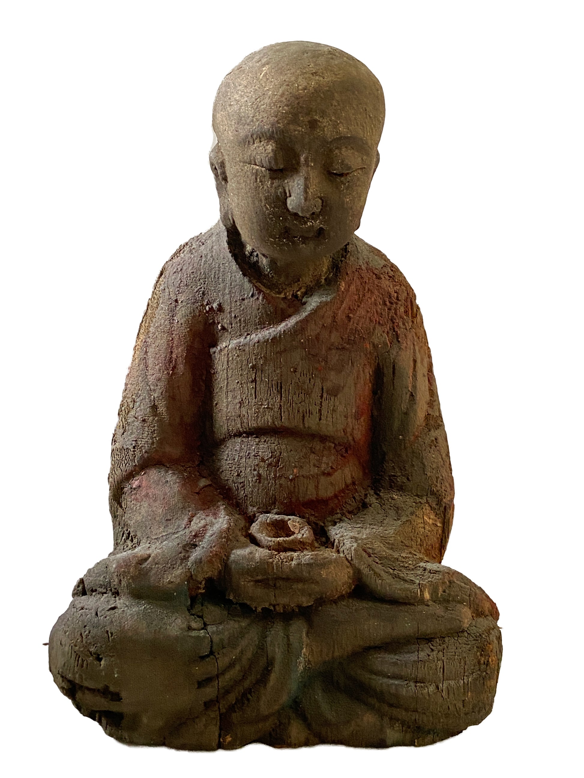 Superb Crafted from one piece of wood, this Superb Medicine Crowned Lord Buddha sculpture portrays the Buddha of healing and medicine in Mahāyāna Buddhism. The Buddha holds a round bowl in his hands and shows minor wear and losses. It measures 9" high by 6" wide by 3.5 deep.
