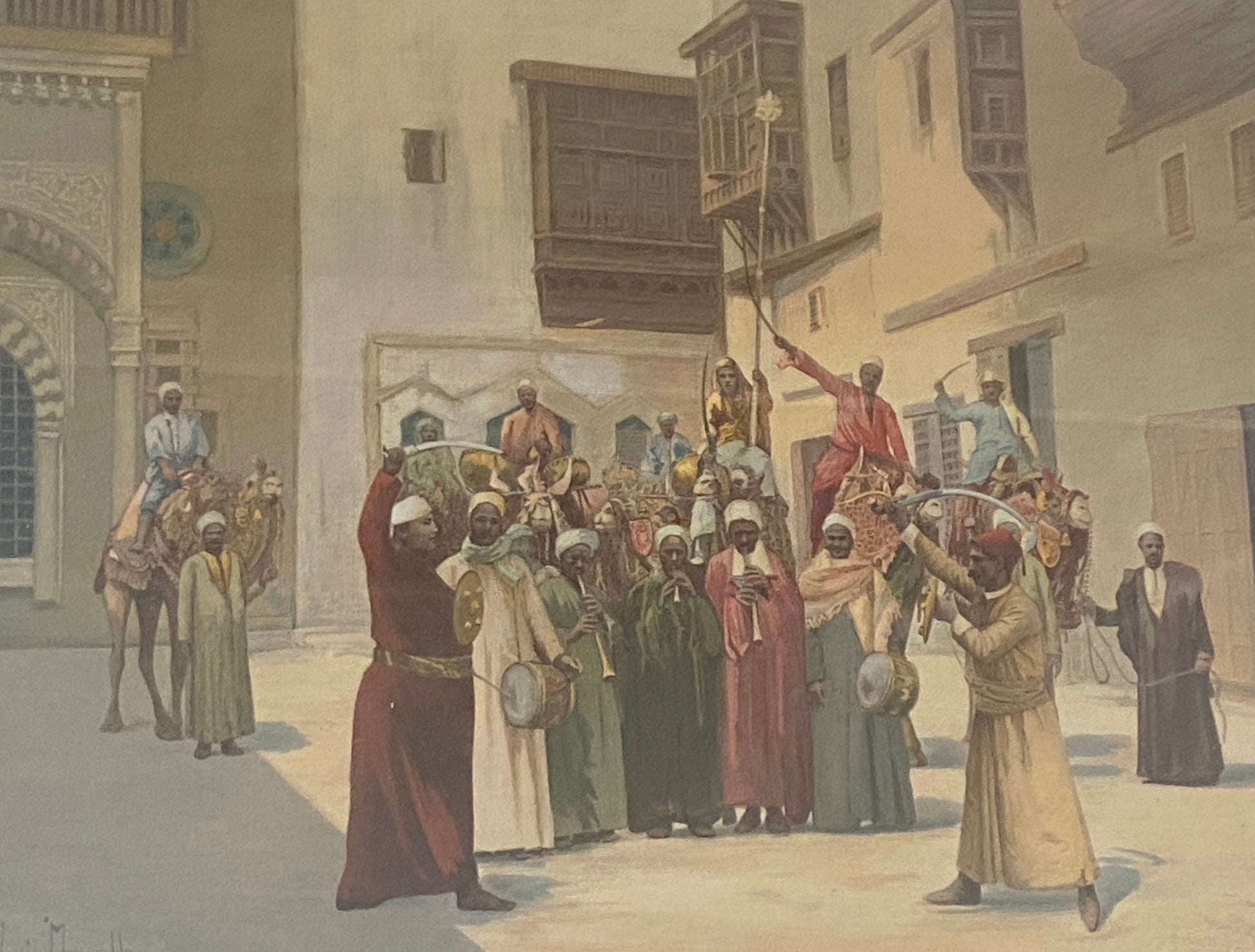 This exquisite Orientalist picture print by Meynelle Louis captures a dynamic scene of traditional performance, complete with sword dancers, musicians, and camels rendered in authentic period style. Housed in a white frame, the piece measures 21 inches wide by 17.25 inches tall with a 1.25-inch depth.