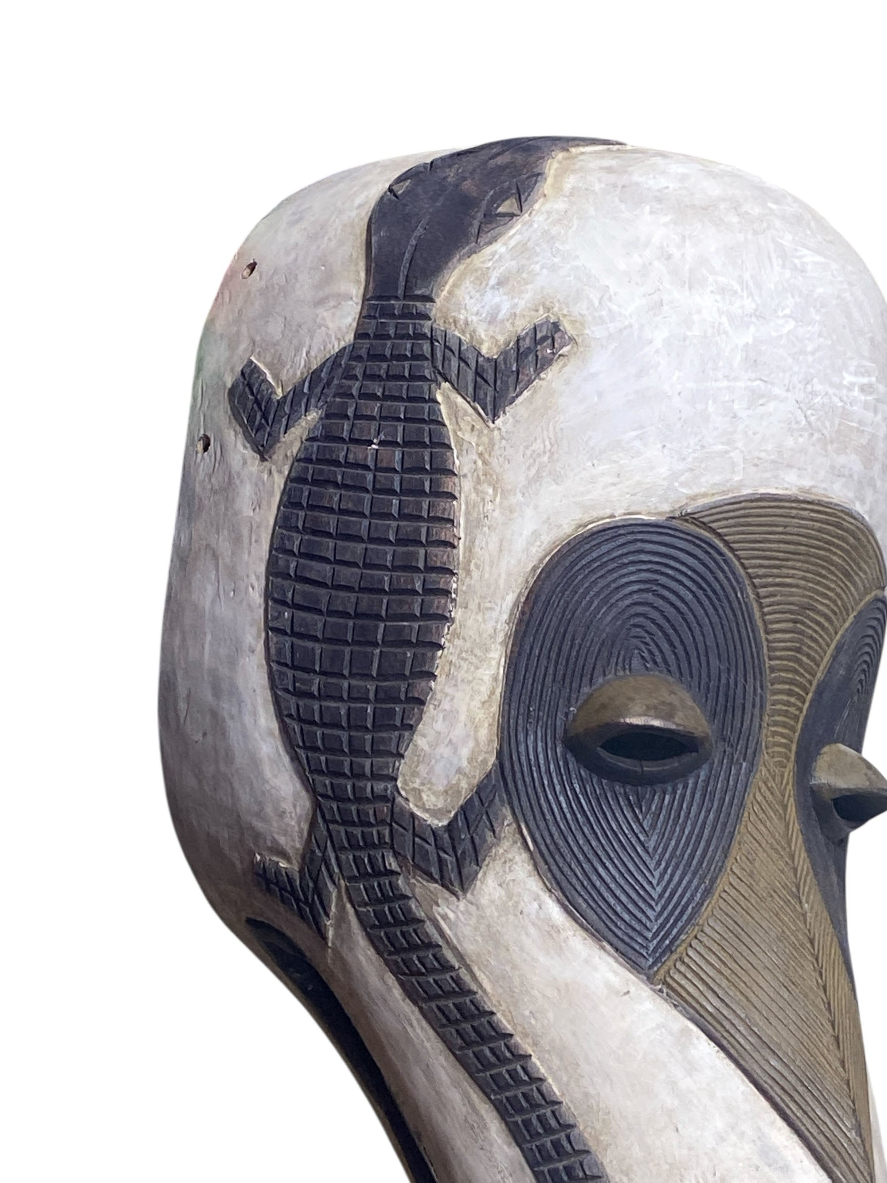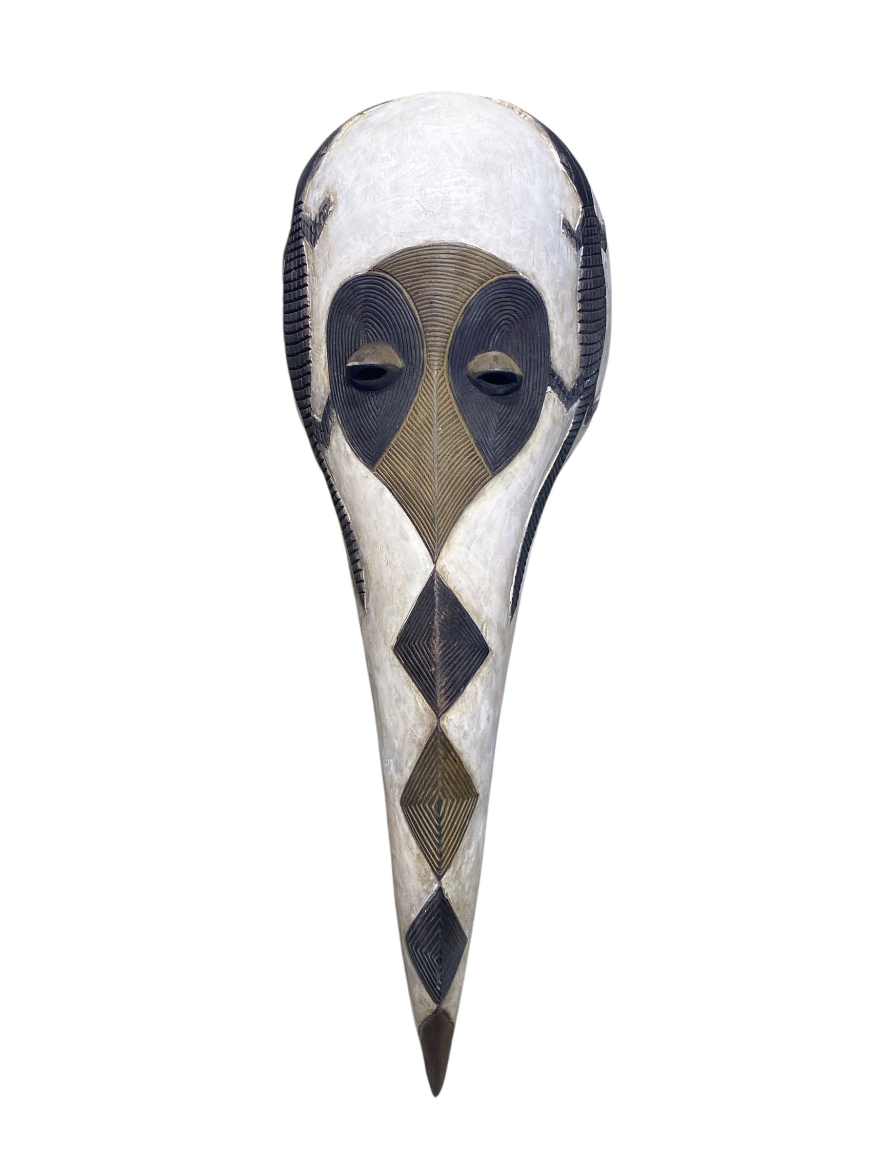 This impressive rare find Dan bird mask from Liberia stands 41" tall by 15" w by 9.5" D and showcases the skilled craftsmanship of the Dan people. Featuring an elongated face, high forehead, and a central ridge, it symbolizes female spirits associated with spiritual power and protection. Used in Poro society ceremonies, the mask is central to rituals that protect the community and promote prosperity. Detailed with symbolic elements such as crocodile guardians, sacred ancestral animals, and diamond scarification patterns, it embodies the rich cultural heritage and intricate social systems of the Dan.