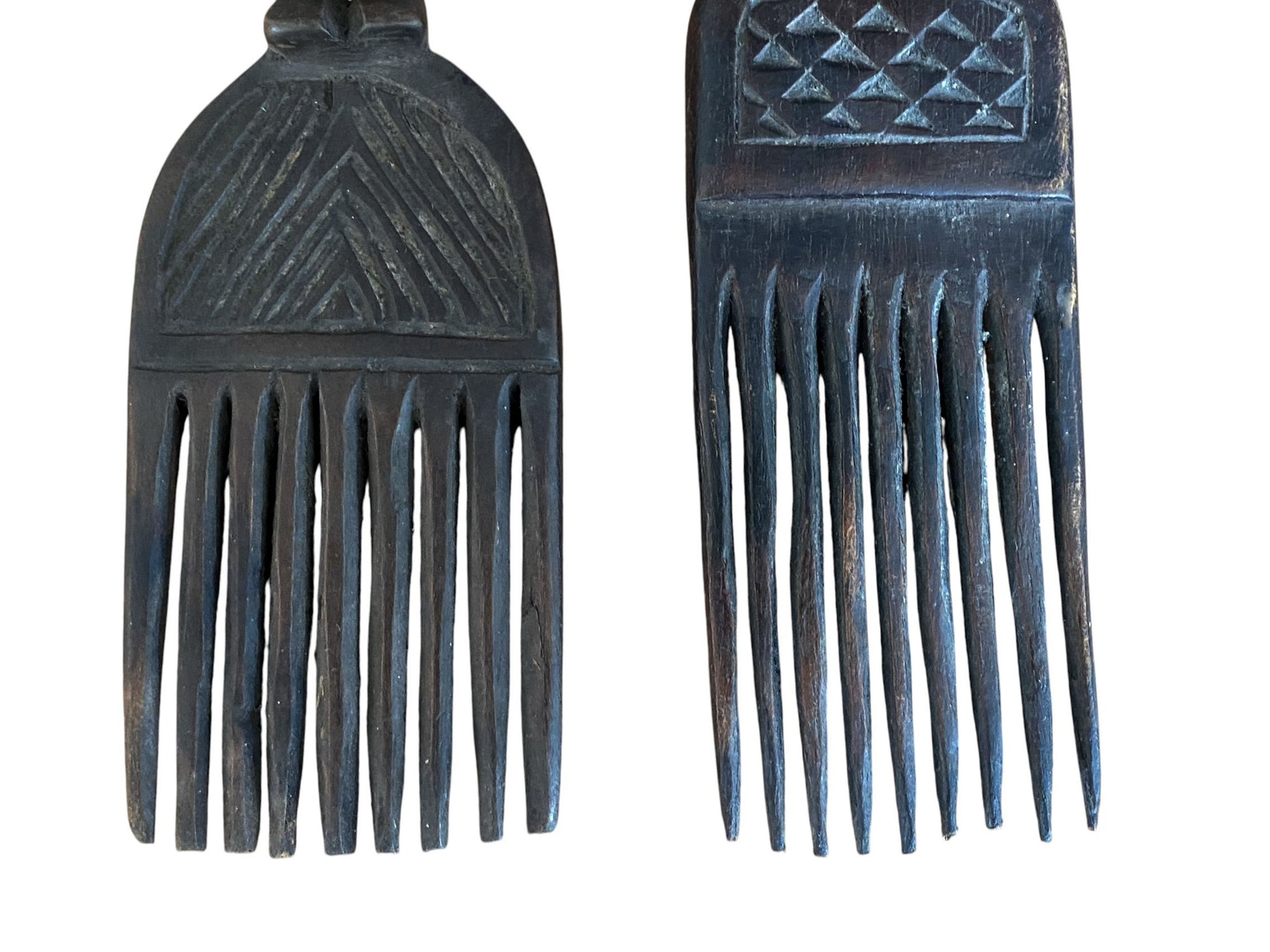 The Hemba Wedding wooden combs from Congo feature a couple and are traditionally used as esteemed bridal ornaments exhibited in homes. These combs exemplify the skilled craftsmanship and rich cultural legacy of the Hemba people. Expertly carved, they display detailed patterns that reflect the unique artistic styles of the region. More than functional items, these combs carry ceremonial importance, representing beauty and marital traditions within Hemba culture. Each comb is a distinctive work of art, offering insight into Congo’s indigenous ceremonial practices and artistry. Dimensions: Height 9.75–8.75 in, Width 2.25 in, Depth 1 in.