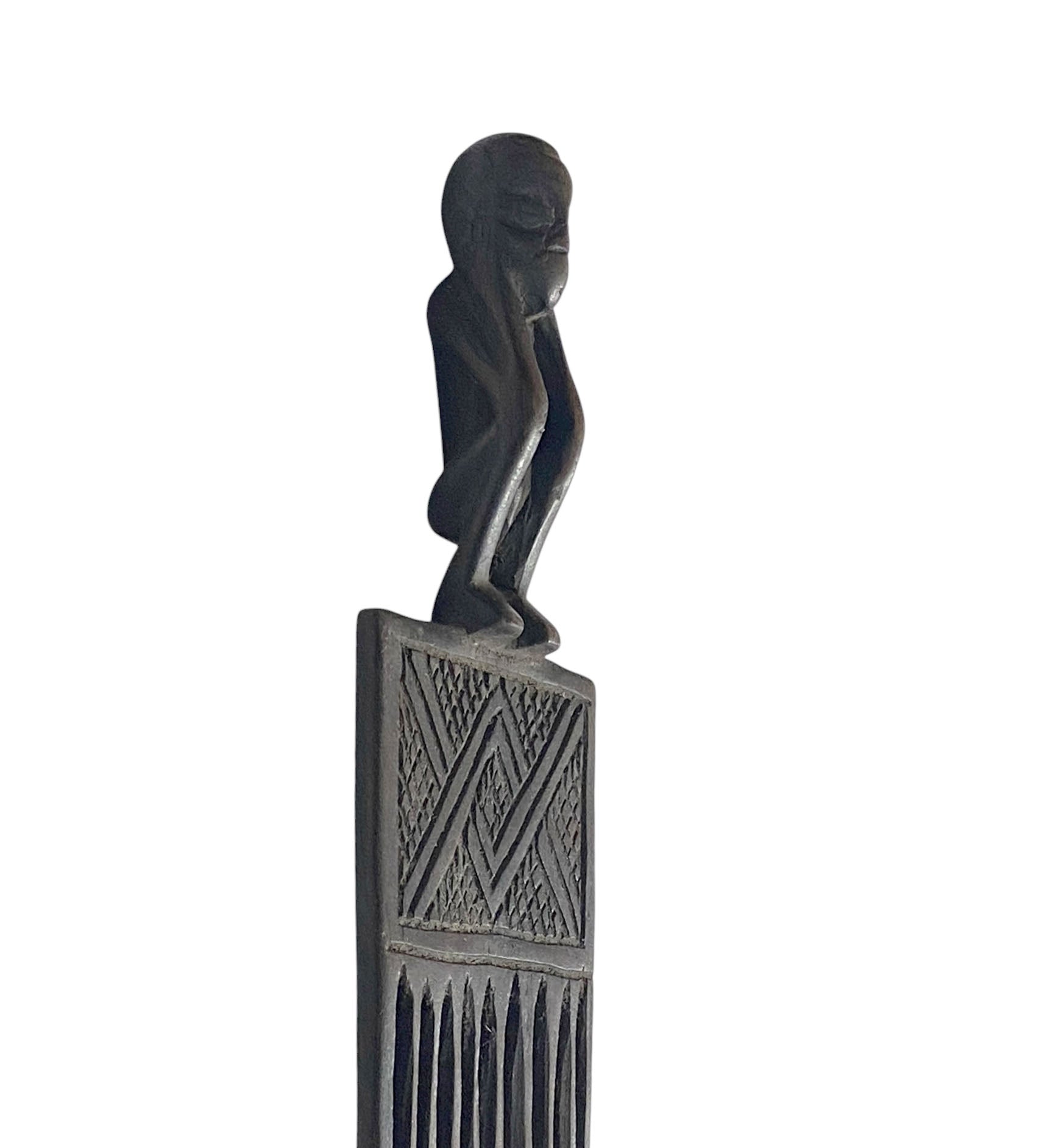 The Hemba Wedding wooden comb from Congo feature a seating Figure and is traditionally used as esteemed bridal ornaments exhibited in homes. The comb exemplify the skilled craftsmanship and rich cultural legacy of the Hemba people. Expertly carved, they display detailed patterns that reflect the unique artistic styles of the region. More than functional items, it carry ceremonial importance, representing beauty and marital traditions within Hemba culture. Each comb is a distinctive work of art, offering insight into Congo’s indigenous ceremonial practices and artistry. Dimensions: Height 8.5"h by 2.75"w by 1" D