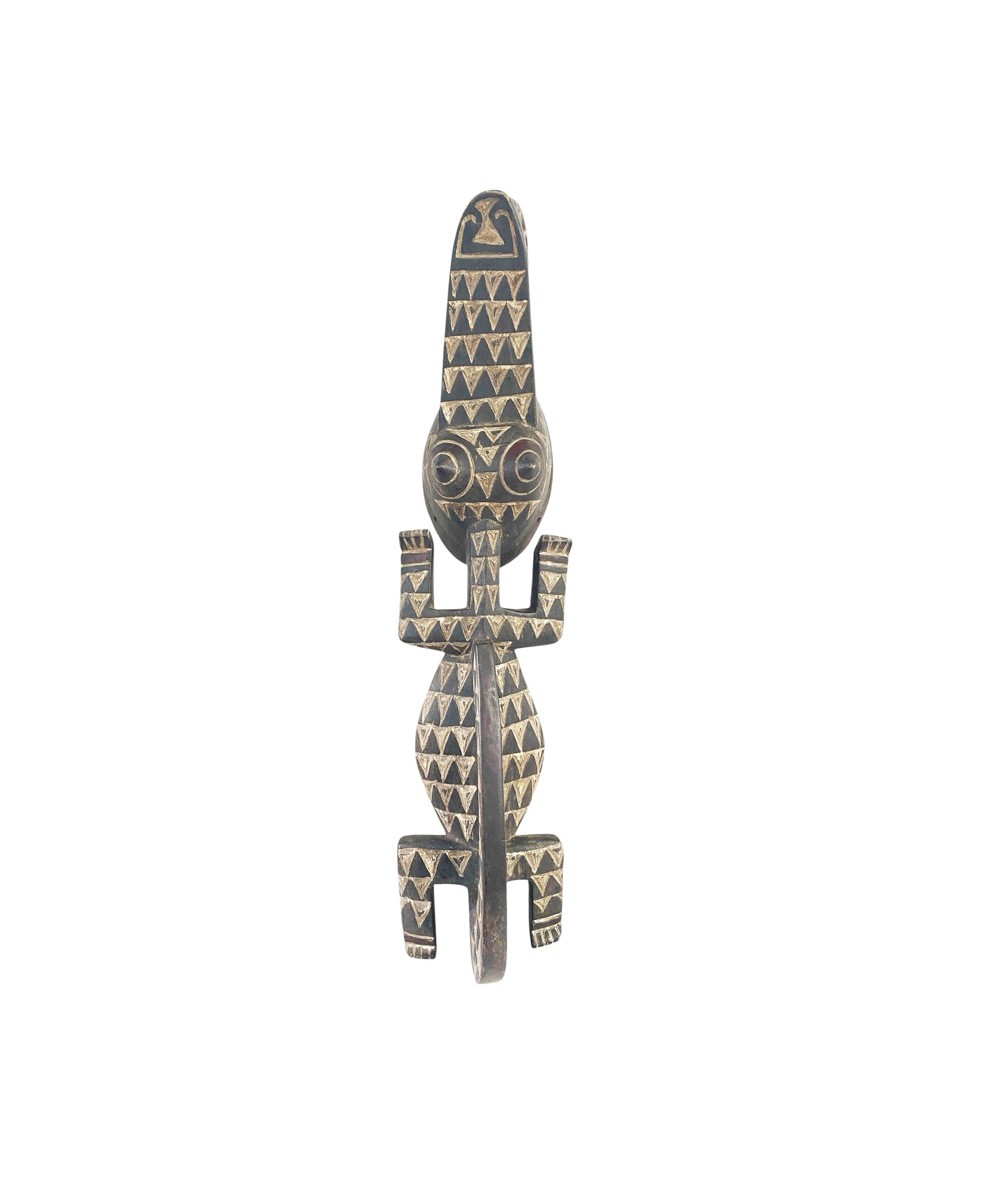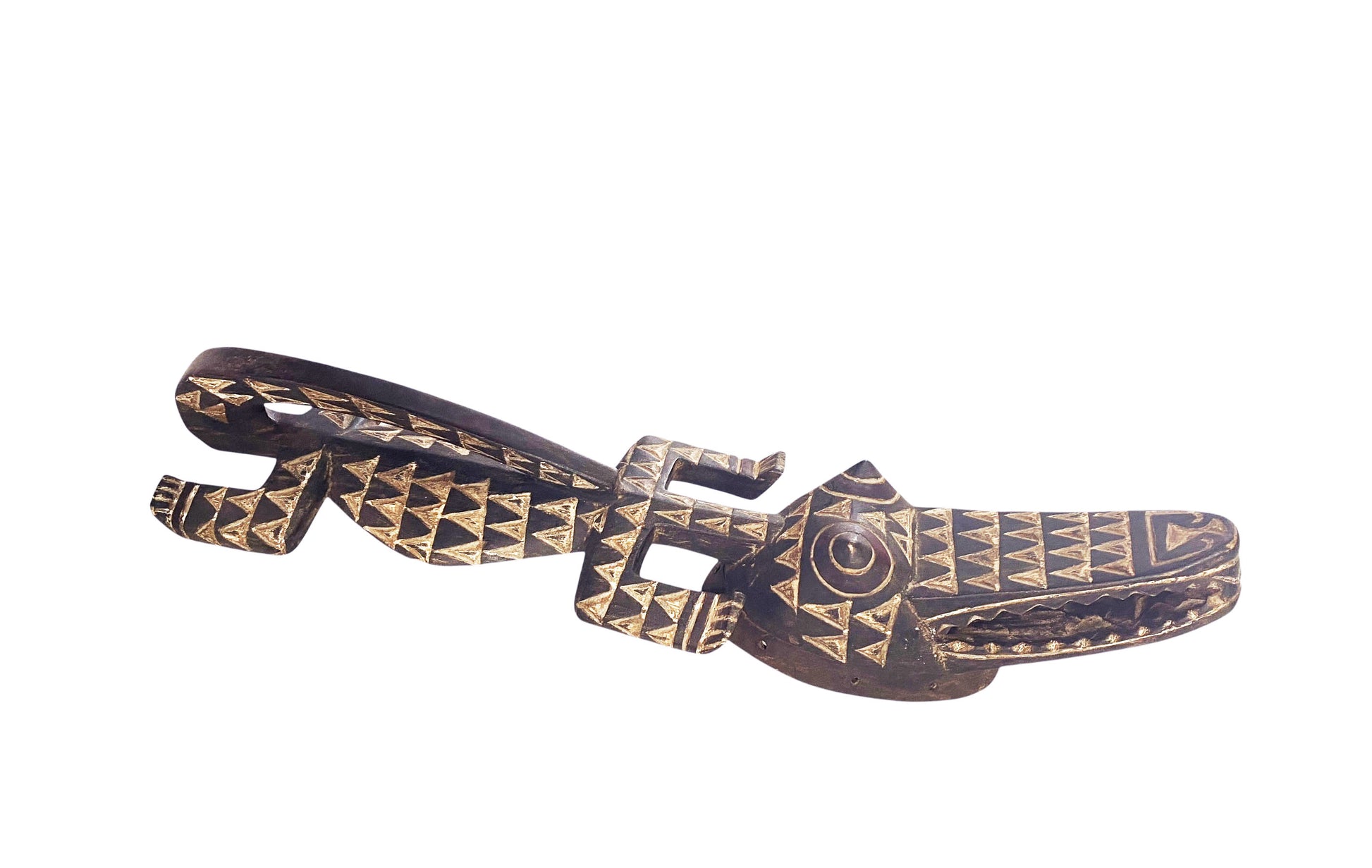 Hand Carved from a single block by Bobo artisans of Burkina Faso, this crocodile mask measures 39" wide by 10" deep and 7" high. The sculptural form features pronounced diamond-patterned relief work rendered in contrasting white and deep patinated tones, exemplifying the zoomorphic masking tradition central to this region's artistic practice. The crocodile motif carries profound spiritual significance within Bobo cosmology, embodying the aquatic realm's generative forces and symbolizing abundance and renewal.