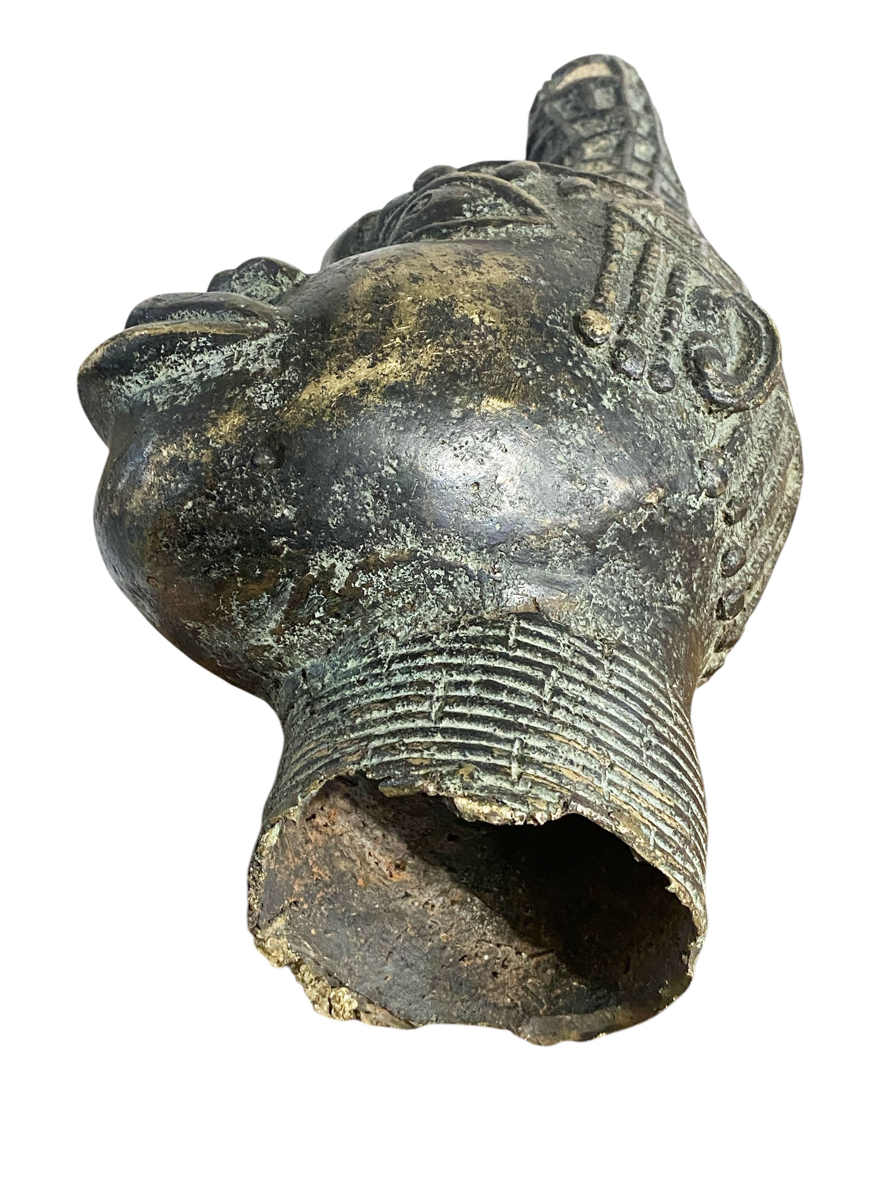 This exceptional Benin Bronze portraiture exemplifies the refined craftsmanship of Nigeria's royal brass-casting tradition. Standing 14 inches tall, the regal queen's head showcases the lost-wax casting technique perfected over centuries, producing a singular work of art. Historically displayed on palace altars, such pieces served to honor the monarchy's divine lineage. The brass casters' guild maintained exclusive relationships with royal courts and nobility.