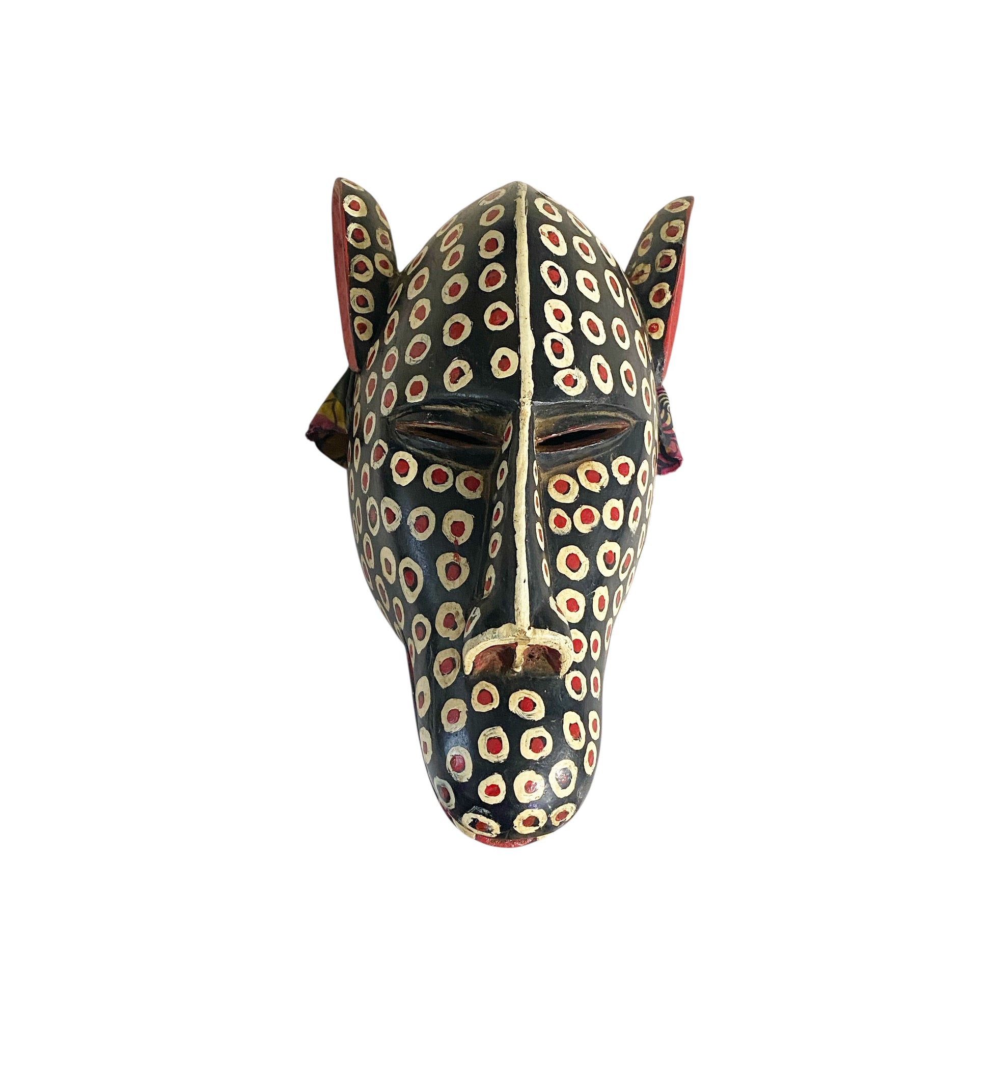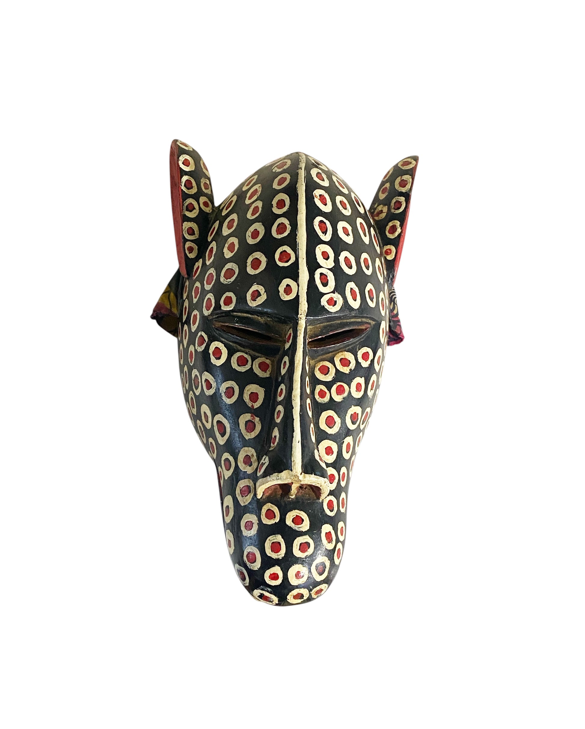 Measuring 16" in height, 9" in width, and 6.5" in depth, with kente cloth to cover the head , traditionally worn during the Sogo ba festival by young men. This vibrant leopard mask served dual purposes: entertaining audiences while imparting moral lessons about ethics, spirituality, and community values through performance art.