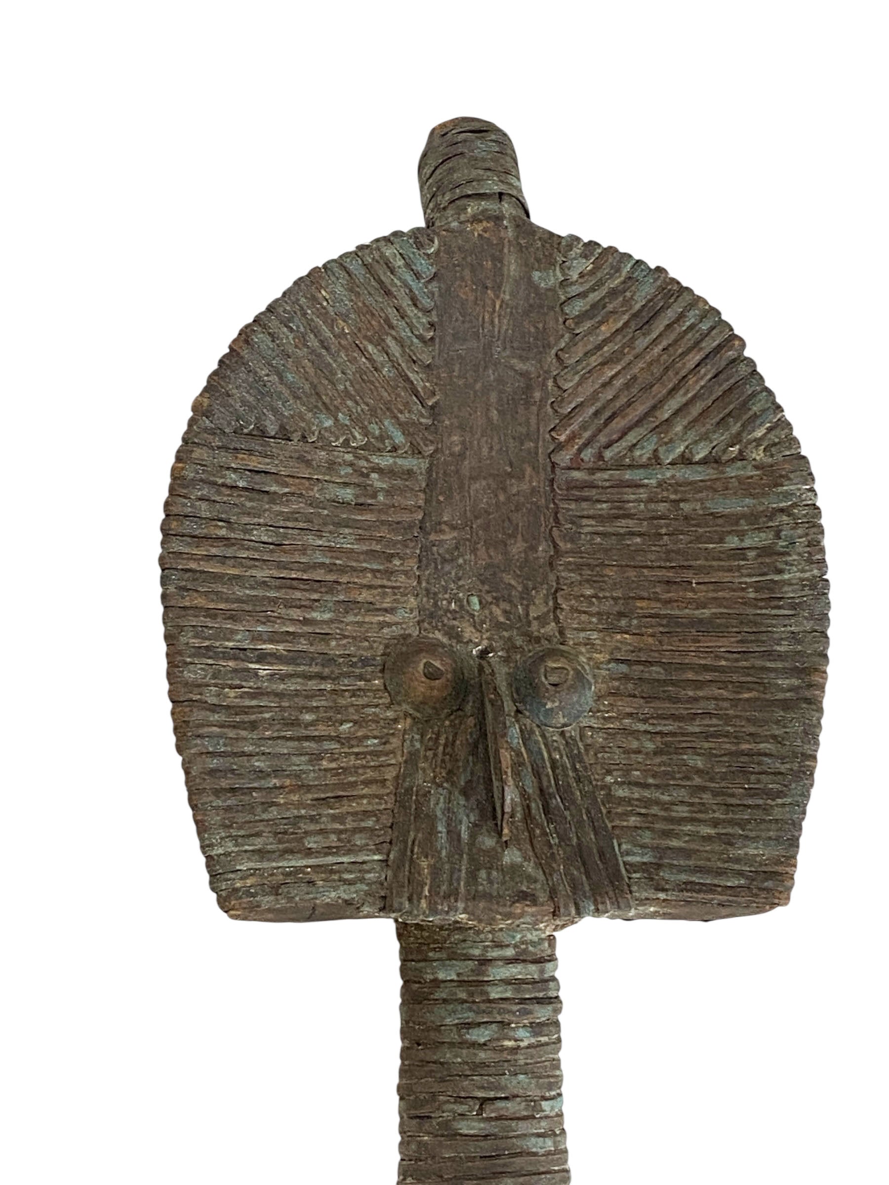 This exceptional old Bakota reliquary guardian from Gabon showcases masterful hammered brass work depicting a sacred Naga cobra in a commanding standing pose. Mounted on a wooden base, The cobra motif carries profound symbolic weight within African cosmology, representing sovereignty, vitality, and spiritual guardianship. Traditionally, clan leaders would brandish these reliquaries during ceremonial initiations, underscoring their significance in ritual practice. Measures 11.5" in height 5" w by 1.5" D the stand is 2.5" d by 3.5" W.