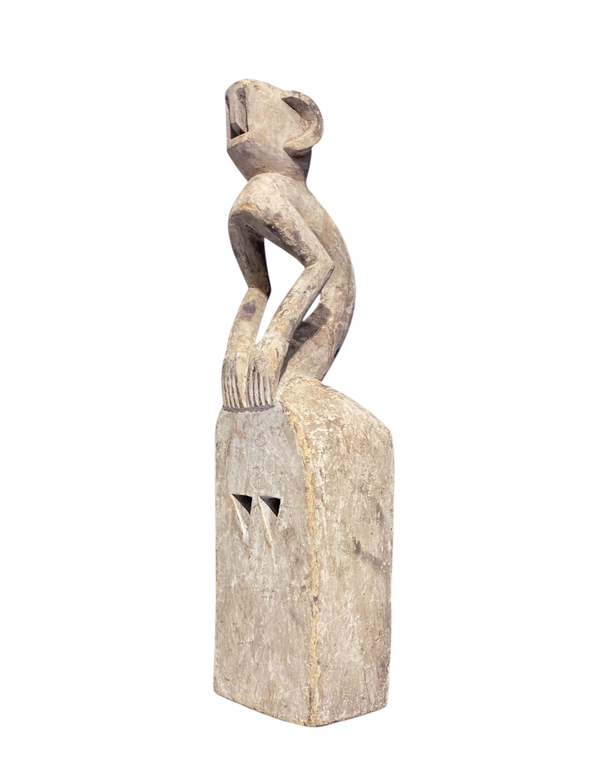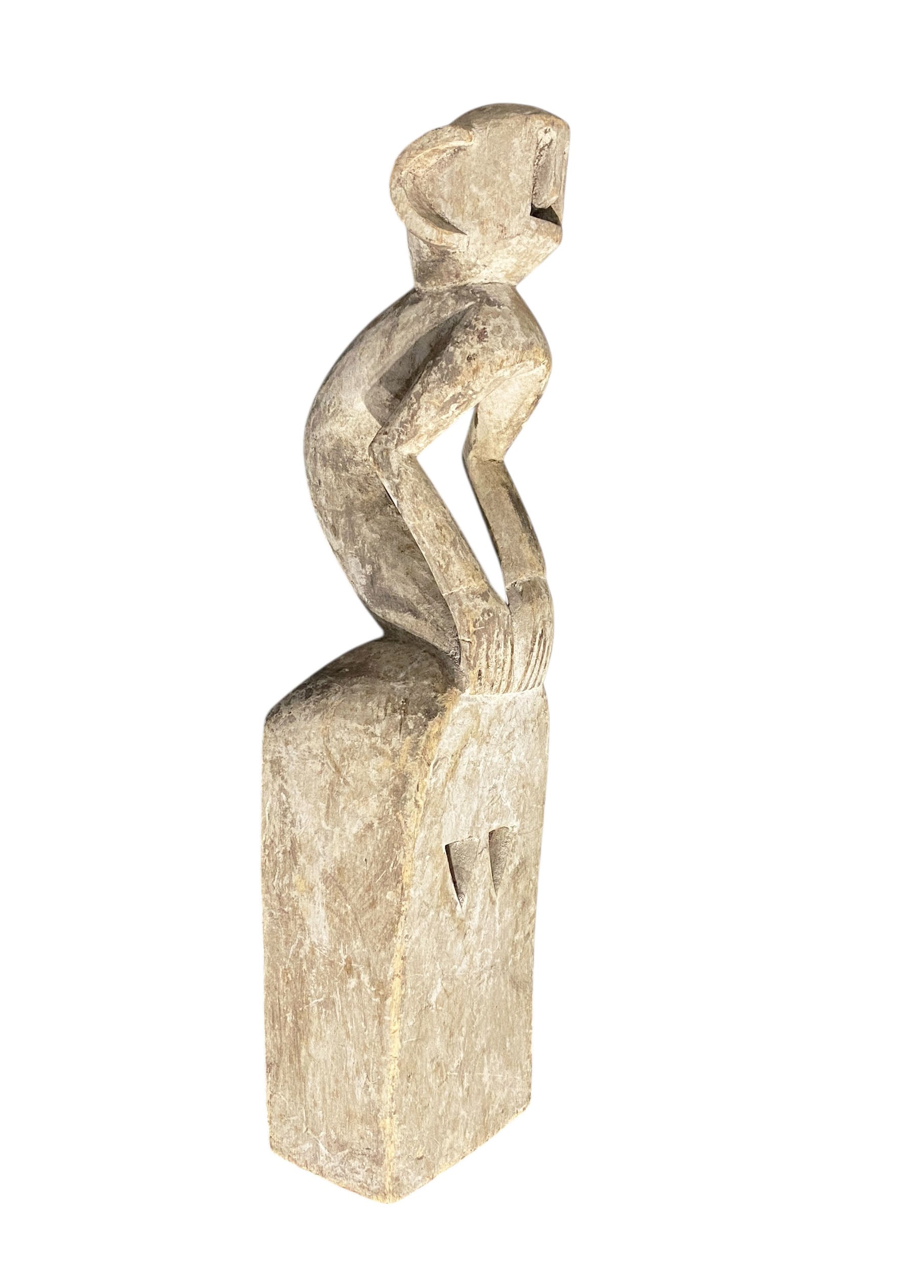 This Dogon tribal mask from Mali hand-carved in a single piece of wood, featuring bold geometric eye designs rendered in beige/white pigments. A carved monkey figure crowns the composition.Standing 22" tall with dimensions of 5.5" wide by 6.25" deep, the piece displays the patina of age with minor wear consistent with authentic use. Among the dogon people, primates held profound spiritual significance, embodying the untamed forces of the surrounding wilderness and serving as protective talismans against malevolent influences.