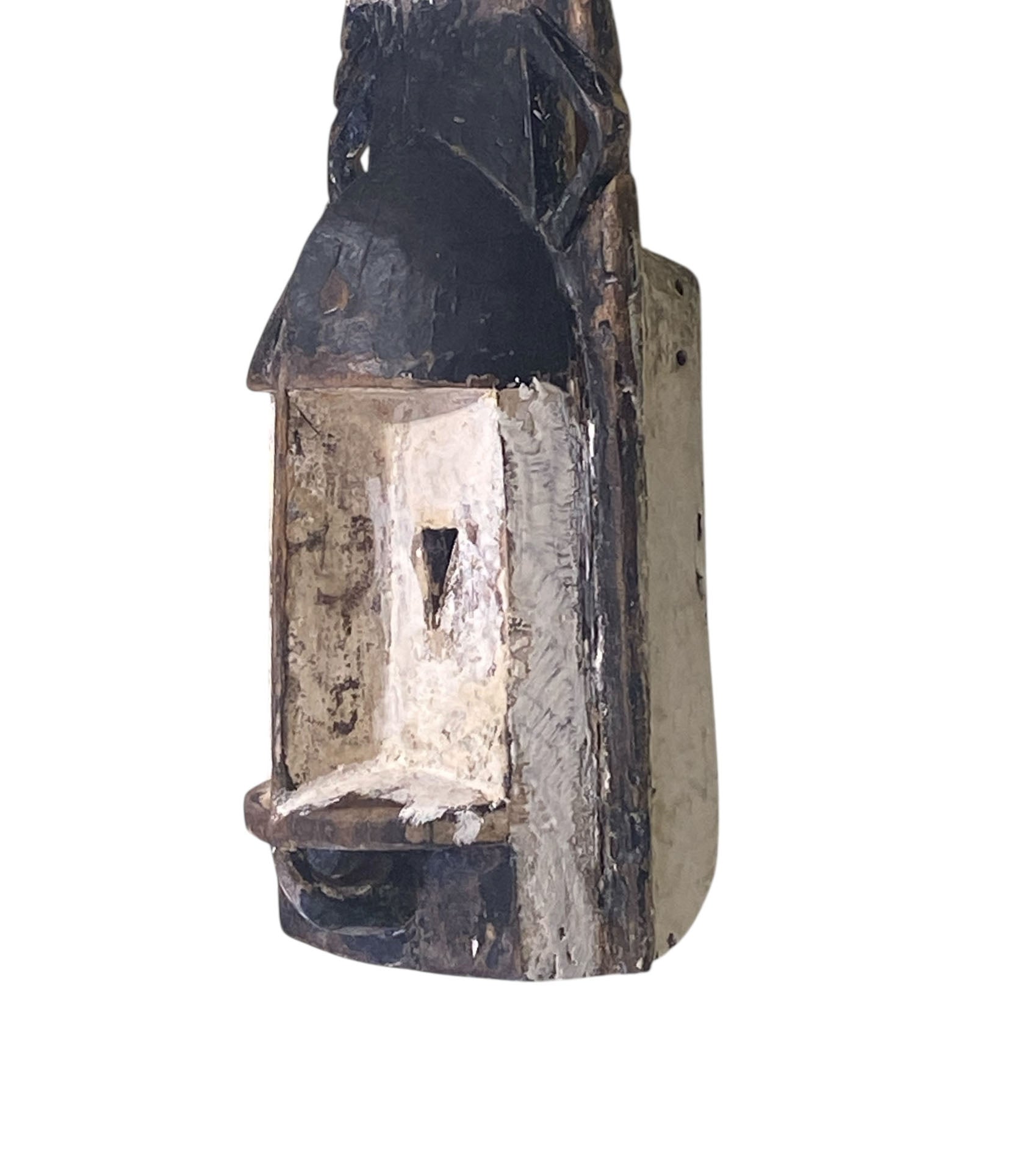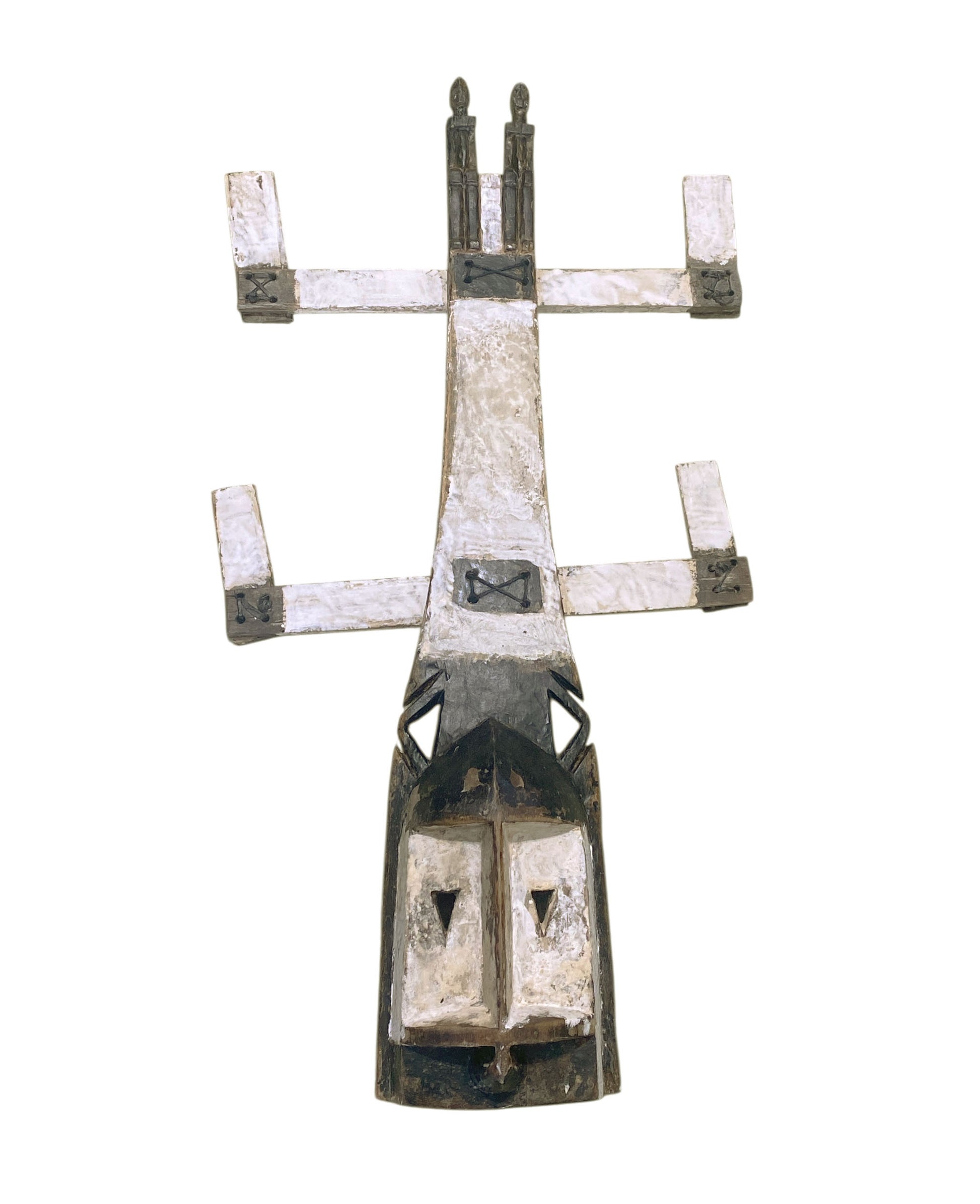the mask features the characteristic rectangular face with deeply recessed eye channels and the iconic superstructure—a double-barred cross with projecting vertical elements. Dogon artisans interpret this geometric form as a cosmological symbol, with the upper bar representing the celestial realm and the lower bar embodying the earthly plane. Worn by Dama society members during ancestral ceremonies, This 20th-century example demonstrates the refined carving technique and cultural significance that distinguish Dogon masking traditions. Dimensions: 39" H × 20" W × 6.5" D.