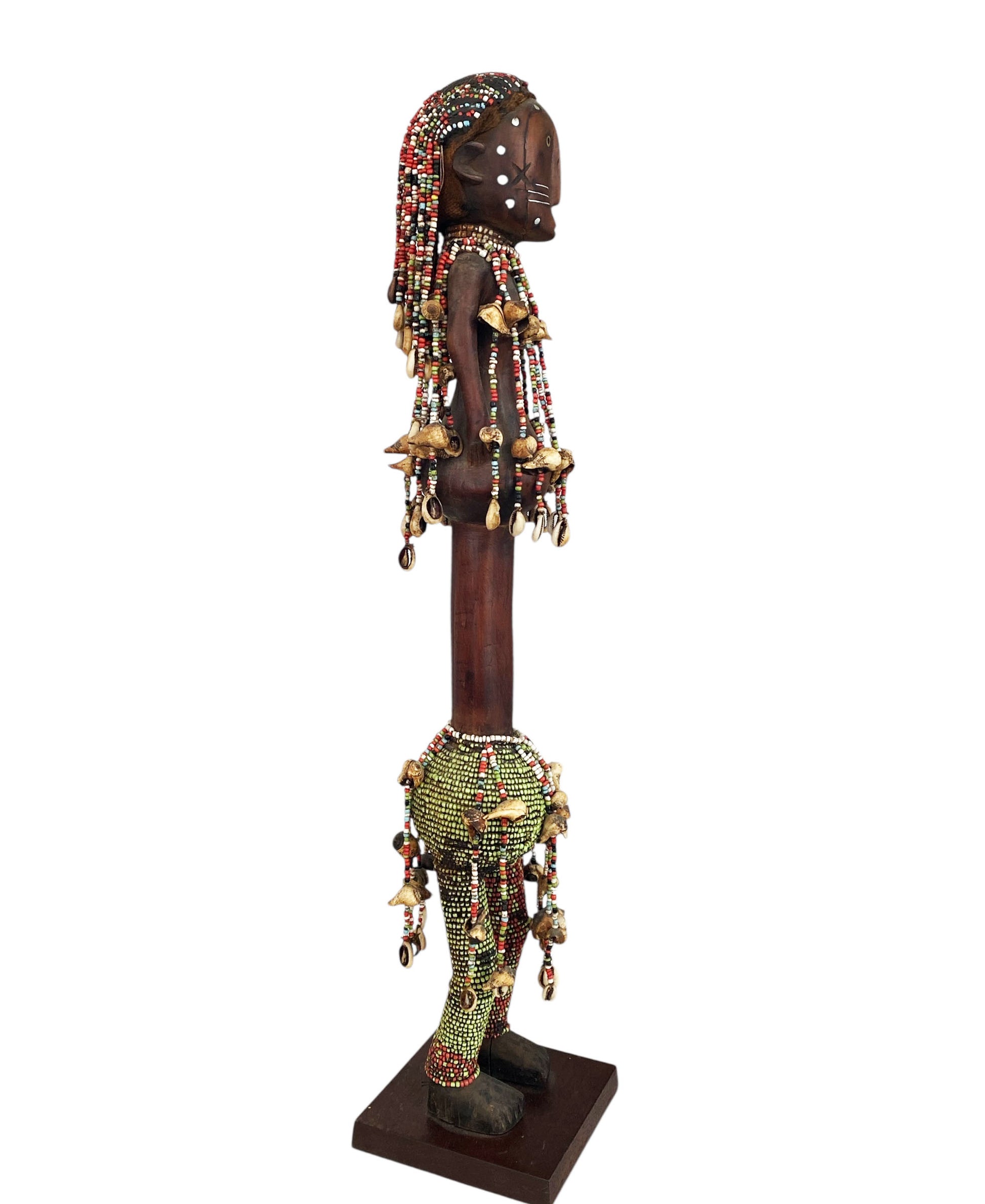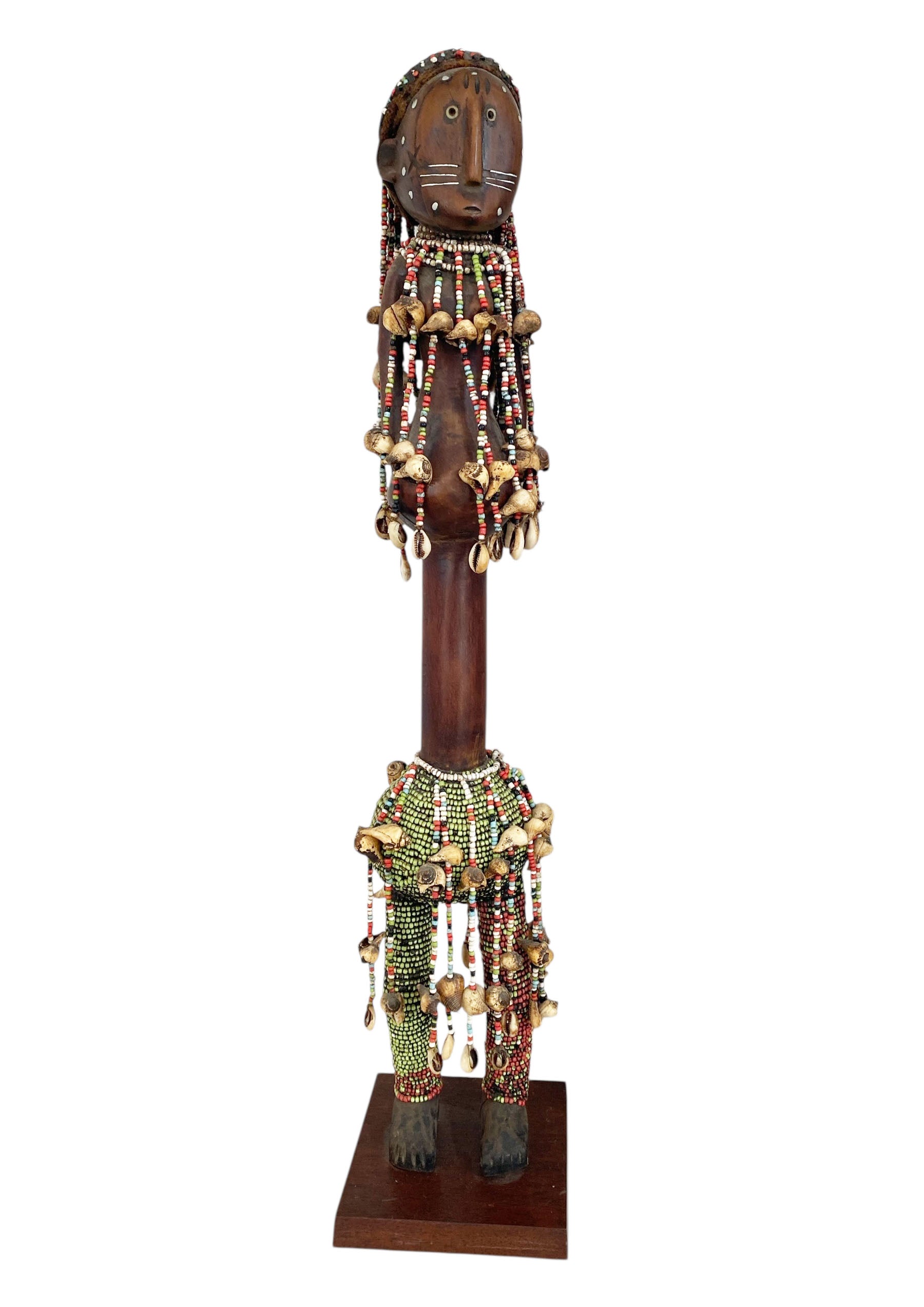 Originating from the Namji tribe of Northwest Cameroon, this superb vintage fertility doll Meticulously hand carved from solid South African pine, the figure is embellished with trade glass trade beads and natural cowrie shells that enhance its sculptural presence. Serving dual ceremonial and domestic purposes within Namji culture—functioning as both a fertility talisman and a young girl's companion—this doll demonstrates sophisticated artistic work. Measuring 31" H × 6" W × 5.5" D with its accompanying display square stand 6.25"