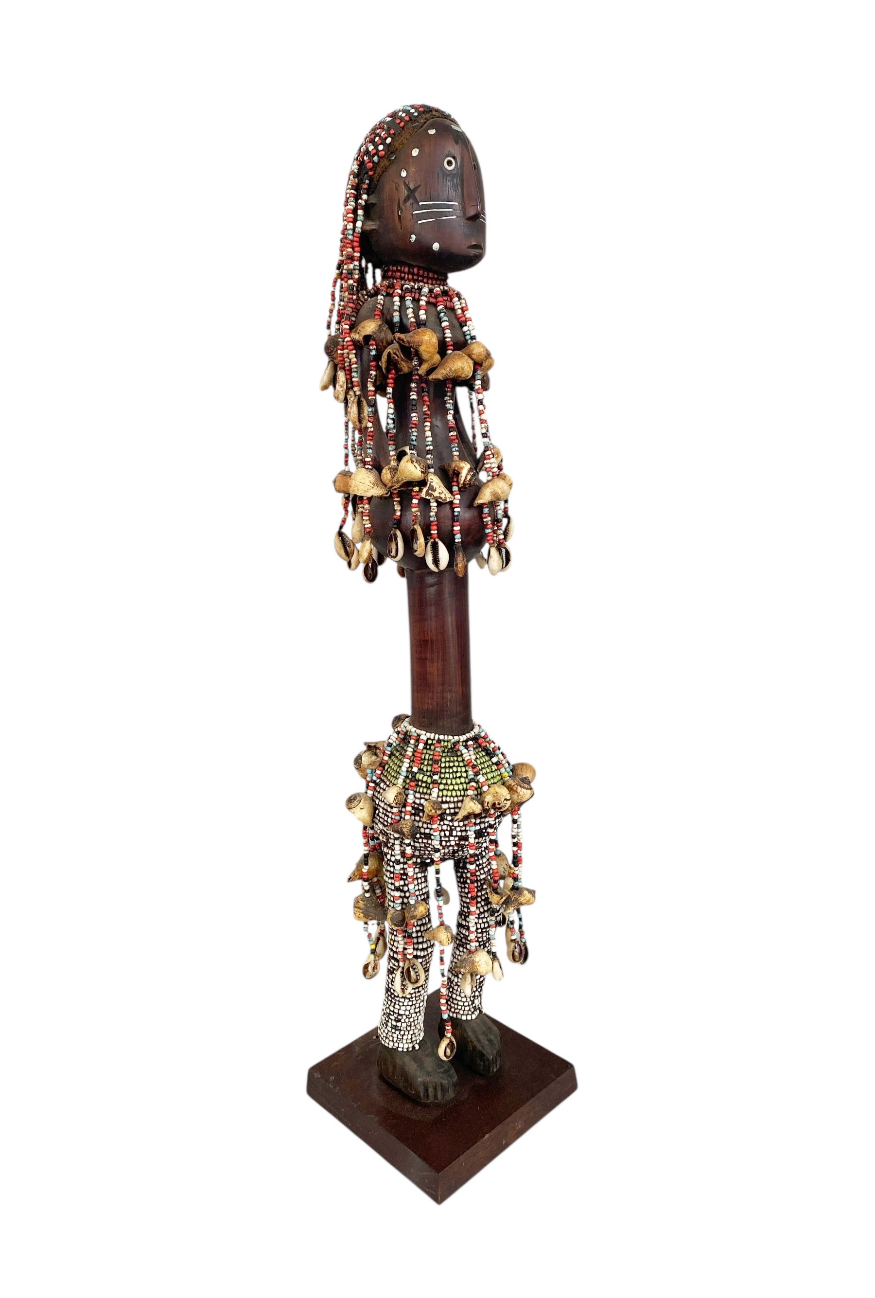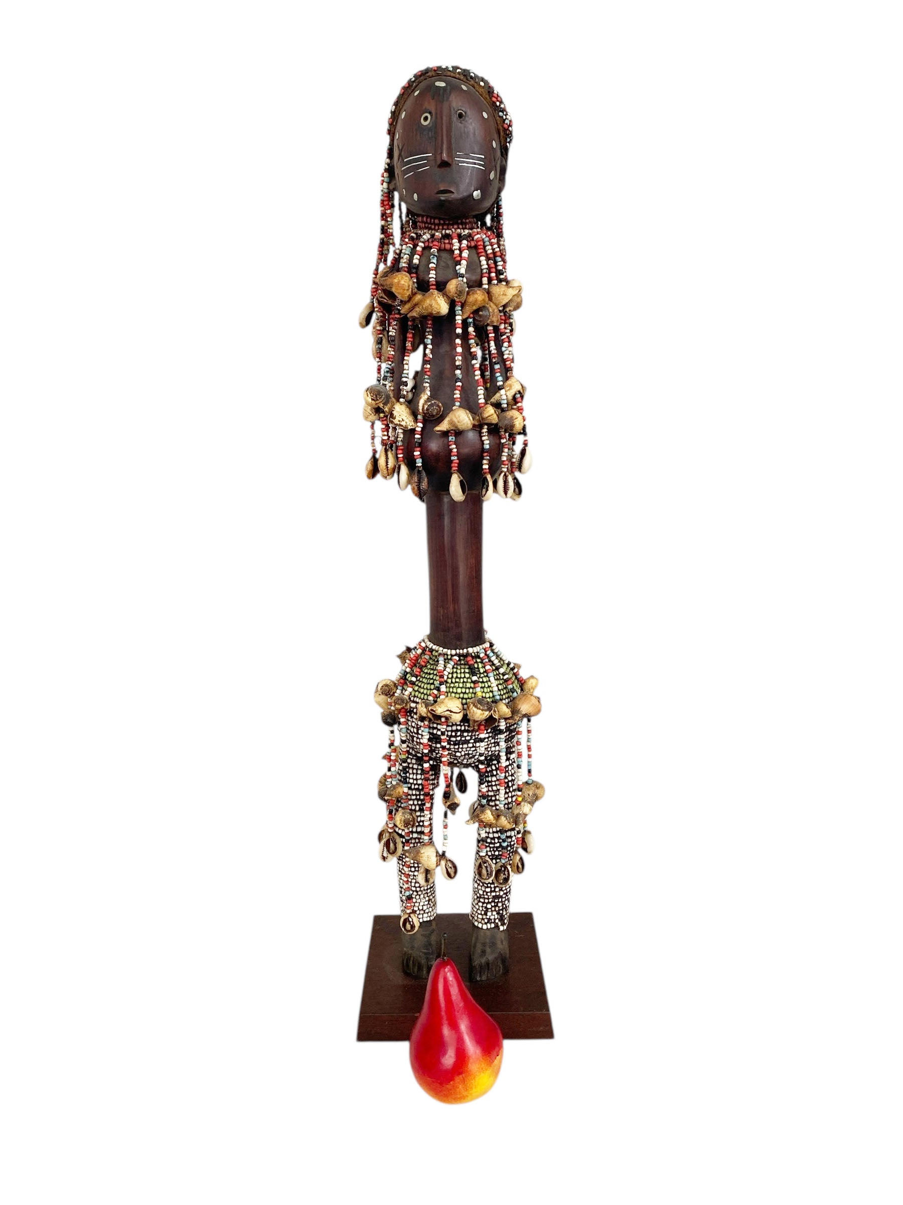Originating from the Namji tribe of Northwest Cameroon, this superb vintage fertility doll Meticulously hand carved from solid South African pine, the figure is embellished with trade glass trade beads and natural cowrie shells that enhance its sculptural presence. Serving dual ceremonial and domestic purposes within Namji culture—functioning as both a fertility talisman and a young girl's companion—this doll demonstrates sophisticated artistic work. Measuring 29" H × 5.5" W × 6" D with its accompanying display square stand 6.25"