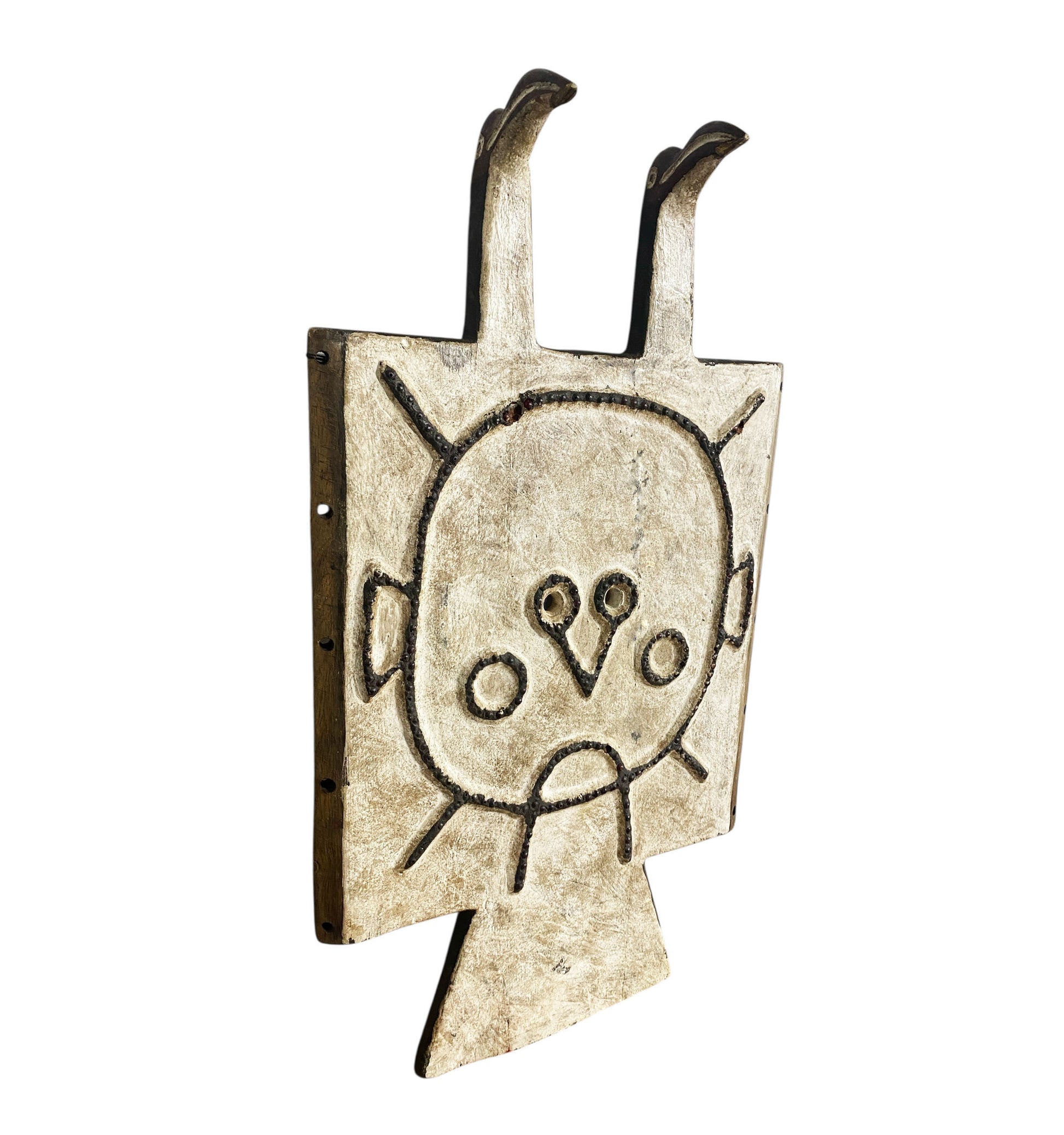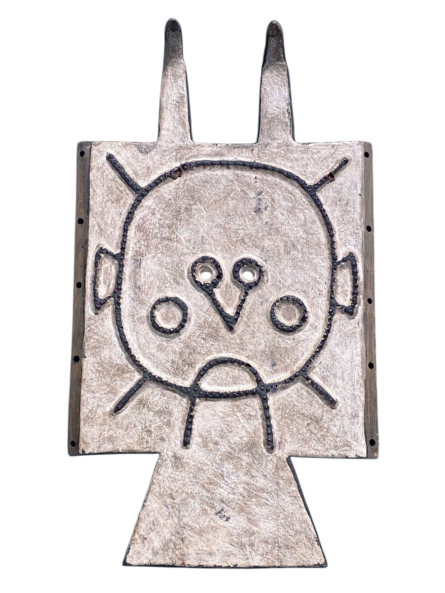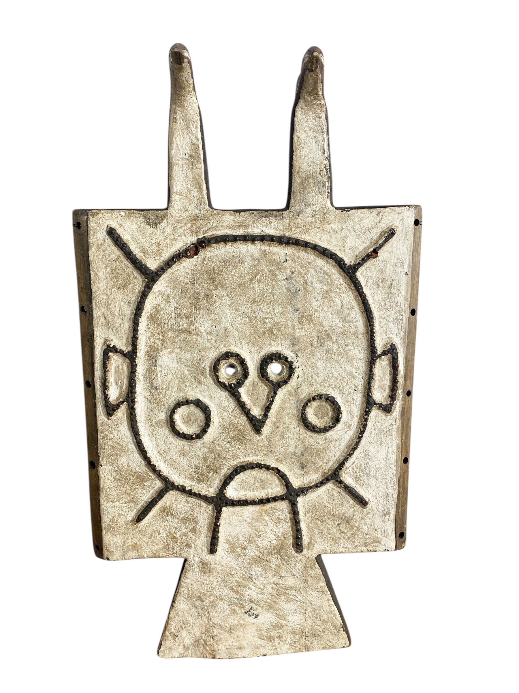 Superb Burkina Faso's Toussian people mask Hand-sculpted from a single plank, it features two distinctive bird crests symbolizing fertility and spiritual guidance—elements integral to ancestral and agricultural ceremonial practices. Measuring 25.5"H × 14.5"W × 4"D, this piece showcases the refined craftsmanship characteristic of West African tribal traditions. A distinguished addition for serious collectors of ethnographic art and those seeking culturally significant décor with historical provenance.