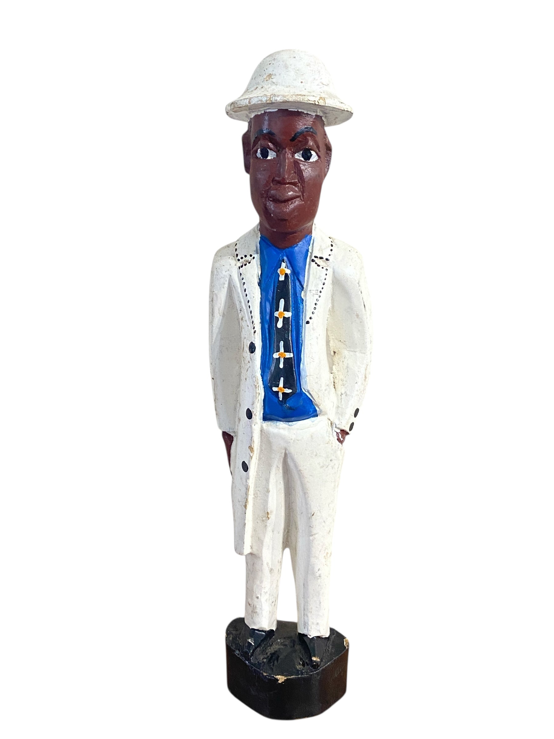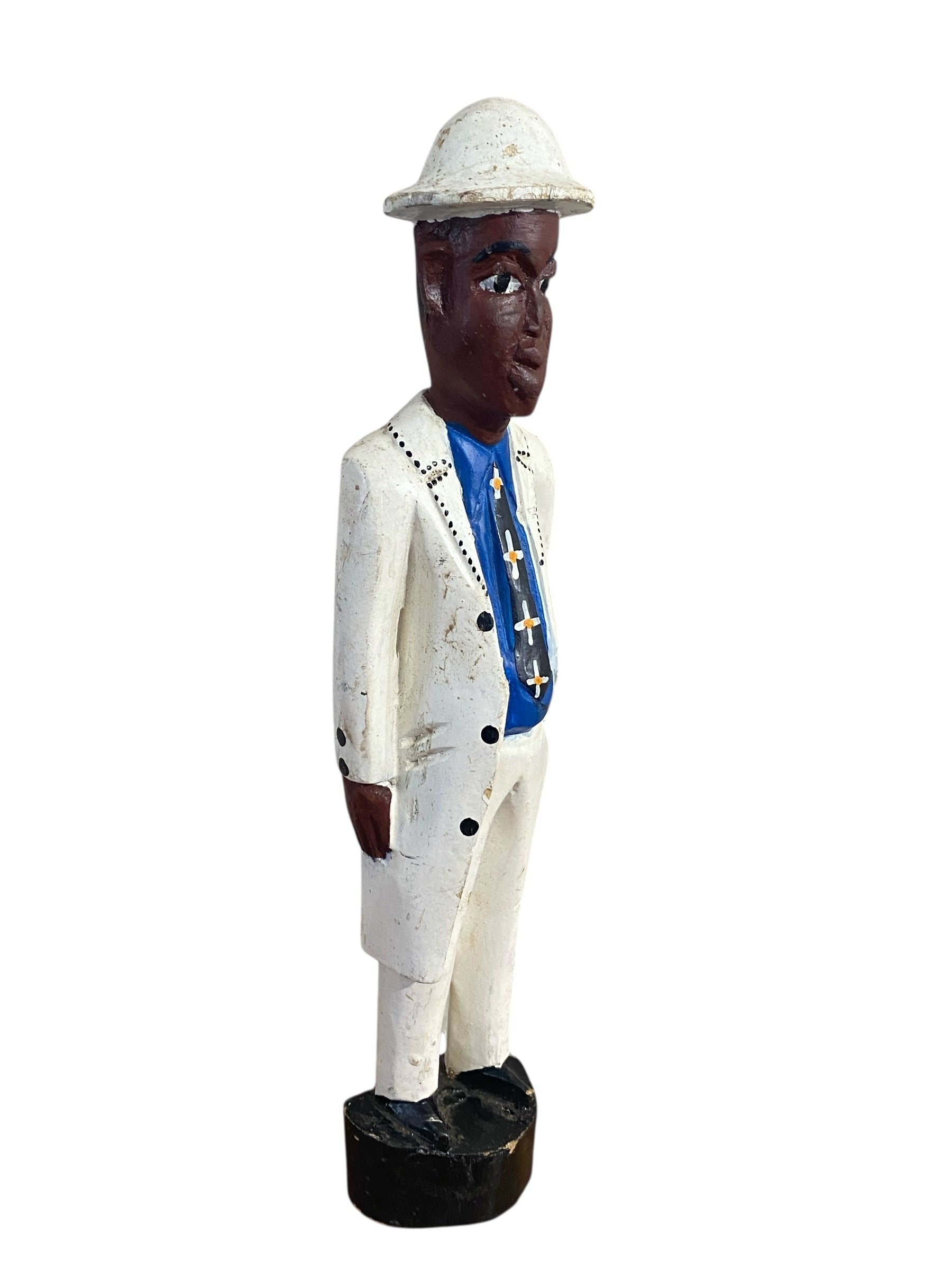 A colonial-era African wood sculpture depicting a European or Africanized figure. Hand-painted with folk art details, this 12.5" by 3.25"w by 2" D carved male figure represents a distinctive genre that emerged during Africa's colonial period, blending traditional carving techniques with historical subject matter.