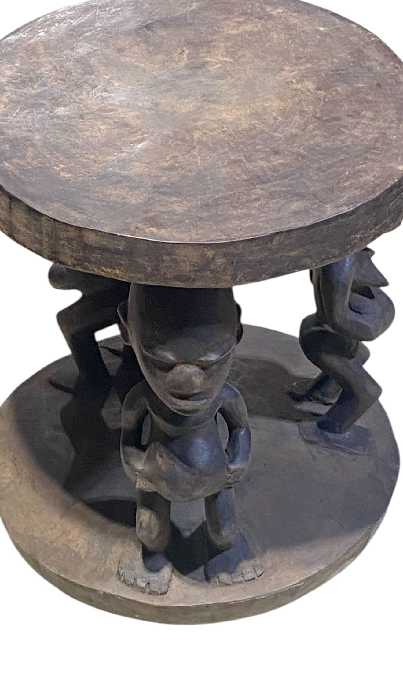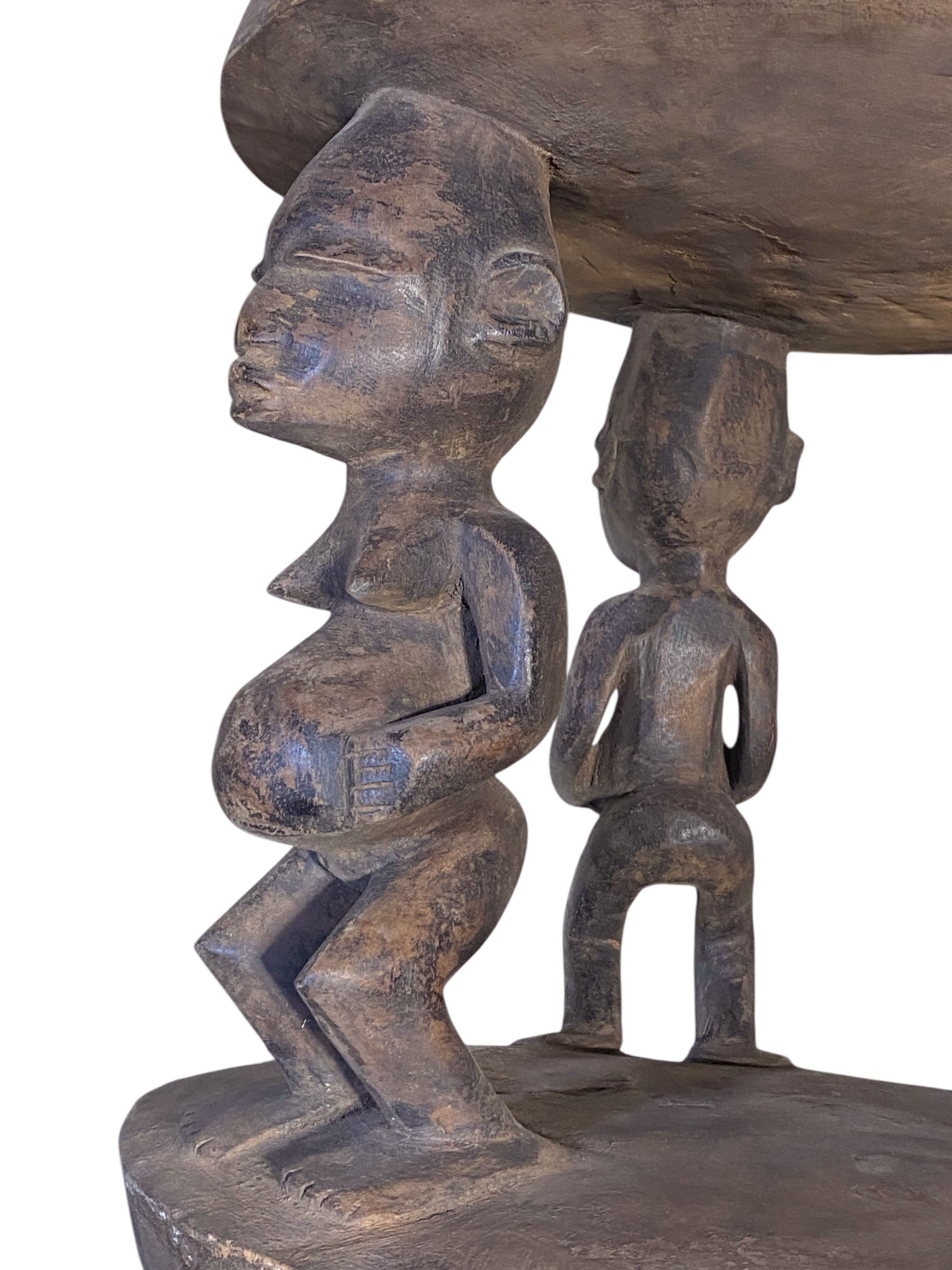 The 16" Baga Stool/Table from Guinea is a superb and rare piece of traditional African hand-carved art. Made from a single solid piece of heavy wood, it features exquisite depictions of pregnant women from the Baga tribe, representing motherhood . Despite its age, it remains in good condition and is a highly valuable addition to any collection.