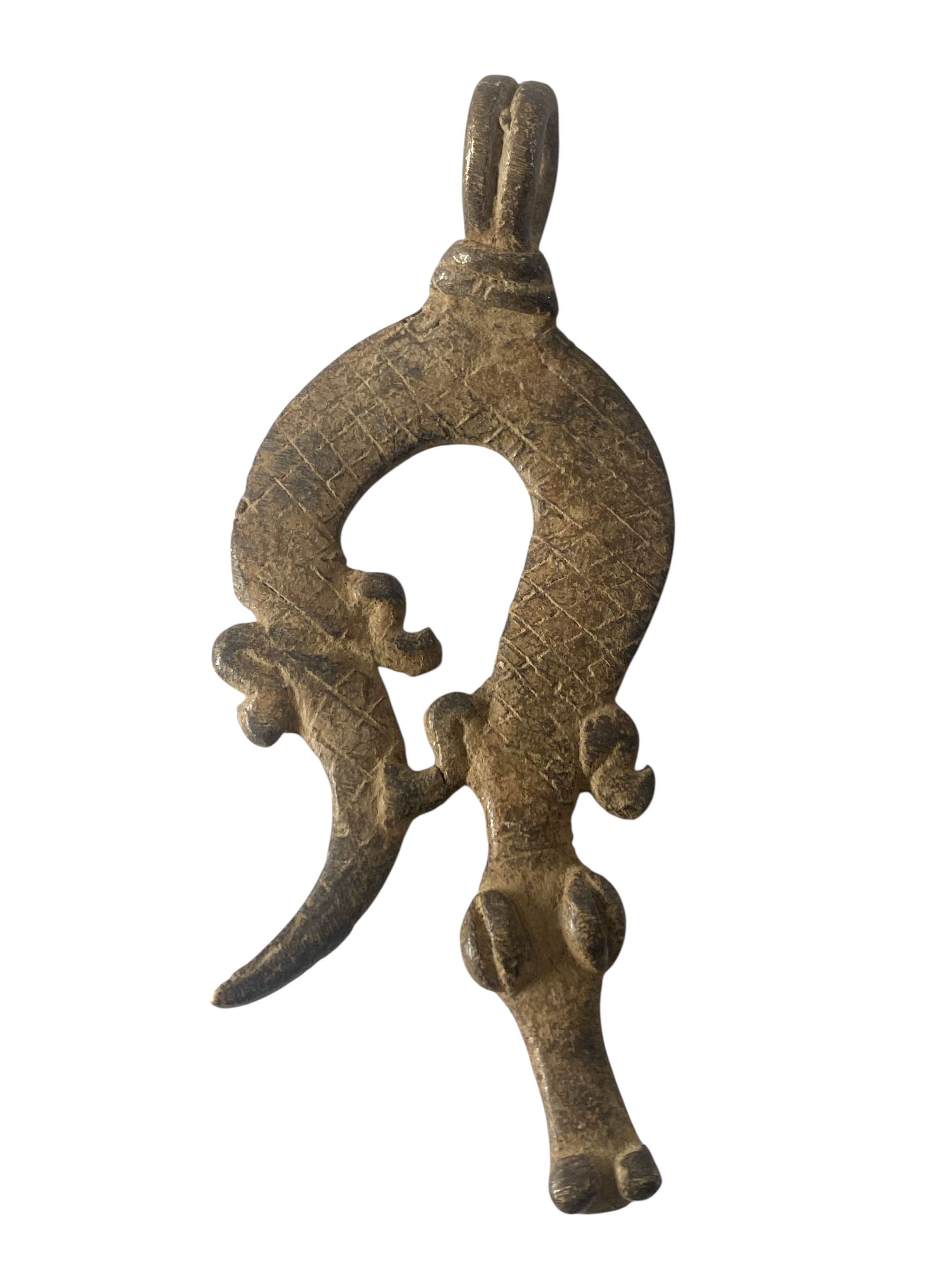 A remarkable example of Gan bronze from Burkina Faso, using the refined lost-wax casting method with set of a crocodile and a serpentswhose intertwined tails feature elaborate concentric rope detailing. Within Gan tradition, the serpent and crocodile functions as a powerful protective emblem, warding off adversity and spiritual malevolence while commanding deep cultural reverence. Approximately 4" by 1.75" by 0.50" in and 3.5"w ny 1.5"h by 0.50" D
