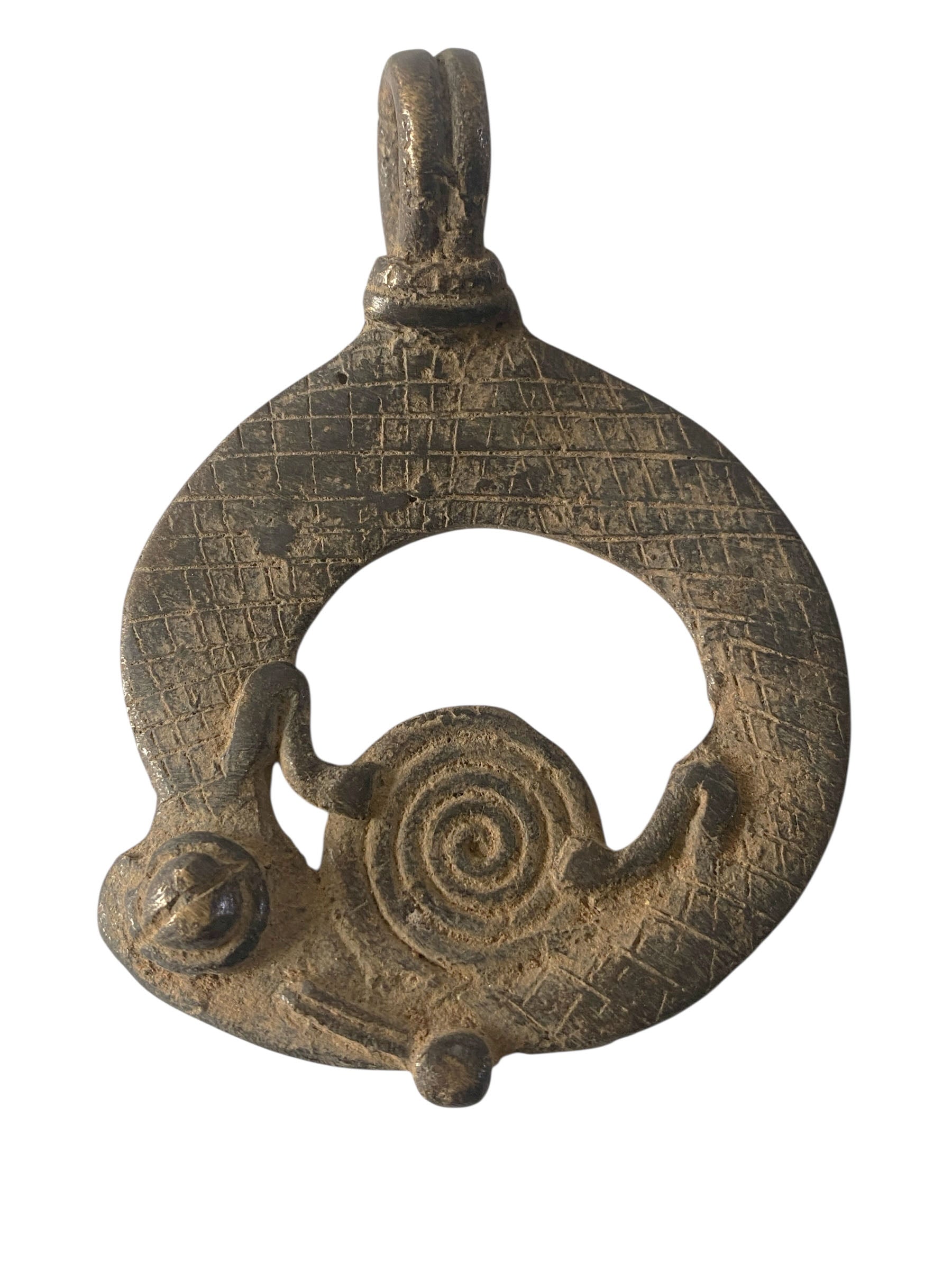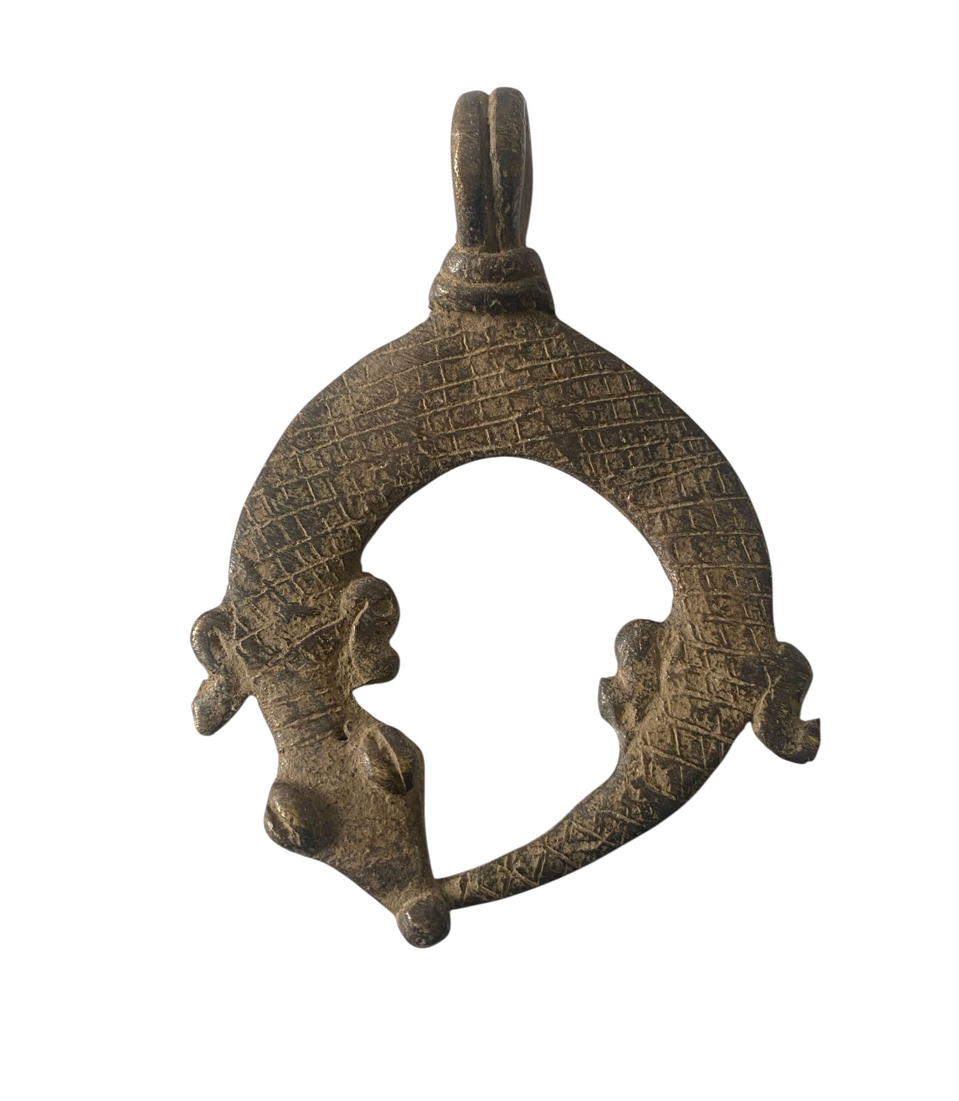 A remarkable example of Gan bronze from Burkina Faso, using the refined lost-wax casting method with set of a crocodile and a chameleon whose intertwined tails feature elaborate concentric rope detailing. Within Gan tradition, the chameleon and crocodile functions as a powerful protective emblem, warding off adversity and spiritual malevolence while commanding deep cultural reverence. Approximately 3.25" by 1.75" by 0.50" Created through the ancient lost-wax process—where the original beeswax model is consumed during casting—each piece remains utterly singular and unreproducible.
