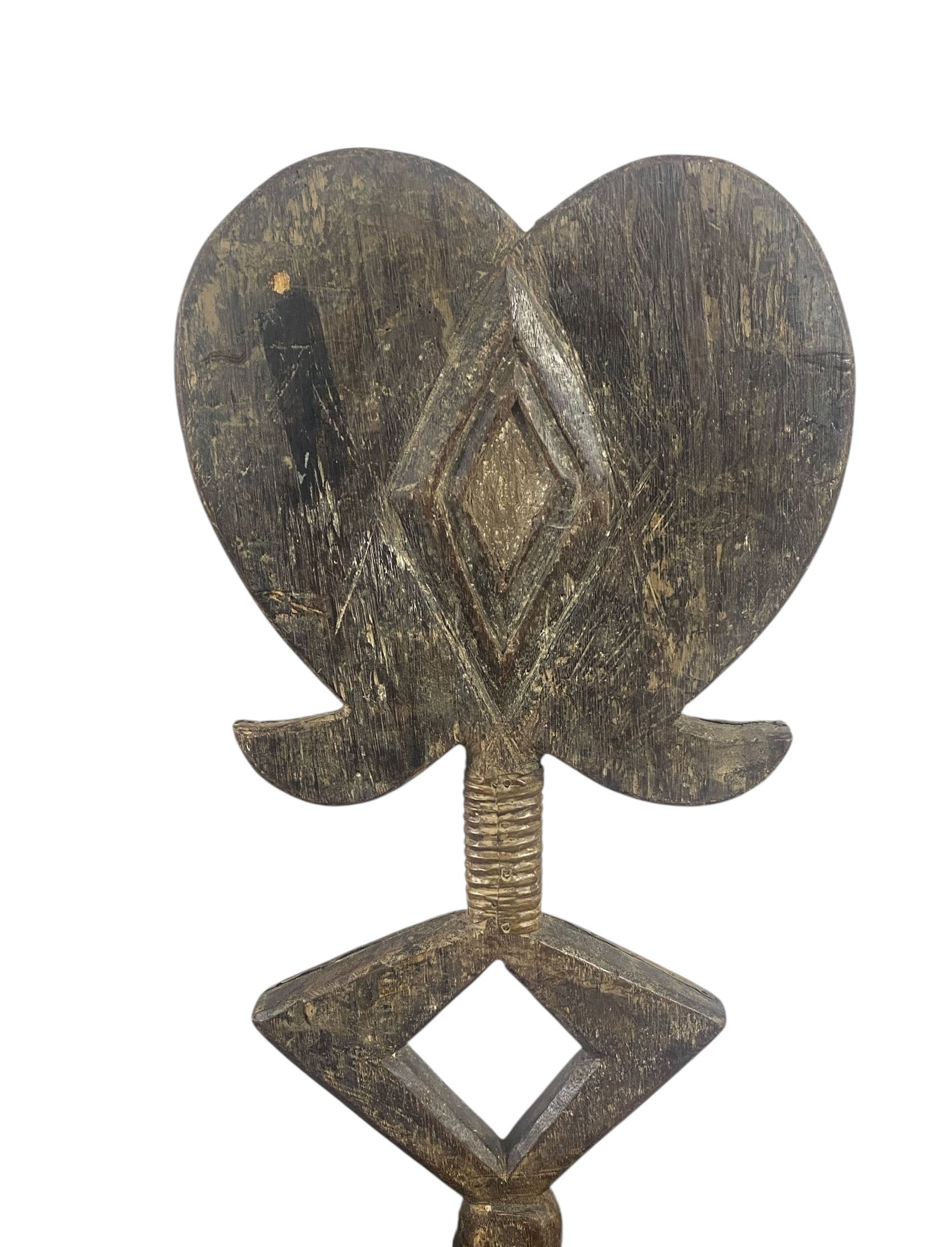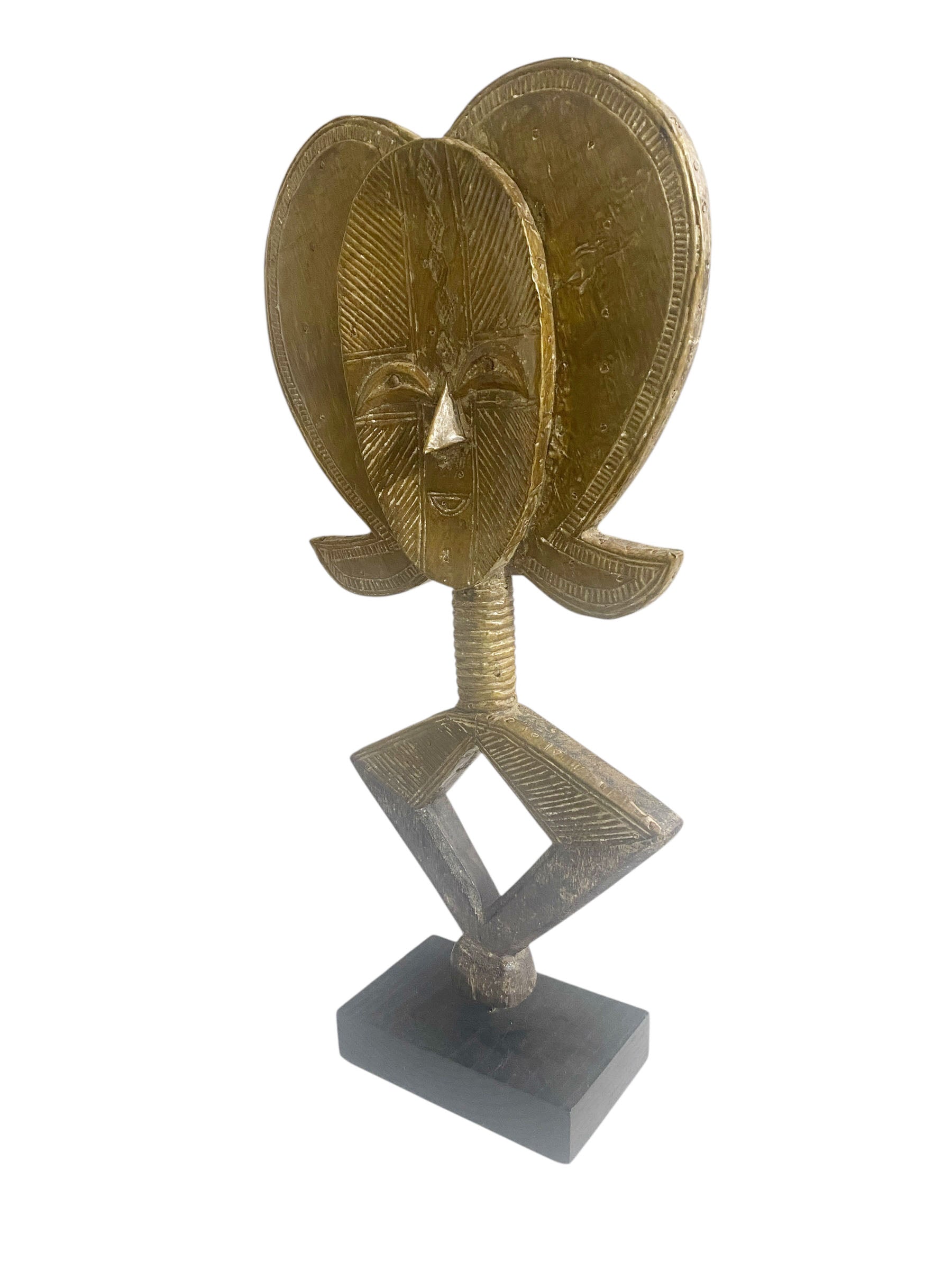 This exceptional Bakota reliquary figure from Gabon hand carved from a wooden armature sheathed in meticulously hammered brass and copper, the guardian was designed to stand sentinel over containers preserving ancestral remains—a sacred custodian of clan heritage. The composition employs elegant formal reduction: radiating projections around the face evoke elaborate traditional coiffures, while the abstracted diamond silhouette below the neck distills human form to its essential geometry. Displayed on a custom black wood base, Dimensions: 22" H × 11" W × 2" D (figure); stand 7" W × 4." D.