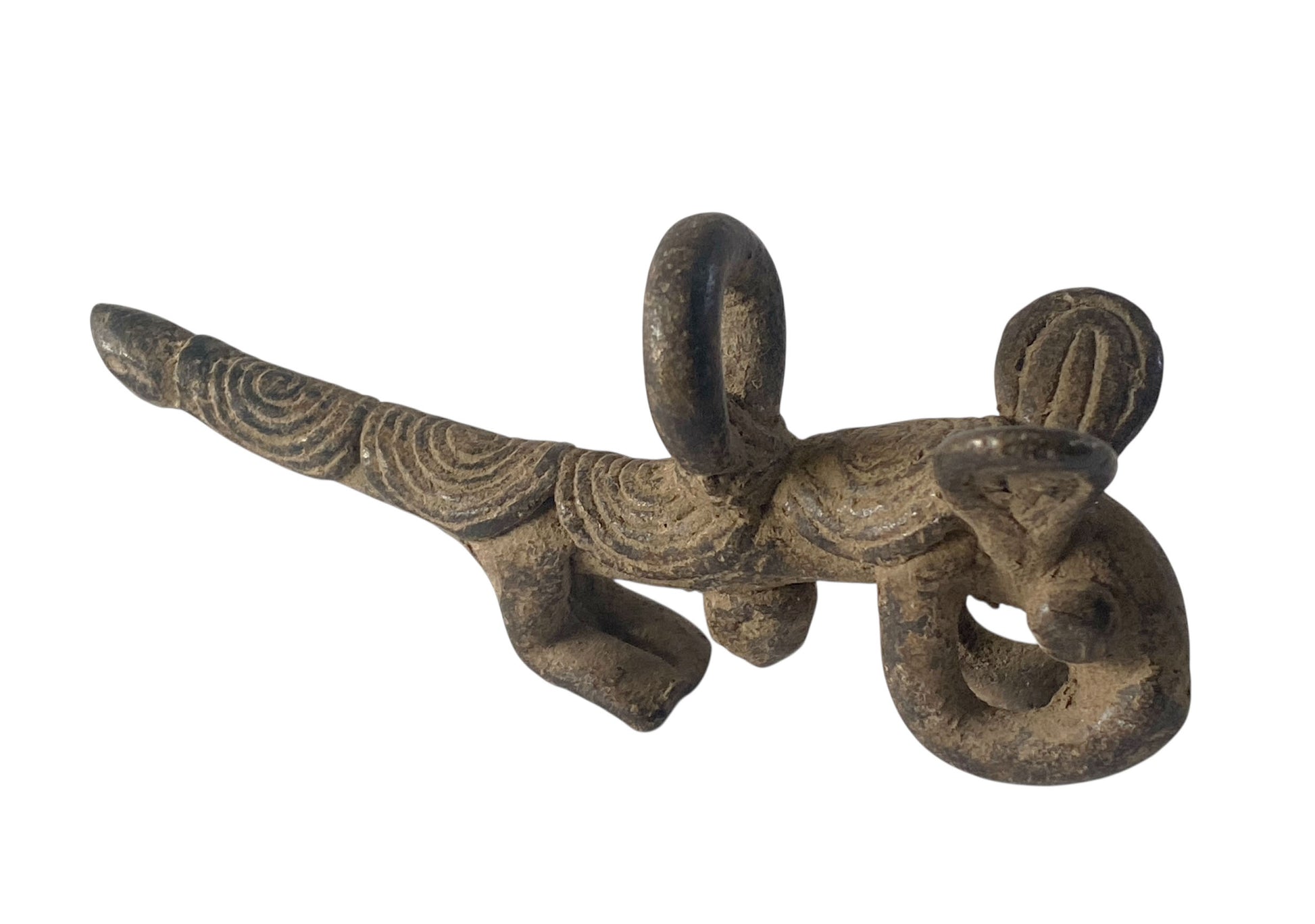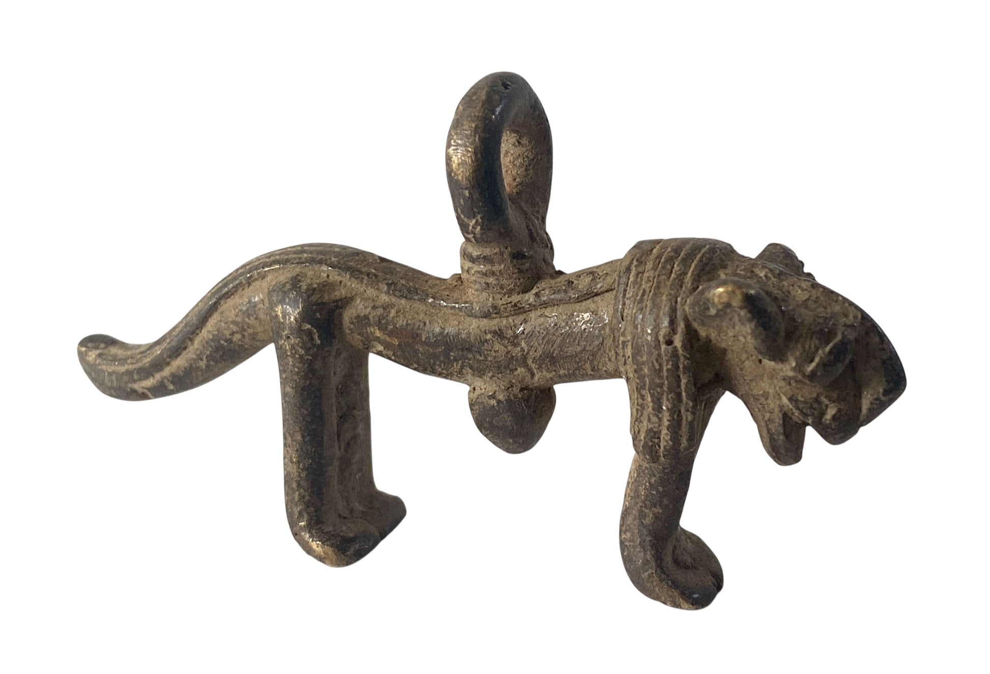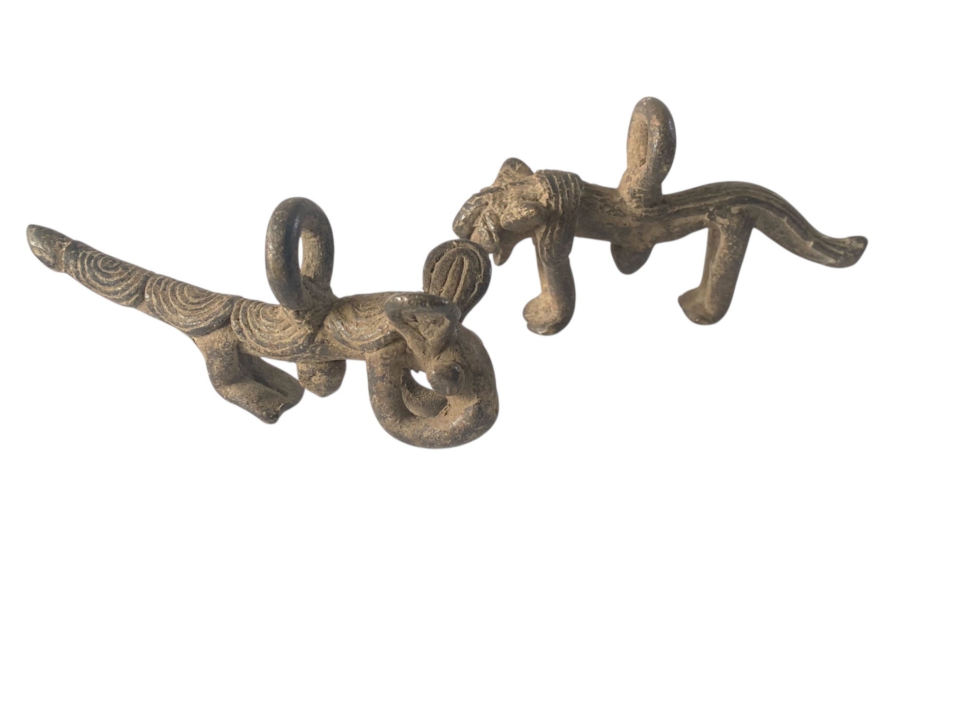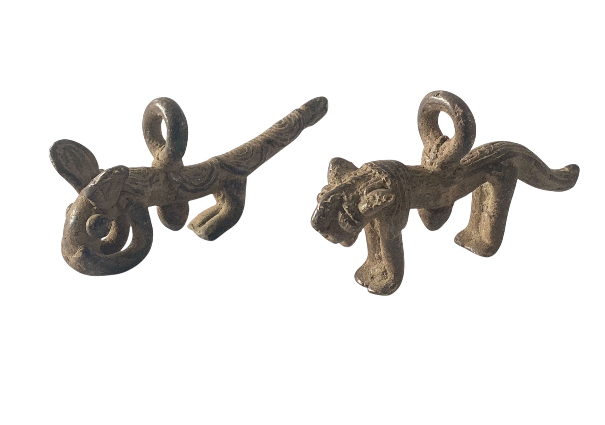 This exceptional Gan bronze amulet set from Burkina Faso showcases the mastery of lost-wax casting, an ancient technique that renders each piece entirely unique. The pairing of a leopard and armadillo carries profound cultural significance: the armadillo embodies protection, renewal, and resilience, while the leopard commands associations with power, authority, and spiritual guardianship. Measuring approximately 3" by 1.75" by 0.57" and 3" by 1.5" by 1" respectively, these finely detailed pendants or gold weights represent the sophisticated metalworking traditions of the Gan people.