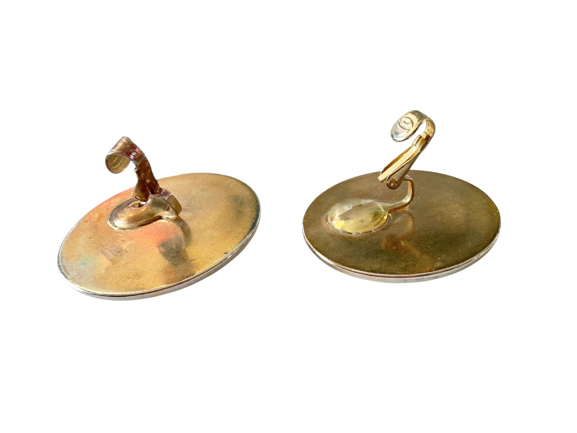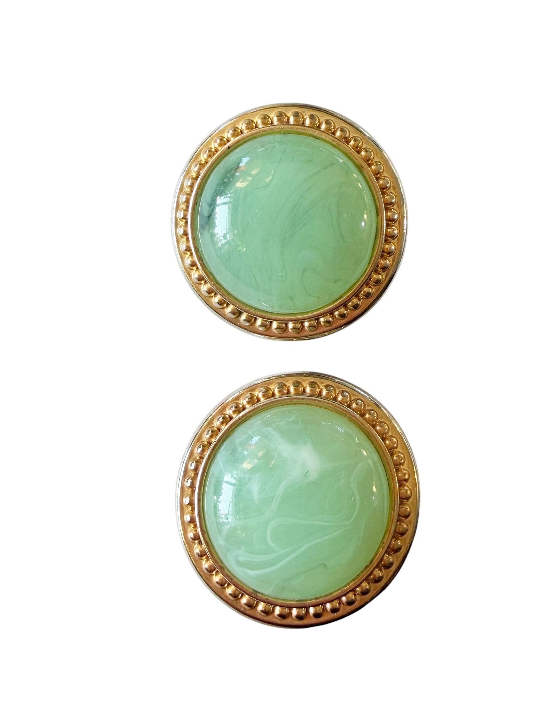 Striking in their simplicity, these gold-tone clip on earrings showcase lustrous round faux celadon green jadeite stones secured within bezel settings. The refined dot rope detailing encircling each stone introduces subtle dimension to the composition. Measuring 1.5" in diameter with a 0.50" height. The warm metallic finish complements the cool jade tones, creating a harmonious aesthetic that reflects timeless craftsmanship.