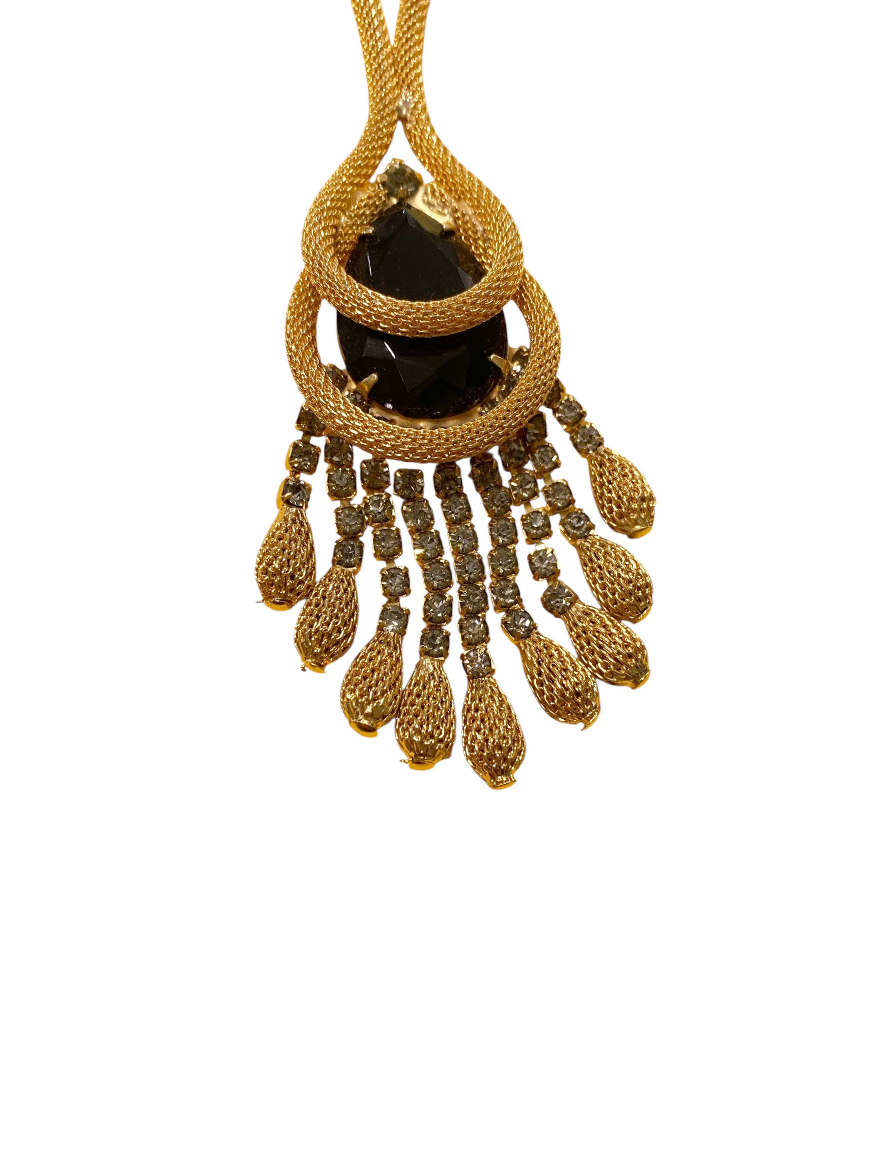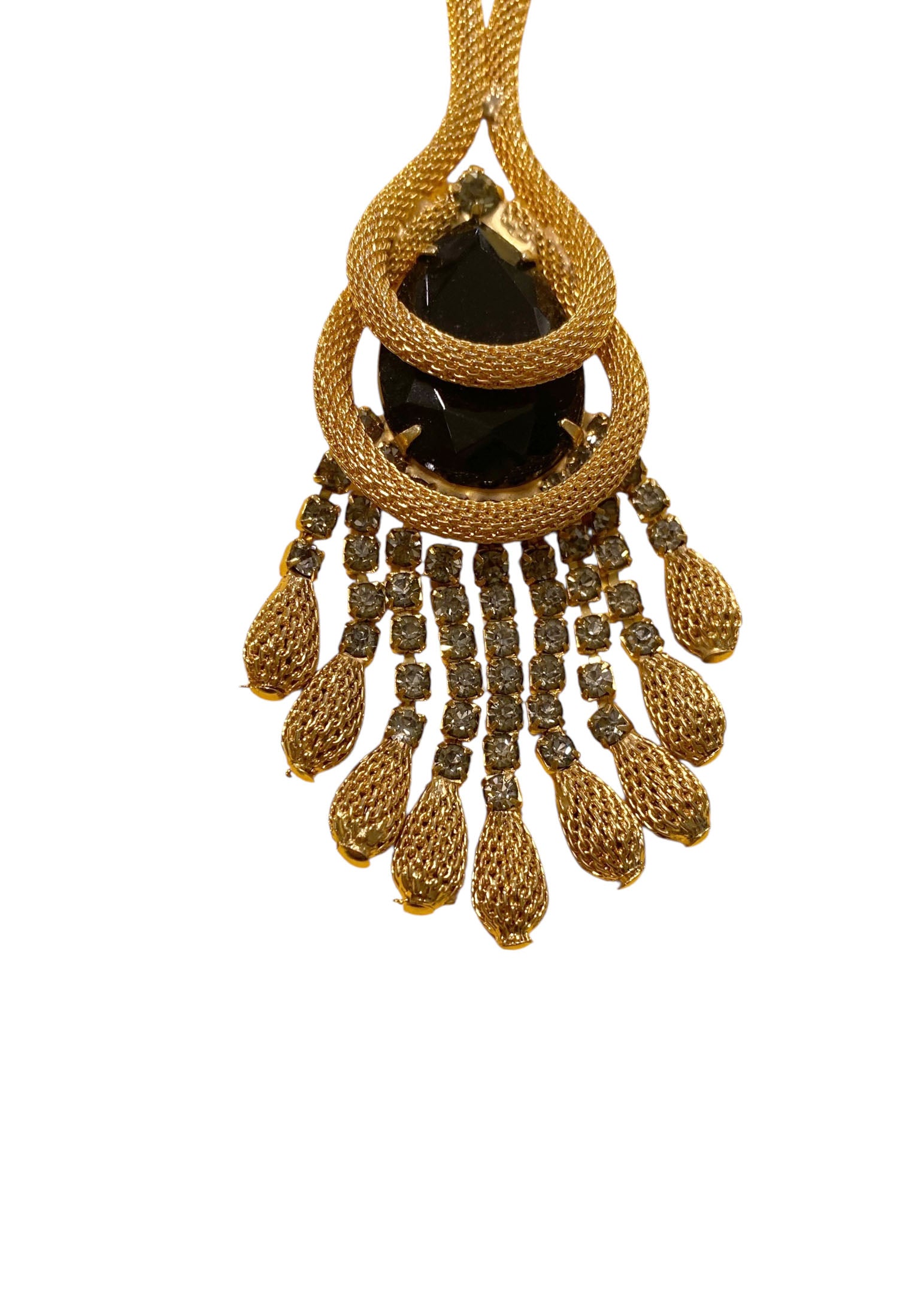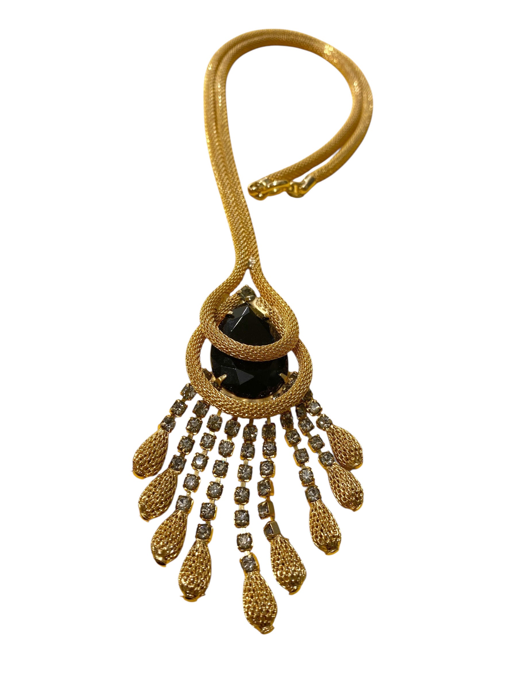 This vintage gold-tone mesh chain showcases a black faceted rhinestone pendant adorned with nine pear-shaped drops and square glass diamond details. The pendant measures 2" in width and 1/2" in depth, with a total length of 12.5". It remains in excellent condition, embodying classic sophistication.