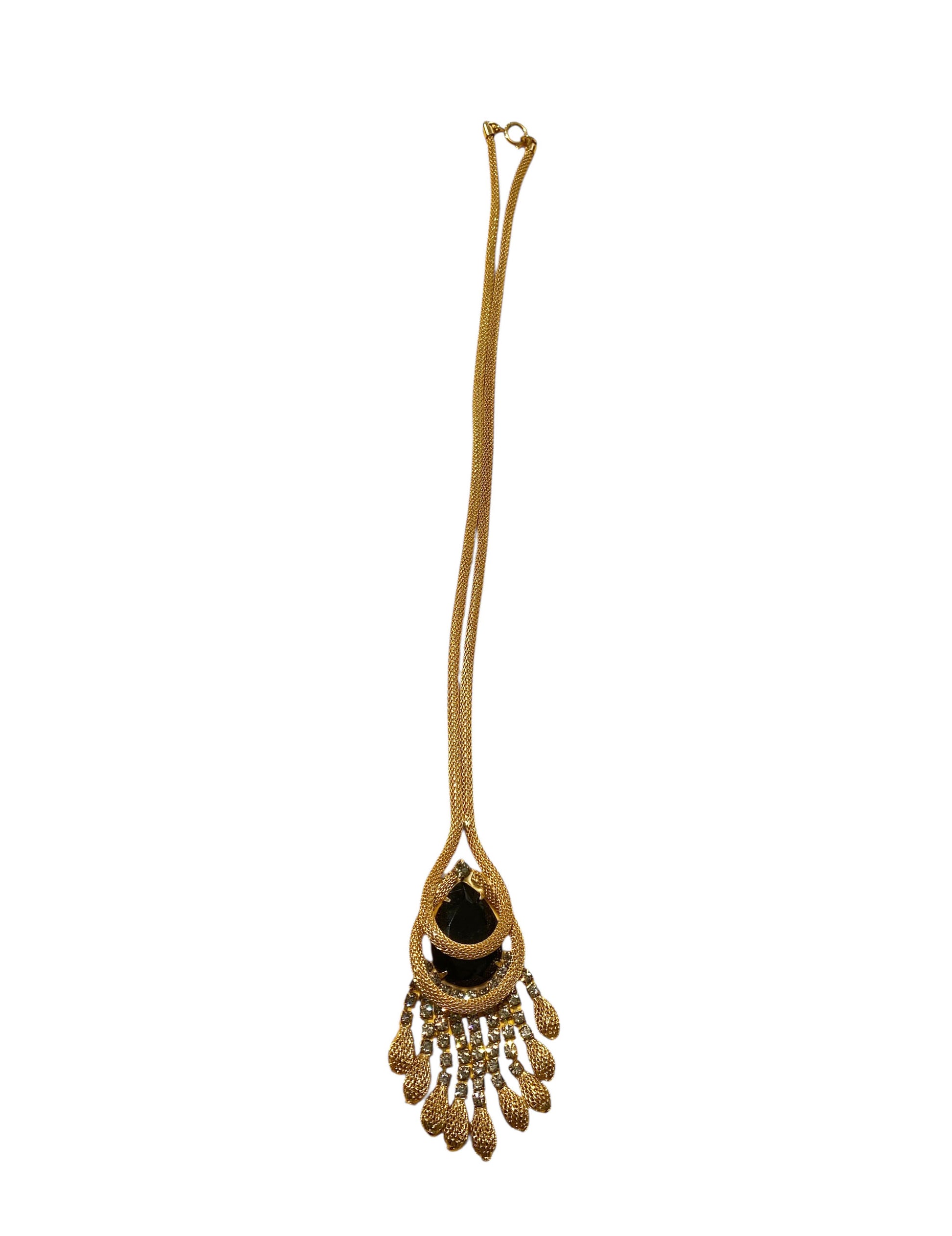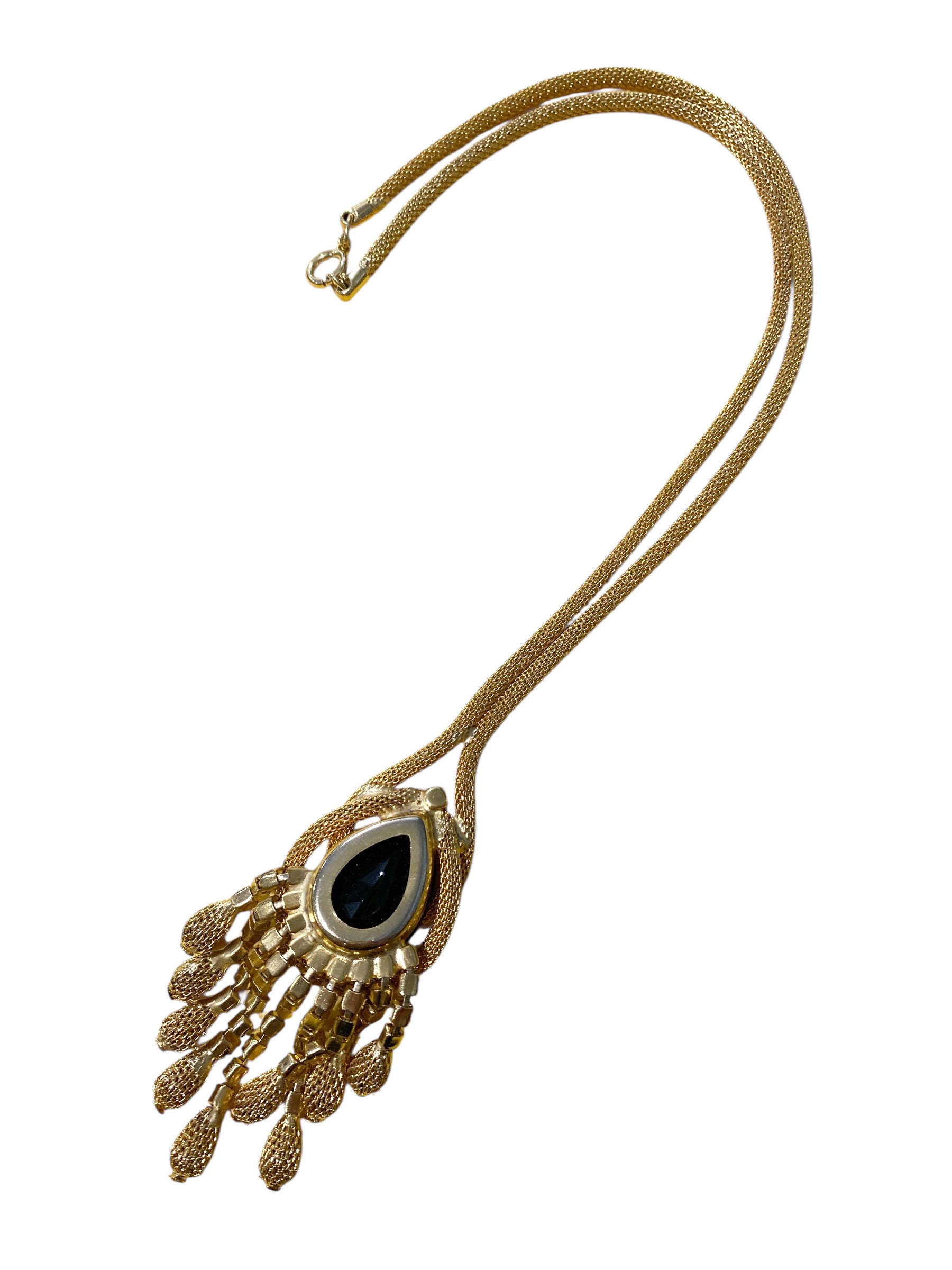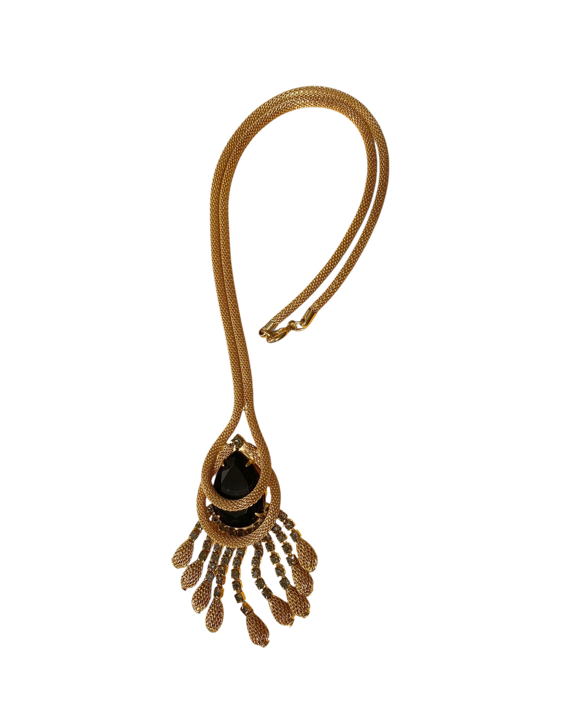 This vintage gold-tone mesh chain showcases a black faceted rhinestone pendant adorned with nine pear-shaped drops and square glass diamond details. The pendant measures 2" in width and 1/2" in depth, with a total length of 12.5". It remains in excellent condition, embodying classic sophistication.