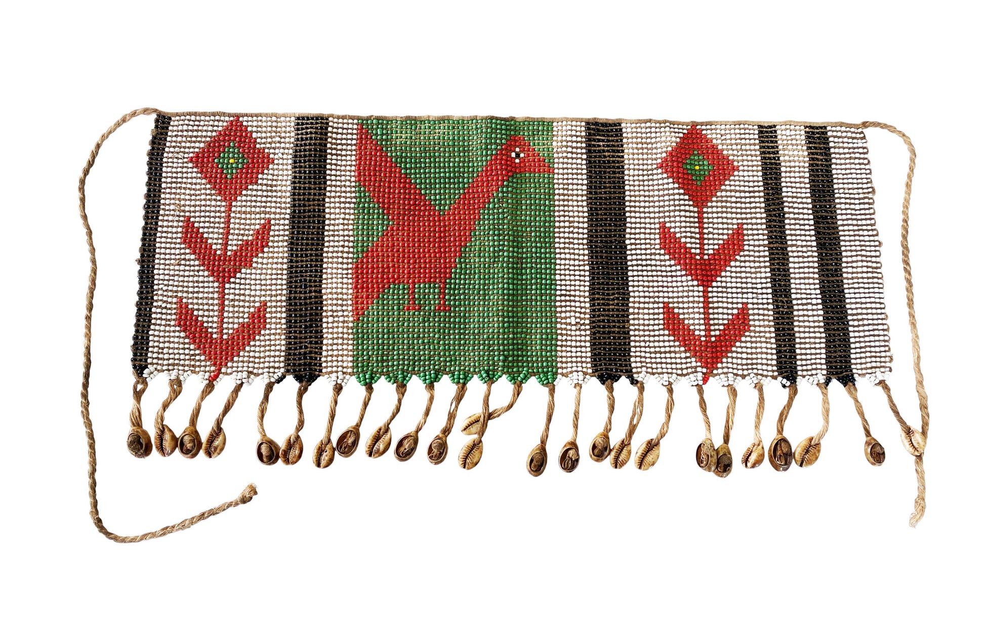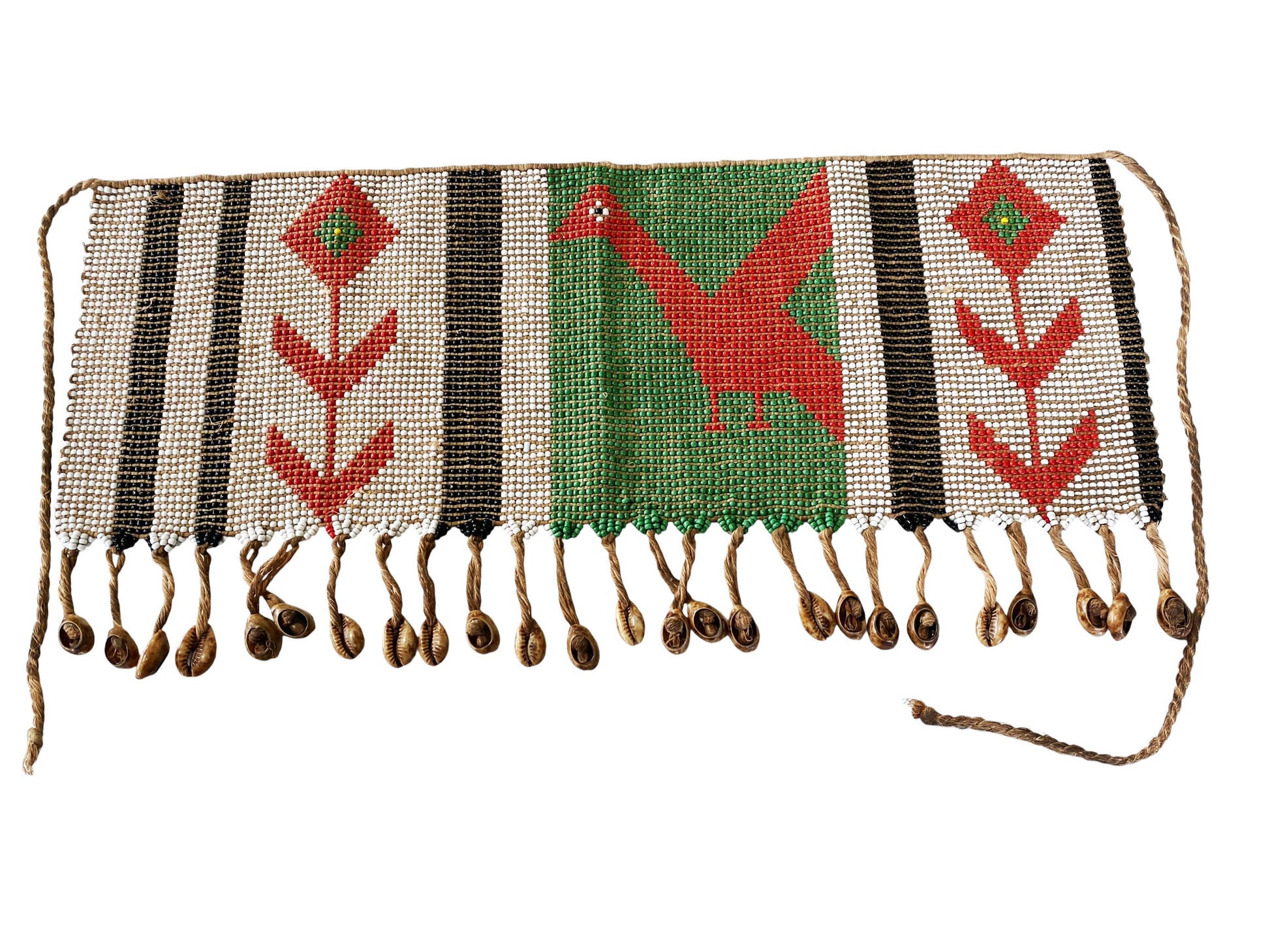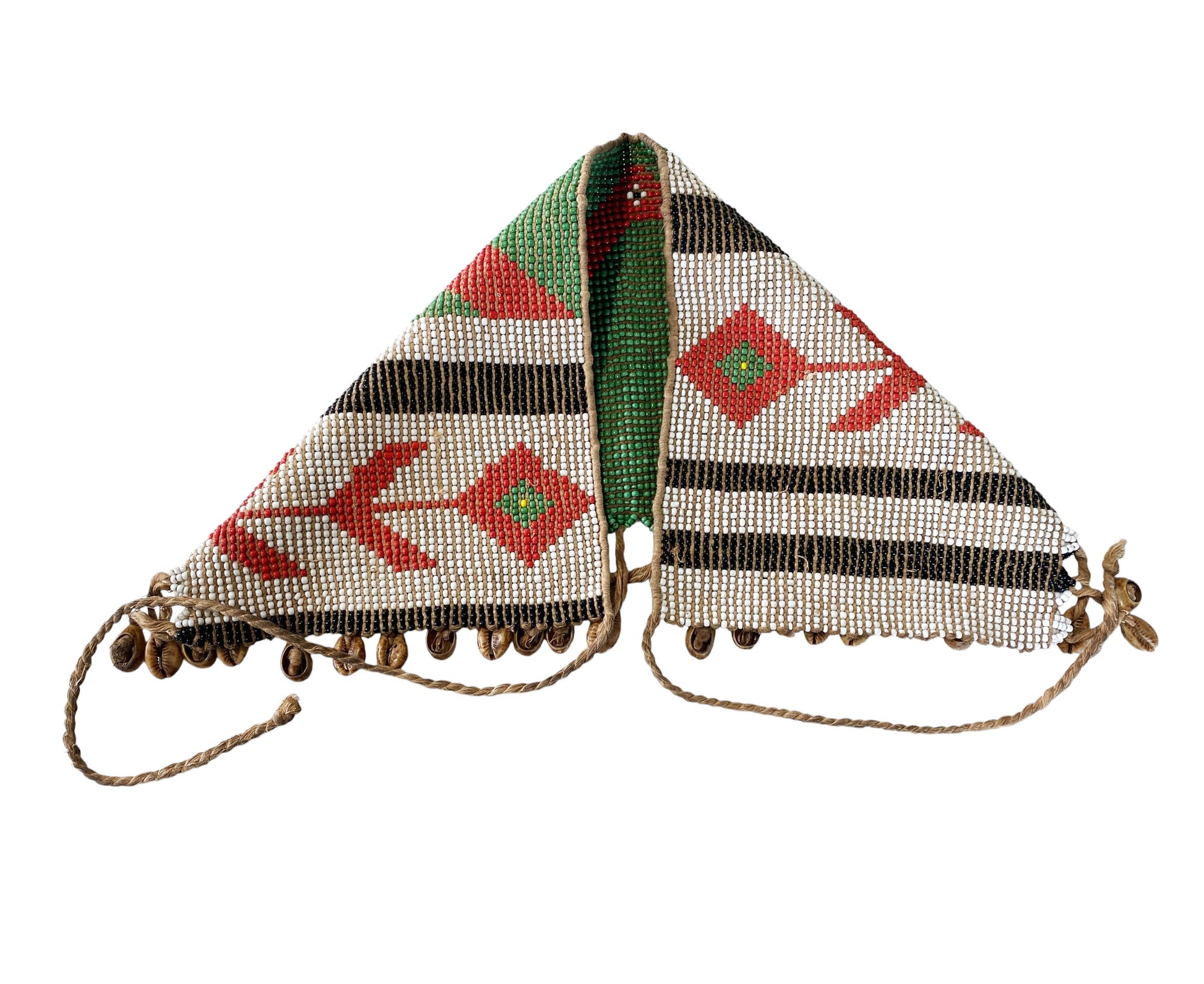 This exquisite skirt or apron is meticulously hand-beaded with vibrant colors, measuring 18" wide by 8.5" high. Among certain Cameroonian communities, women traditionally wore pubic aprons, known as 'caches sexes'—meaning 'to hide the sex'—until around 1961, when laws mandated full clothing. Despite this, the custom endures through elaborately beaded versions still worn today. In the Mandara mountains region, Matakam women crafted these aprons from small iron strips secured by fiber belts, reflecting a rich cultural heritage.