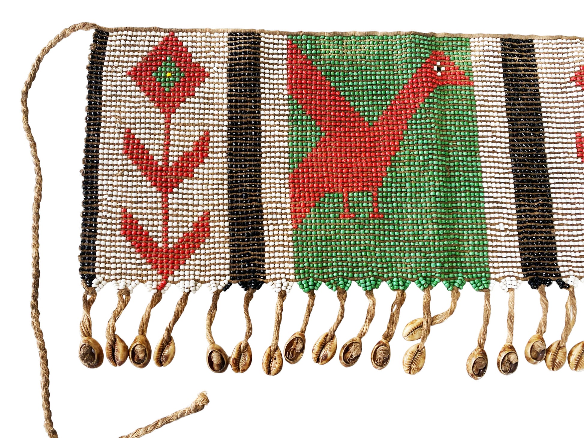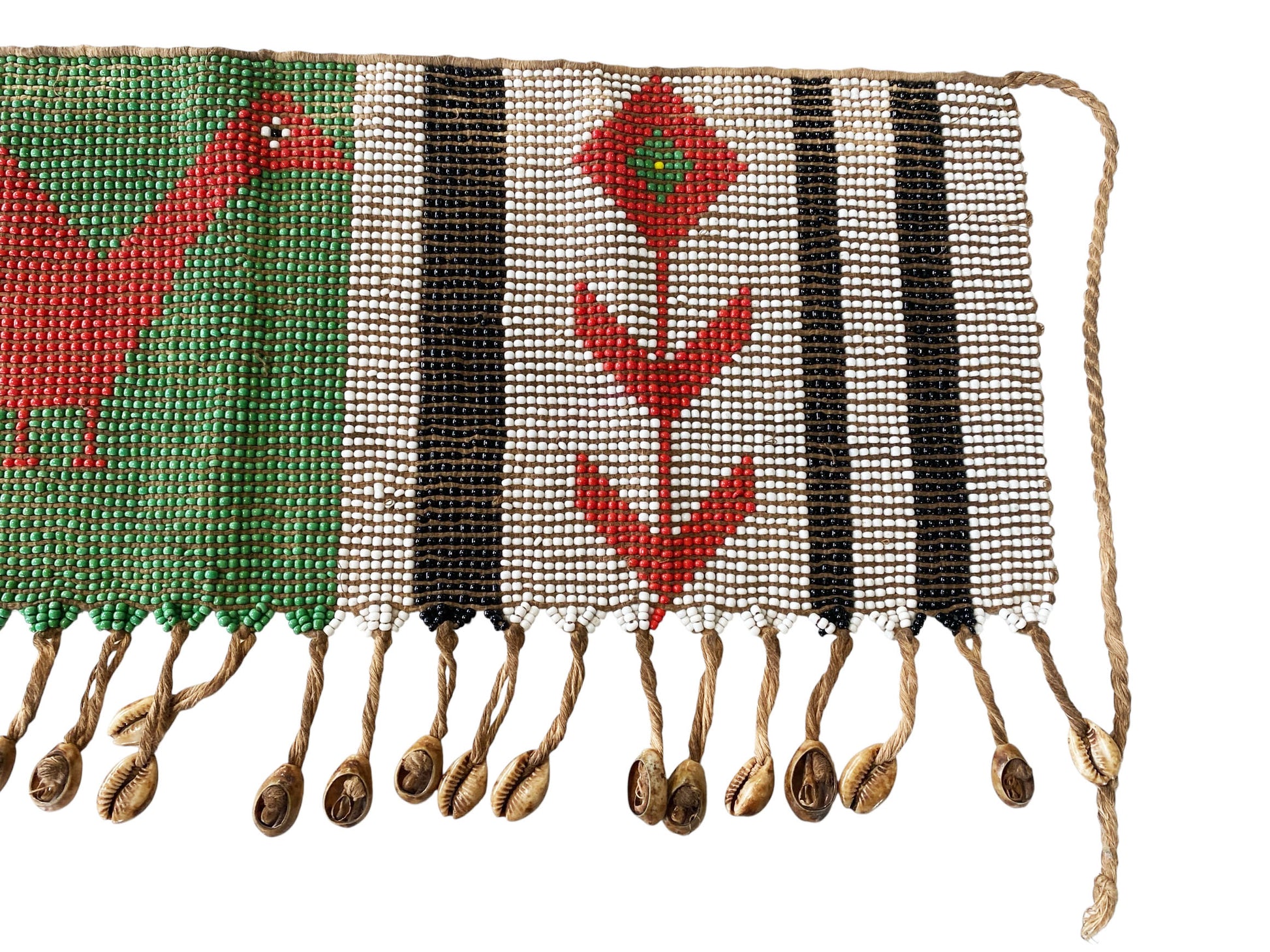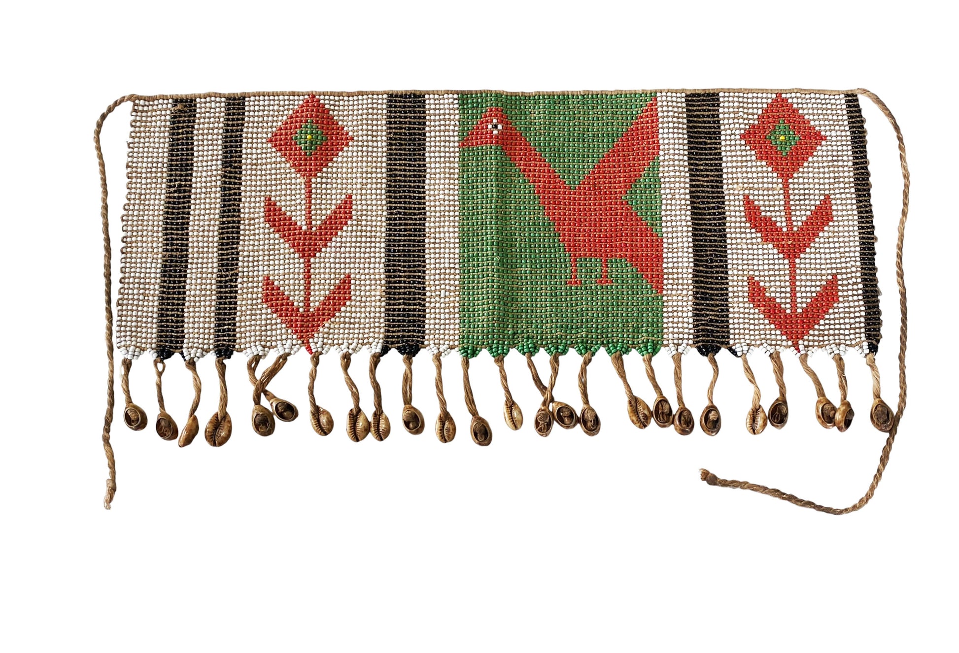 This exquisite skirt or apron is meticulously hand-beaded with vibrant colors, measuring 18" wide by 8.5" high. Among certain Cameroonian communities, women traditionally wore pubic aprons, known as 'caches sexes'—meaning 'to hide the sex'—until around 1961, when laws mandated full clothing. Despite this, the custom endures through elaborately beaded versions still worn today. In the Mandara mountains region, Matakam women crafted these aprons from small iron strips secured by fiber belts, reflecting a rich cultural heritage.