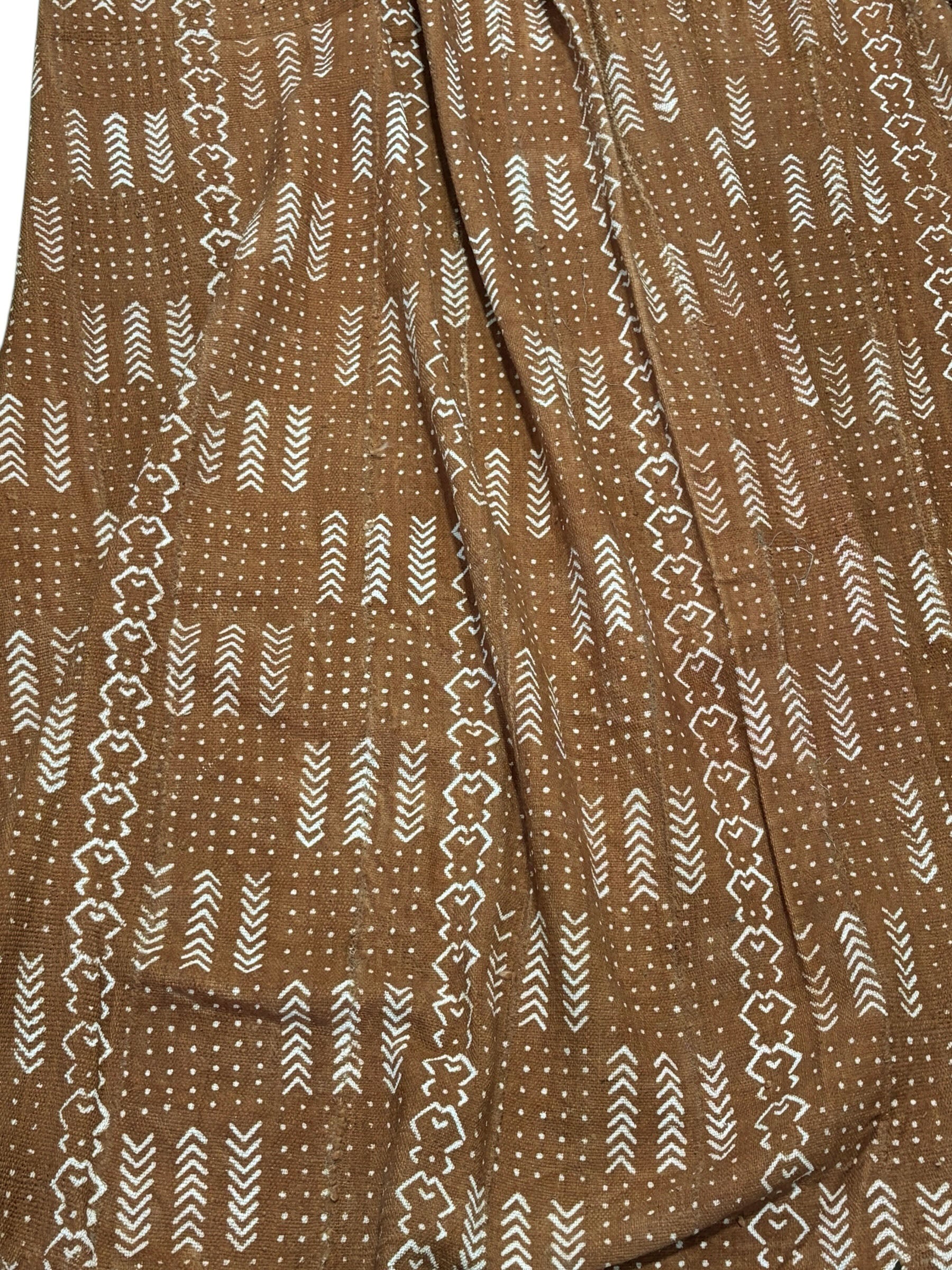 Authentic vintage Malian mud cloth handwoven by Bamana artisans. This large textile features geometric patterns in brown and white, created through traditional fermented mud dyeing and hand-stamped design techniques. Measures 87" x 62".