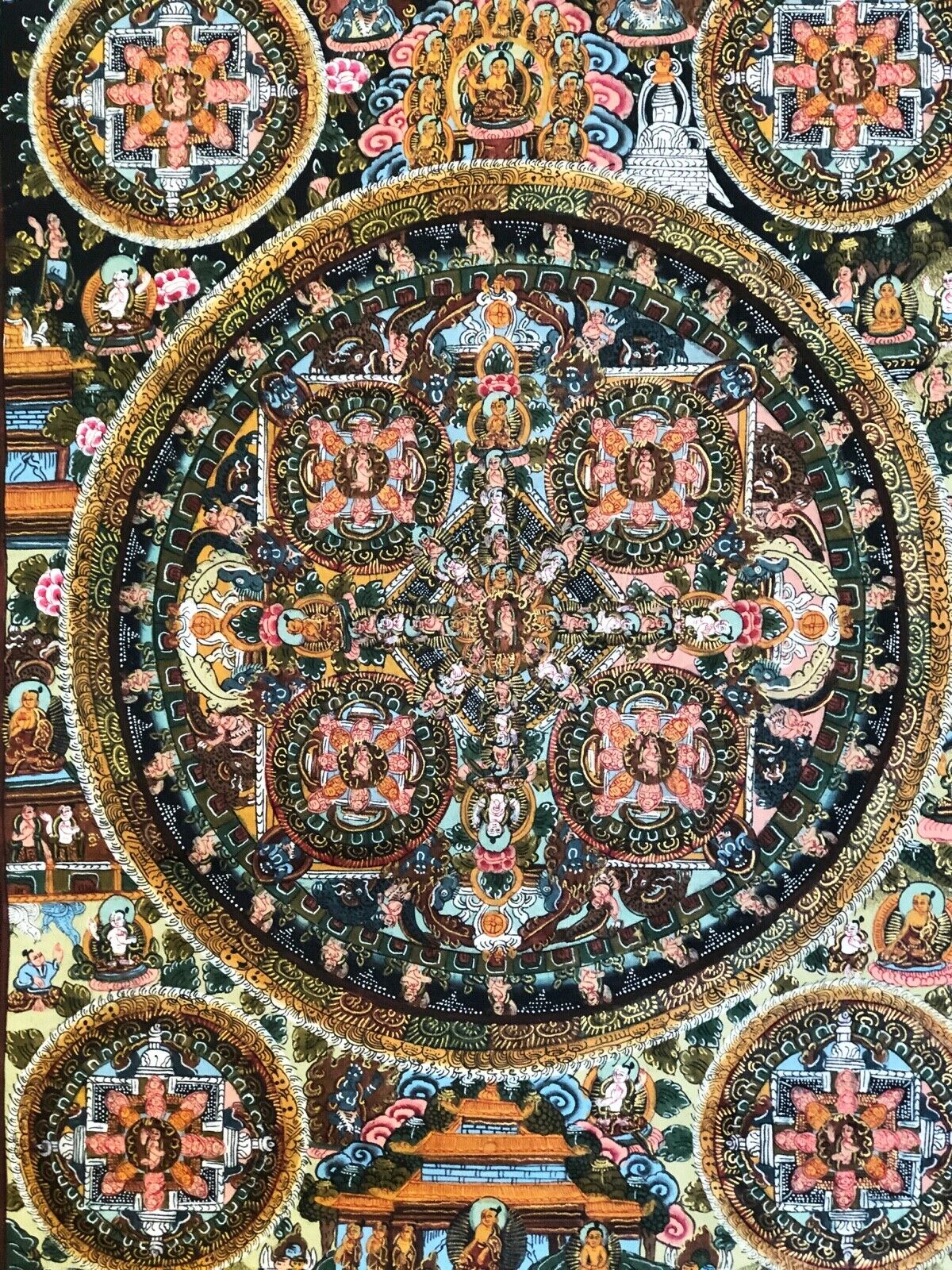 , have elaborate compositions including many very small figures ,framed with a pink and dark blue fabric .with real gold lines painting ,around hundred figures and deities ready to be hanged ....no words to describe the beauty of this work .thanks