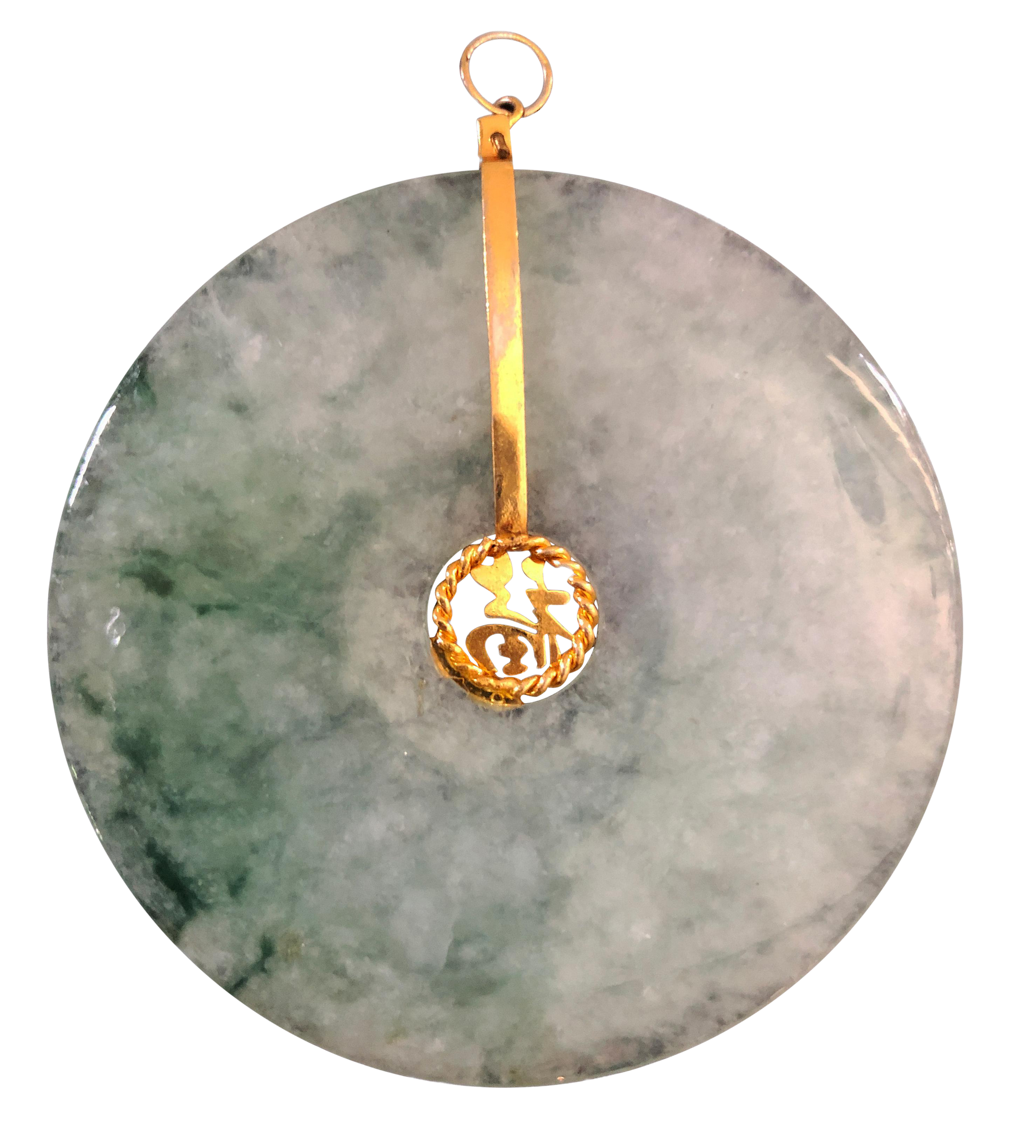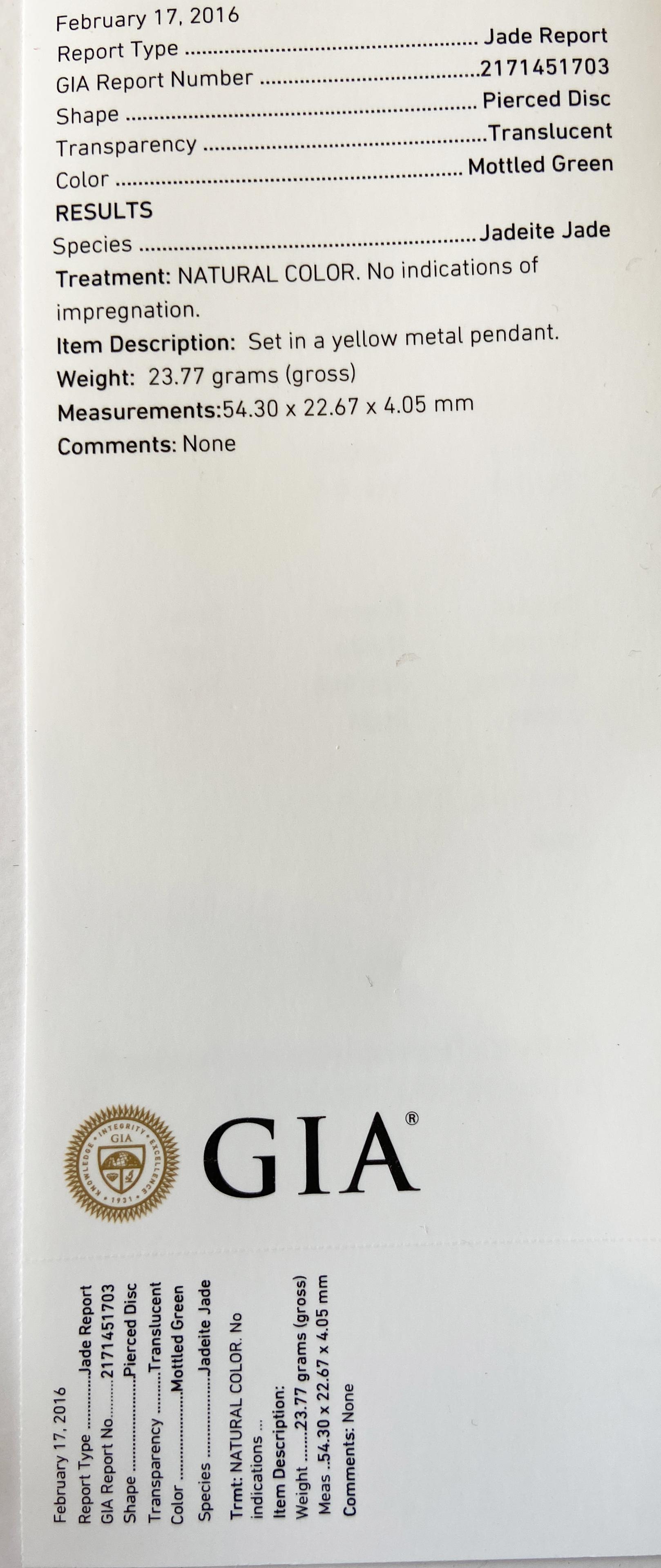 Vintage mottled green jade pierced disc pendant with Chinese good luck characters in the center and set in a goldtone metal. W/GIA Certificate included. Total weight: 23.77 grams