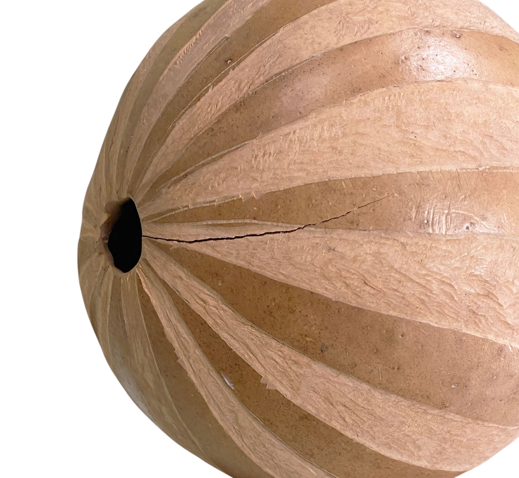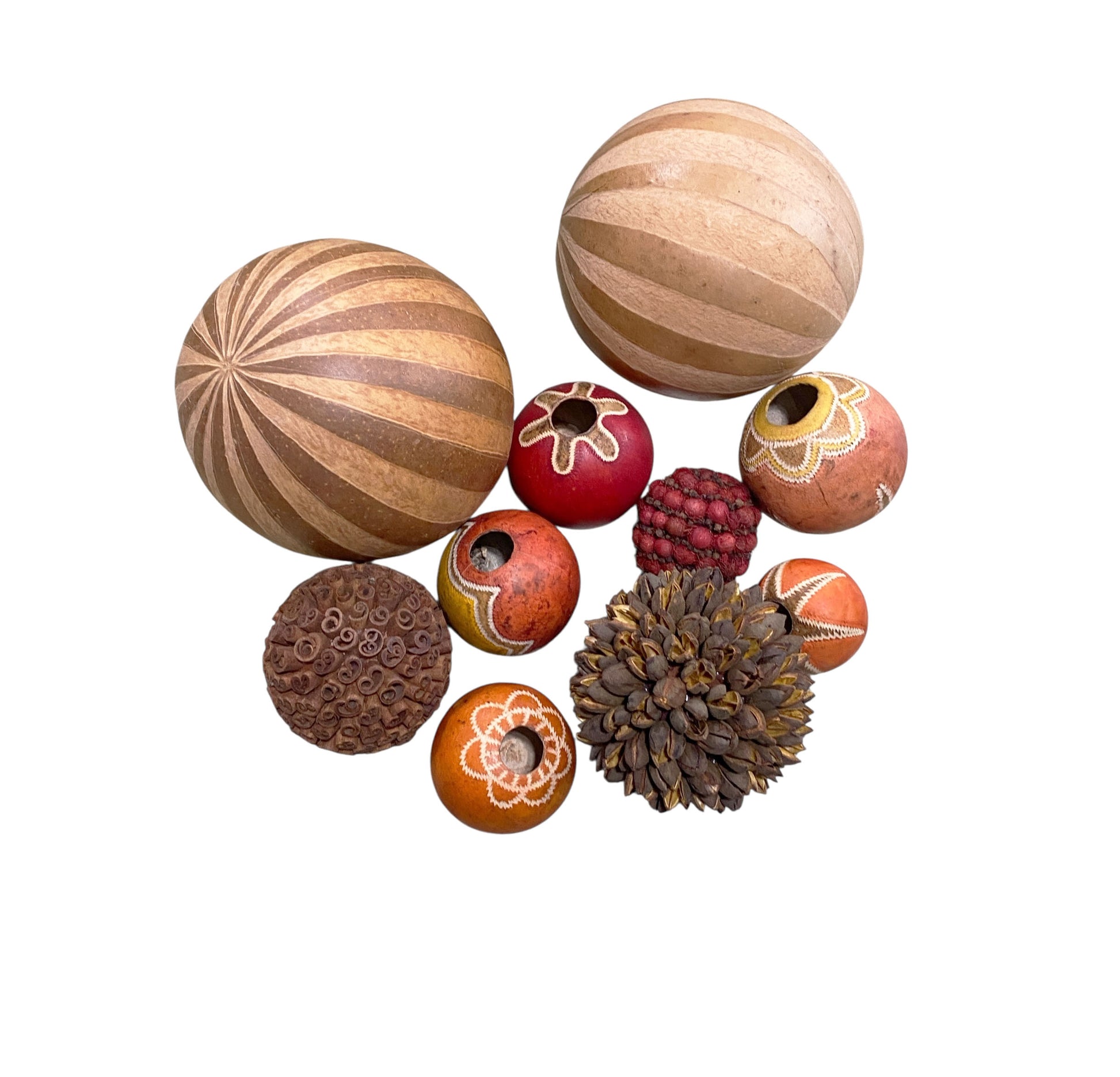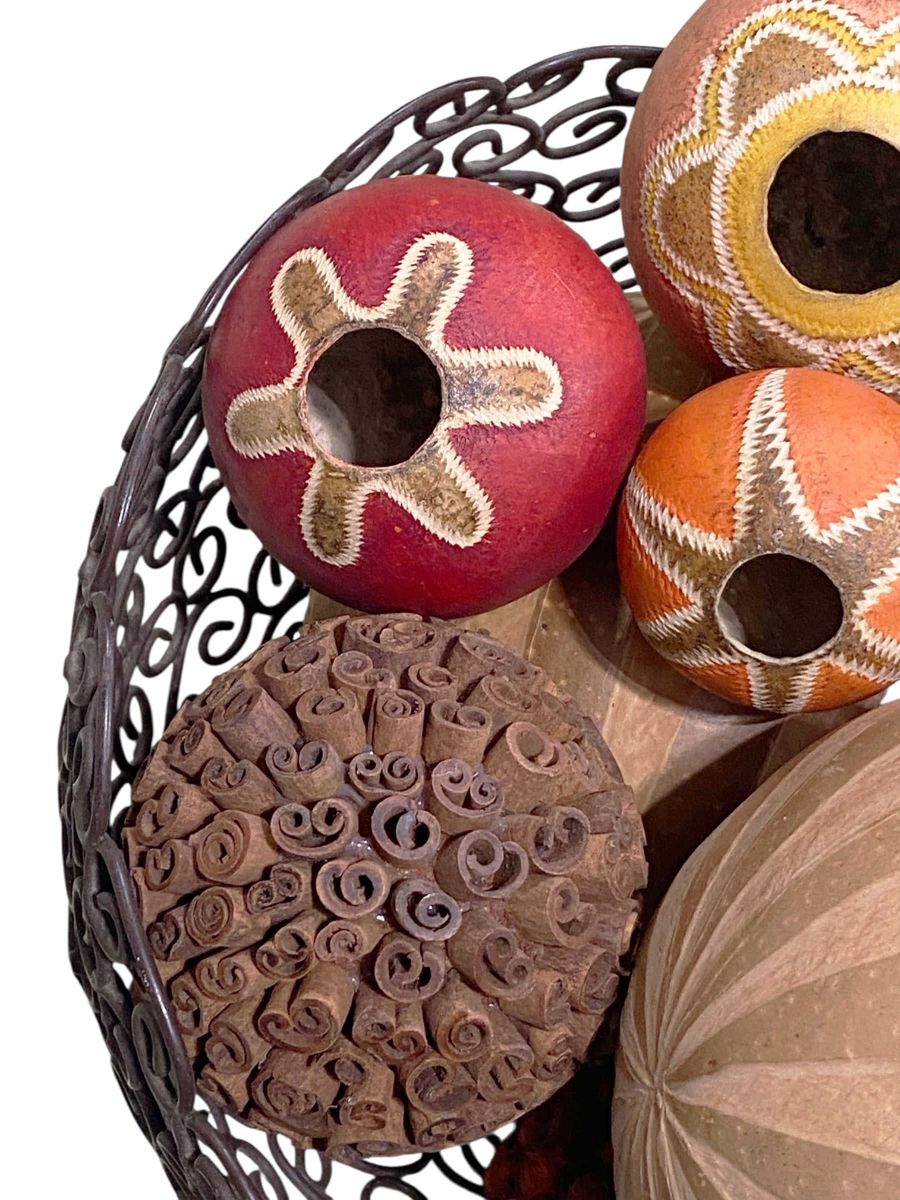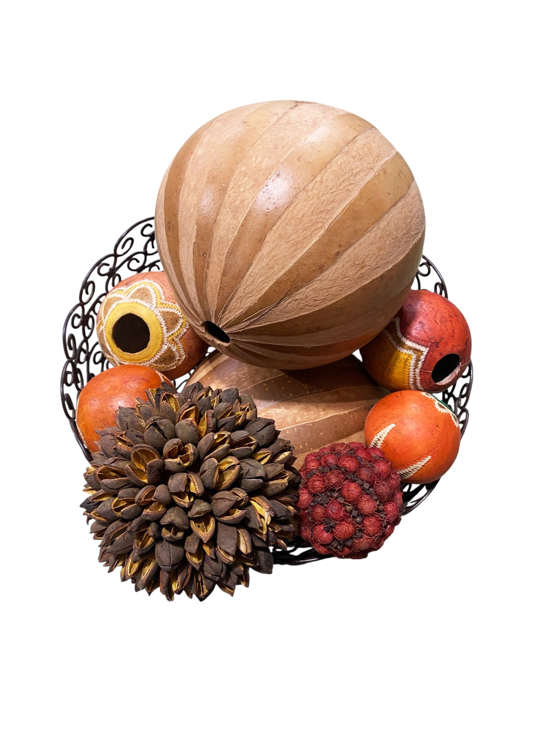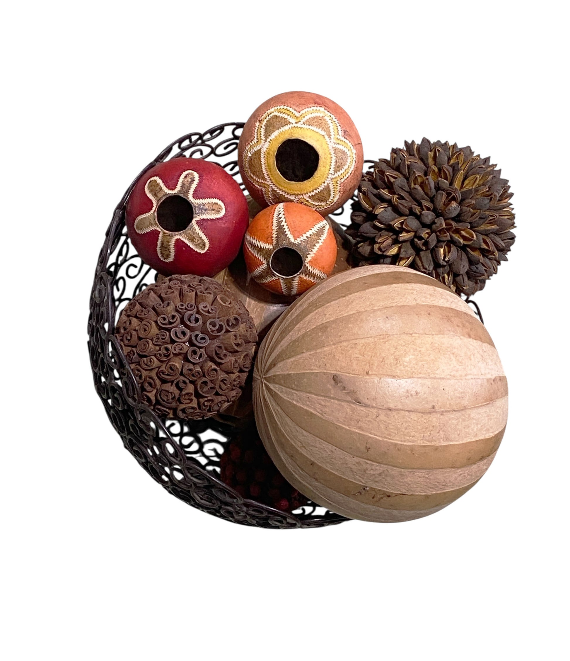 This open iron basket contains seven handmade gourd balls of varying sizes, along with one cinnamon ball and two Brazilian Amazonian seed balls, each individually painted. The basket measures 8" high with an 11.5" diameter. The balls range in diameter from 2.5" to 6.5". One ball features a minor hairline crack, but overall the set is in good condition.