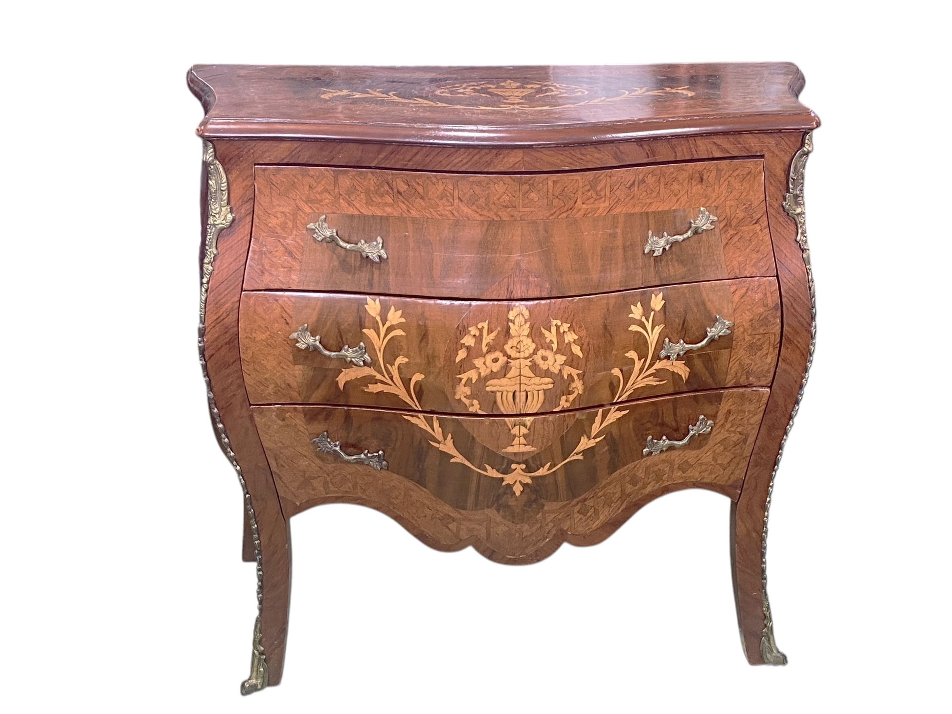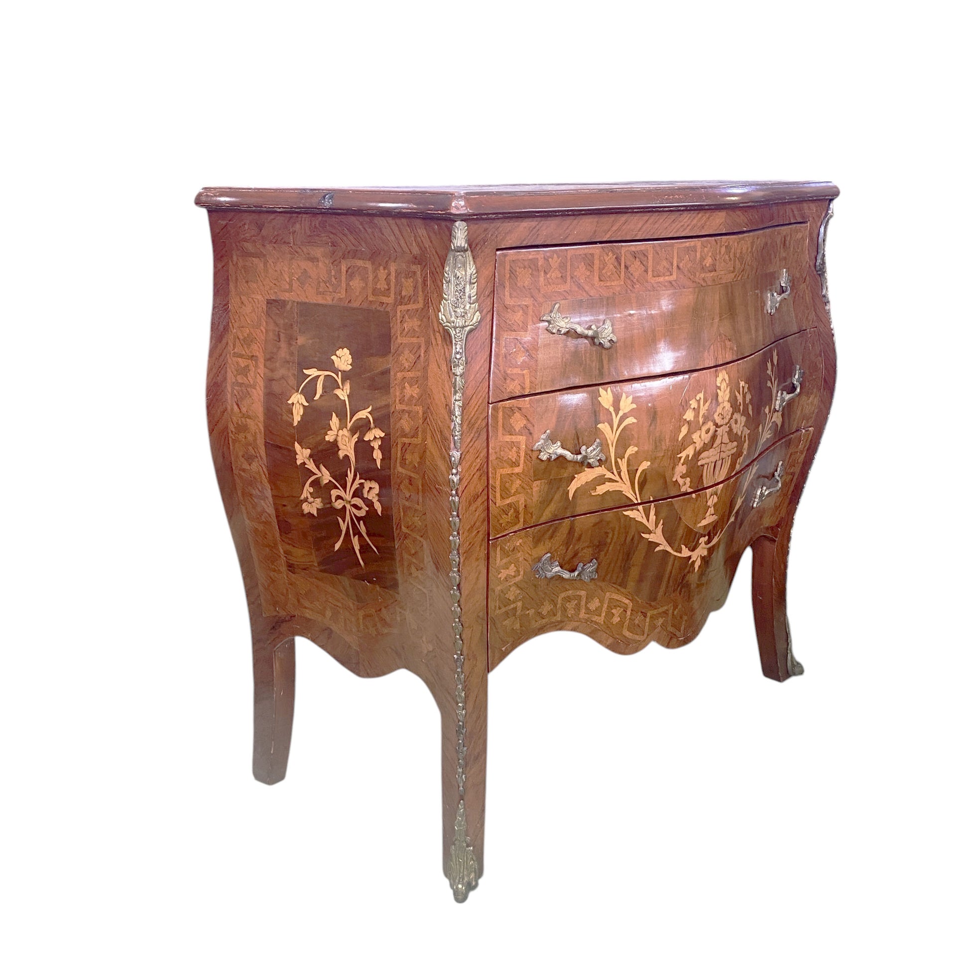 This exquisite Louis XV-inspired bombe commode adorned with intricate floral marquetry inlay the piece is complemented by authentic bronze and brass hardware. Measuring 34" wide by 17" deep by 31" high, it functions beautifully as a side table or accent chest. The vintage patina reflects honest wear consistent with age and use.