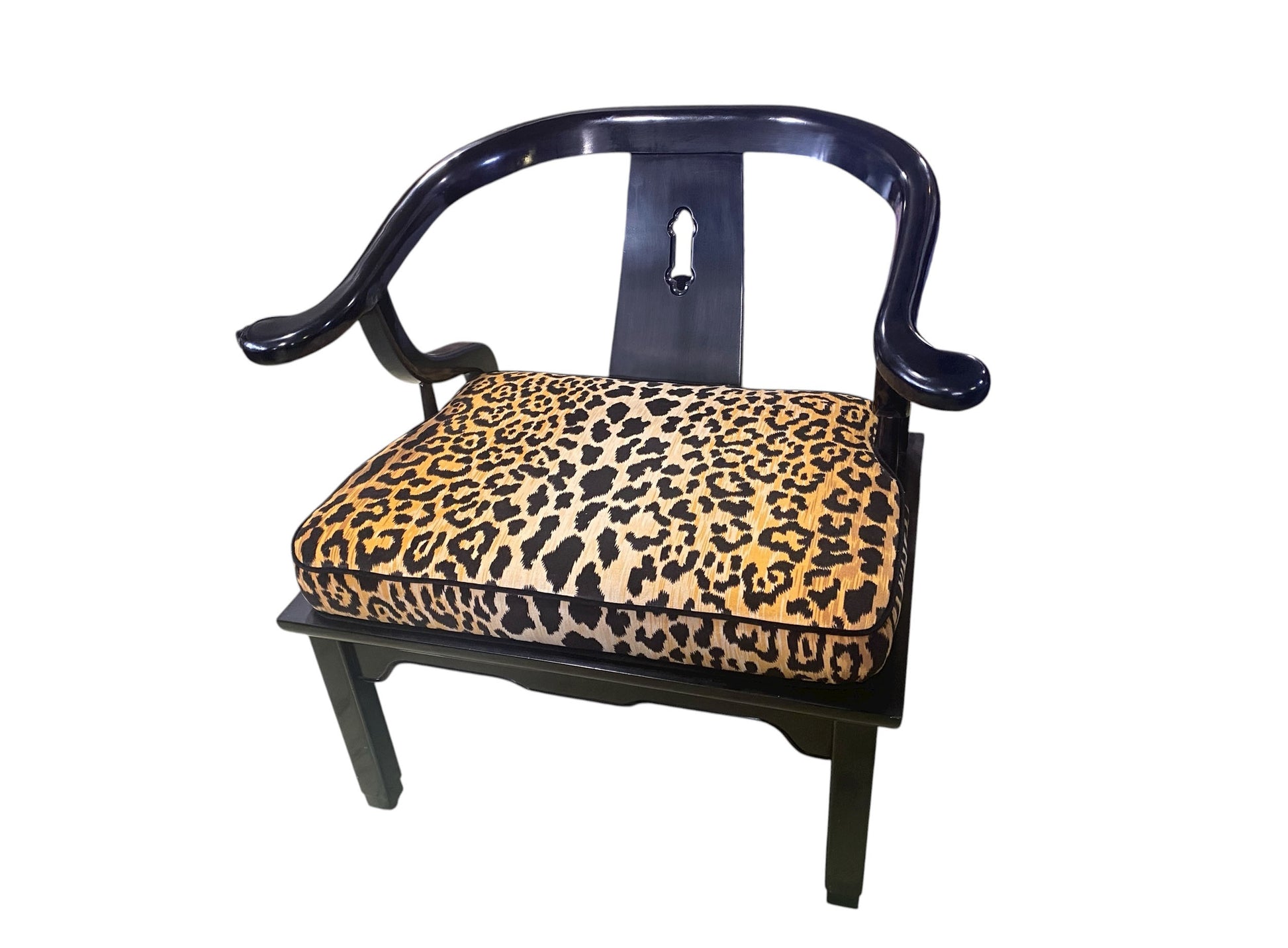 This exceptional mid-century club chair exemplifies the refined aesthetic of James Mont's iconic designed for century furniture . Featuring a distinctive horseshoe back silhouette and lustrous black lacquer finish, circa 1960s- Recently reupholstered in sumptuous velvet with an animal print textile, the chair combines vintage elegance with contemporary comfort.