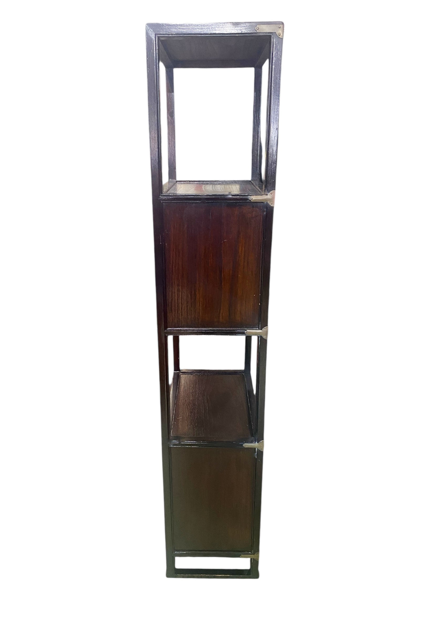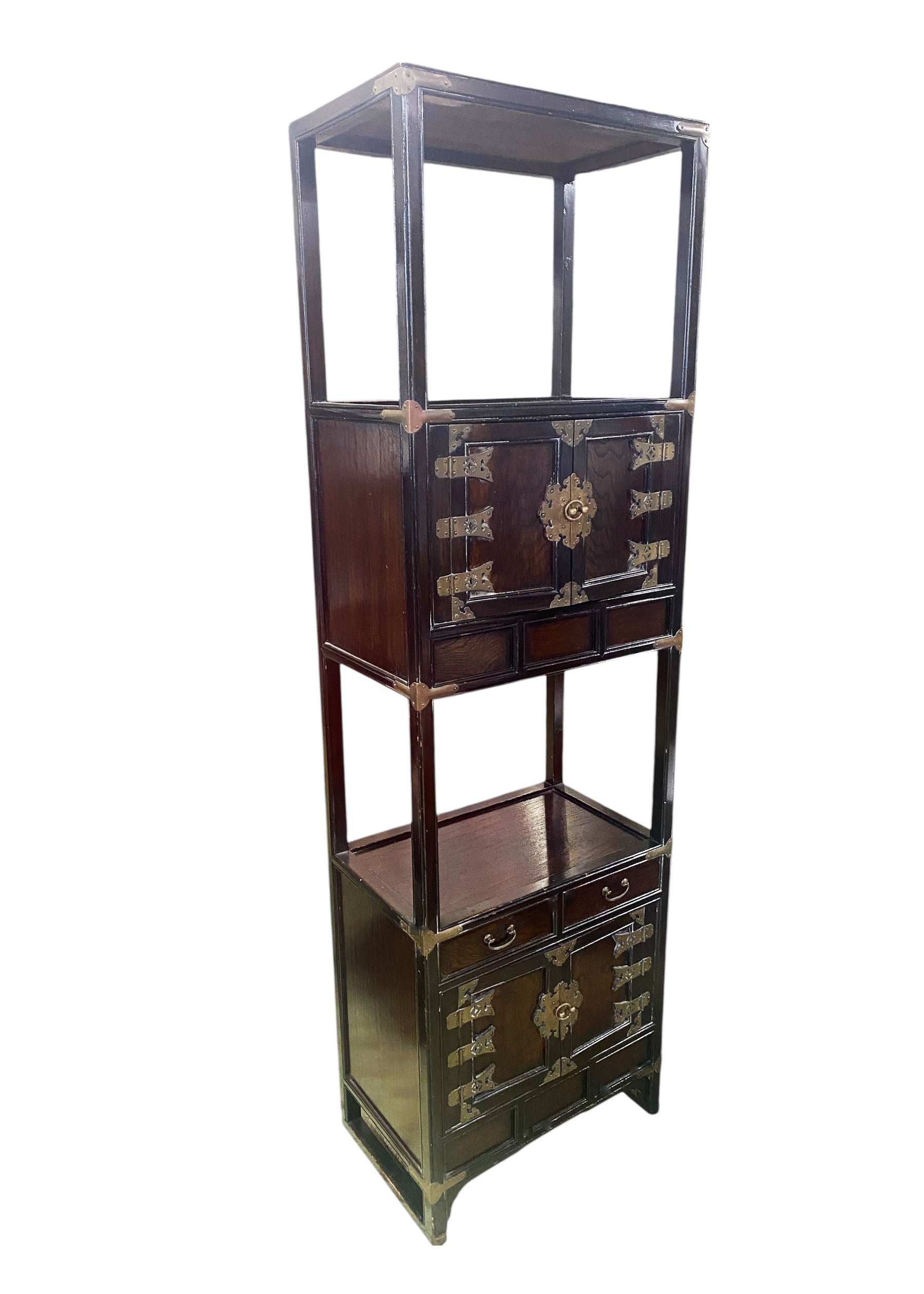 Elegant old circa 1930 's Known in Korean as chaekjang , this cubic etagere consists of two open shelves and a middle and lower storage space with doors . High relief brass forms designs and patterns refer to the various shapes that were used to adorn the pieces for longevity ,and good fortune etc.. Books, curios, porcelains and scholar objects would be showcased to the guest as a reflection of the culture of the owners. 20" w by 66" h by 13" D .