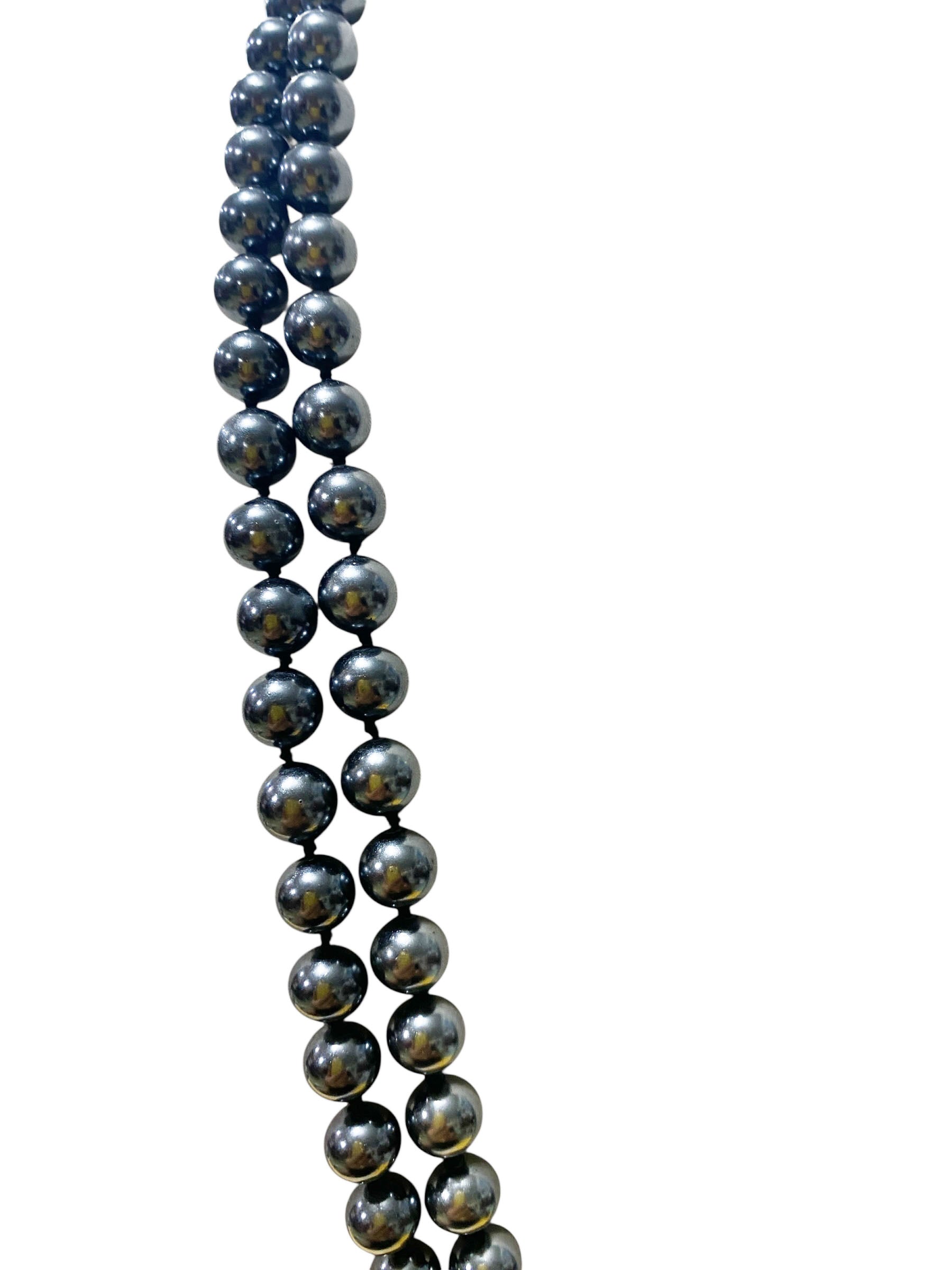 This vintage necklace features a long two strand of black faux pearls with an oval simulated beige pearl Slide golden Clasp , creating a stylish and unique accessory. The beaded style adds a touch of elegance to any outfit, with the black color of the pearls giving a classic and timeless look. Perfect for adding a touch of vintage flair to your ensemble, this necklace is a versatile piece that can be worn for various occasions. 23” long.by 1.25" W by 0.75" D