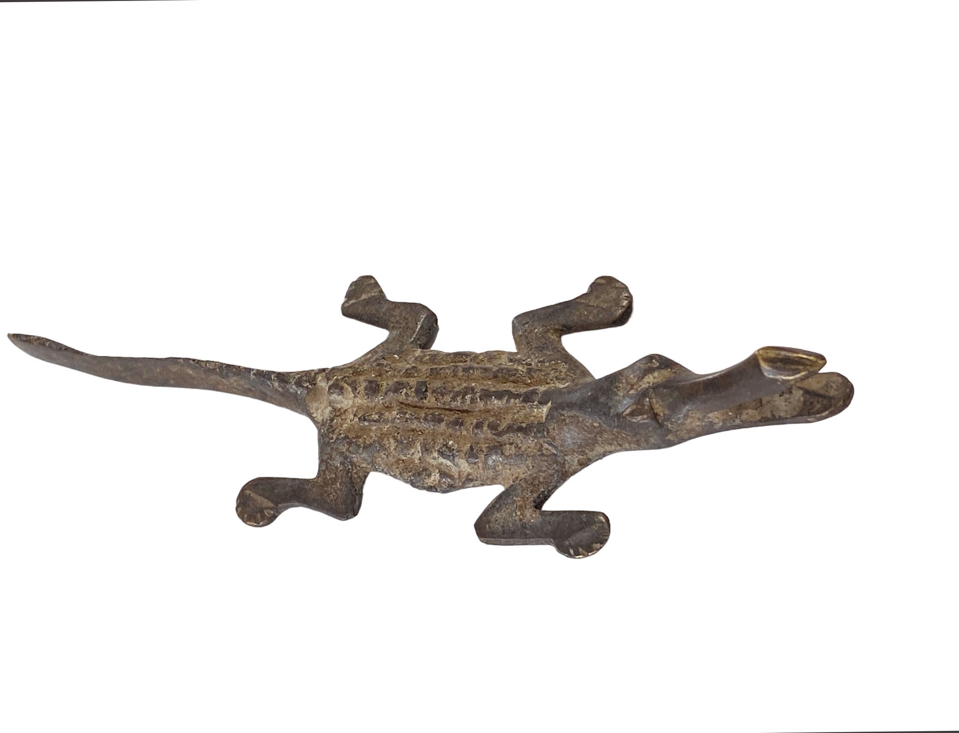 Crafted by the Lobi ethnic group of Burkina Faso, this bronze gold weight piece of a crocodile is a unique, Previously, the use of gold was restricted in Africa due to the limitations of Islam. Gold trading often incorporated bronze figurines called mrammuos, representing human/animal forms or abstract designs. hand-shaped made using the old-fashioned lost wax technique. The crocodile, which is believed to bring protection, is regarded as an amulet of power among the Lobi. Molten bronze is poured into a clay mold containing the wax figure and the wax melts, leaving a one-of-a-kind cast. After each casting, the clay mold is destroyed.