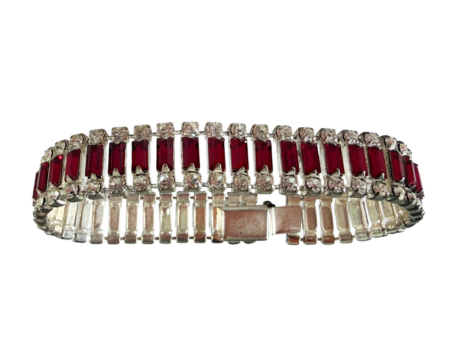 #33 Delicate White Gold tone Bracelet W/ faux Ruby Baguette Stones and Diamond