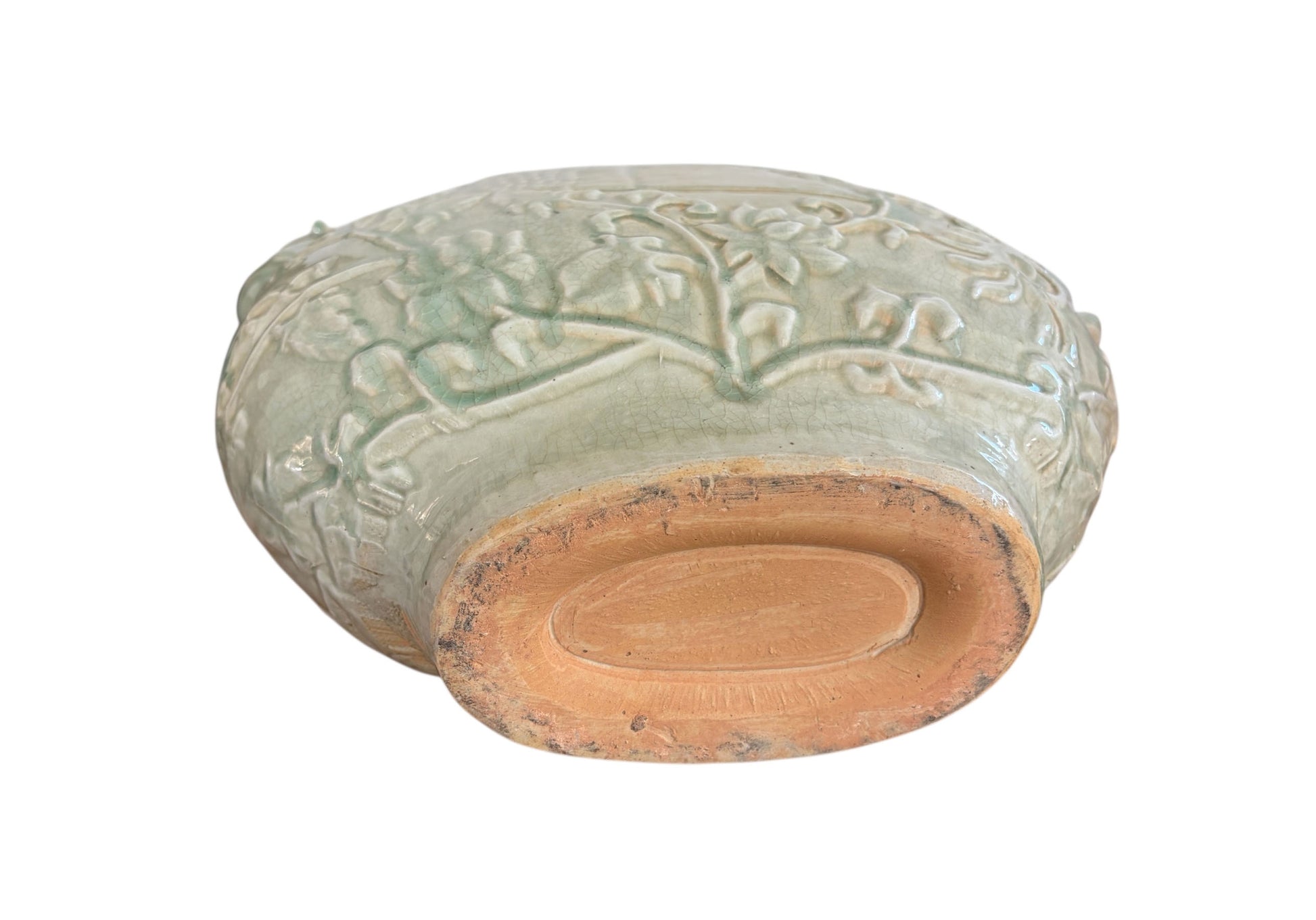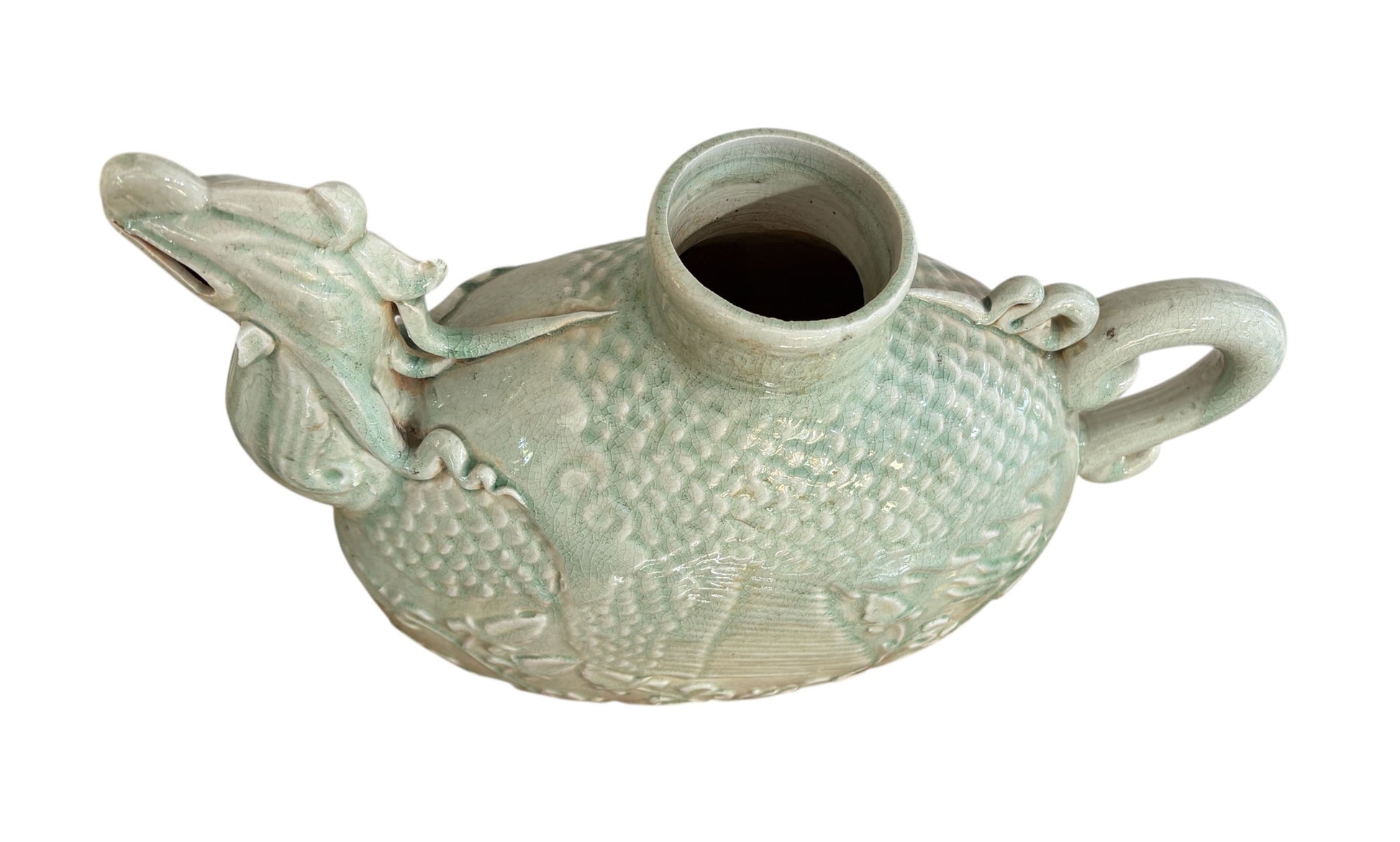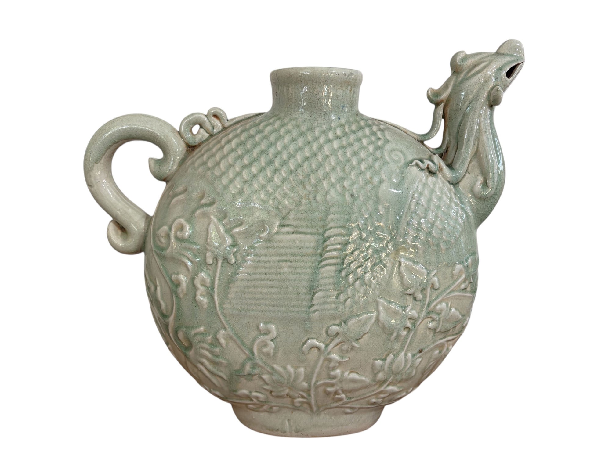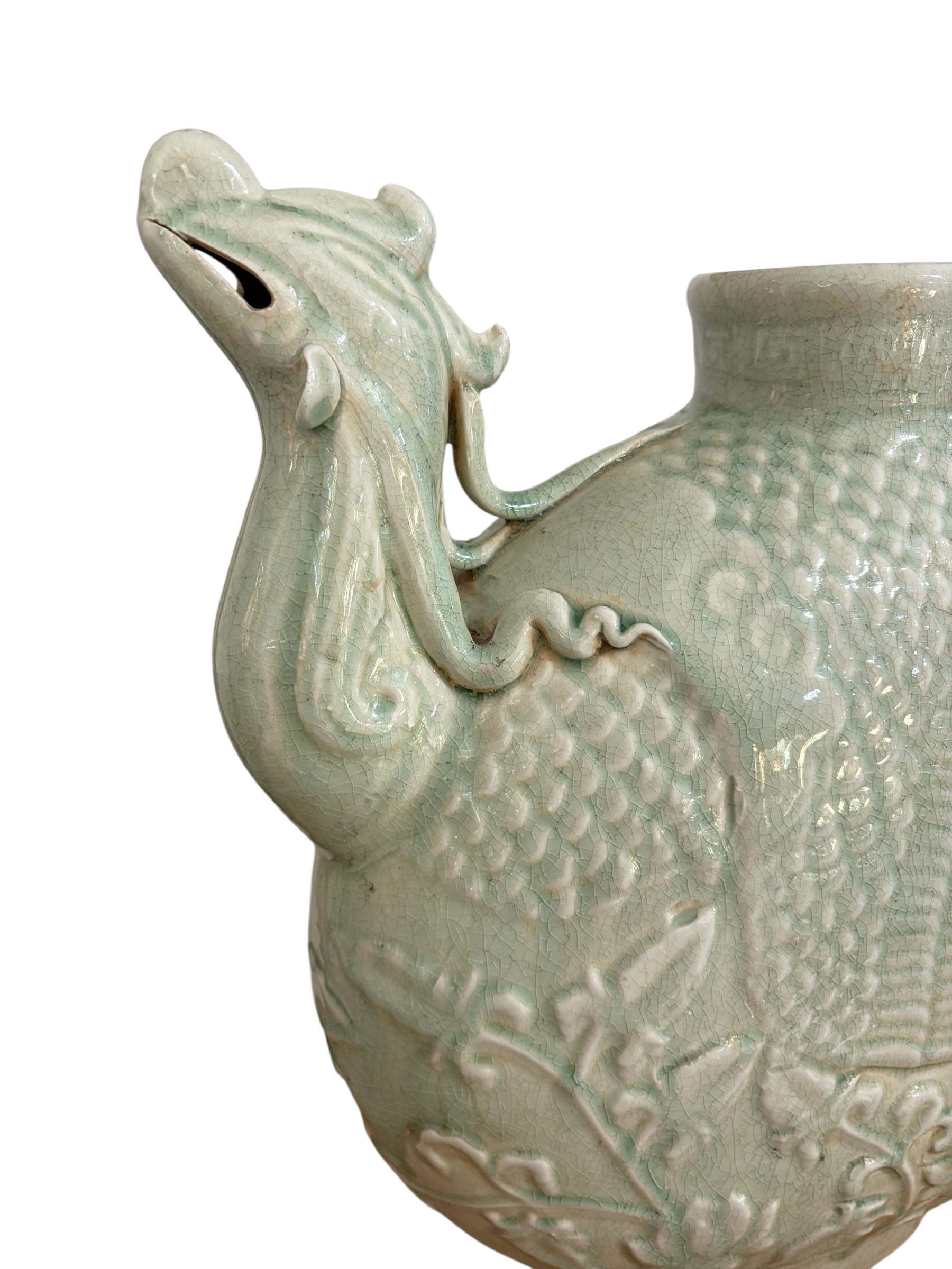 This exquisite celadon porcelain vessel captures the essence of Chinoiserie artistry through its phoenix form and luminous pale jade glaze. Measuring 17 inches in height with an 18-inch width and 6-inch depth, the piece exemplifies the symbolic significance the phoenix held in classical Chinese aesthetics. Historically reserved for imperial contexts, the phoenix motif conveyed celestial authority and divine favor.