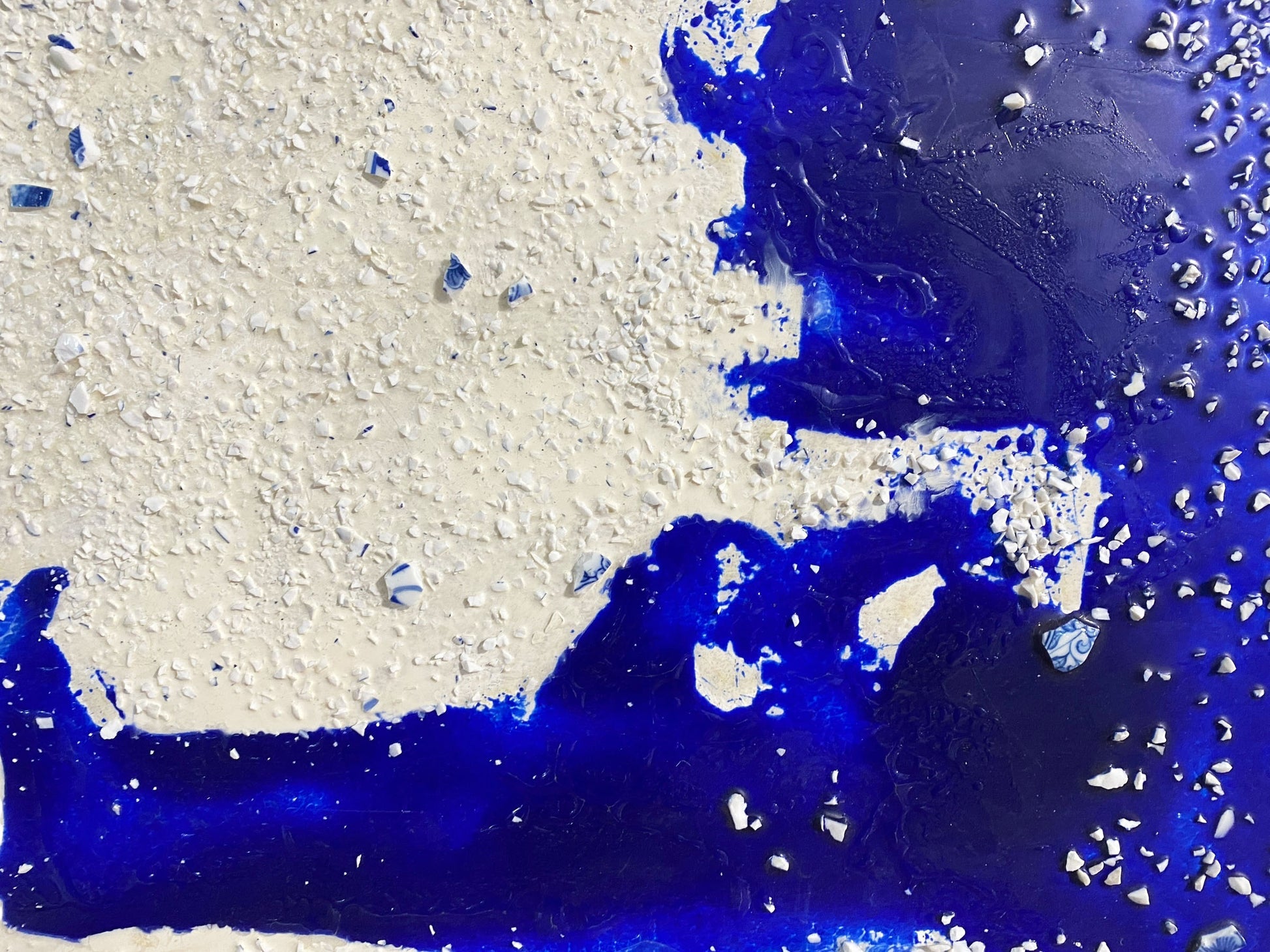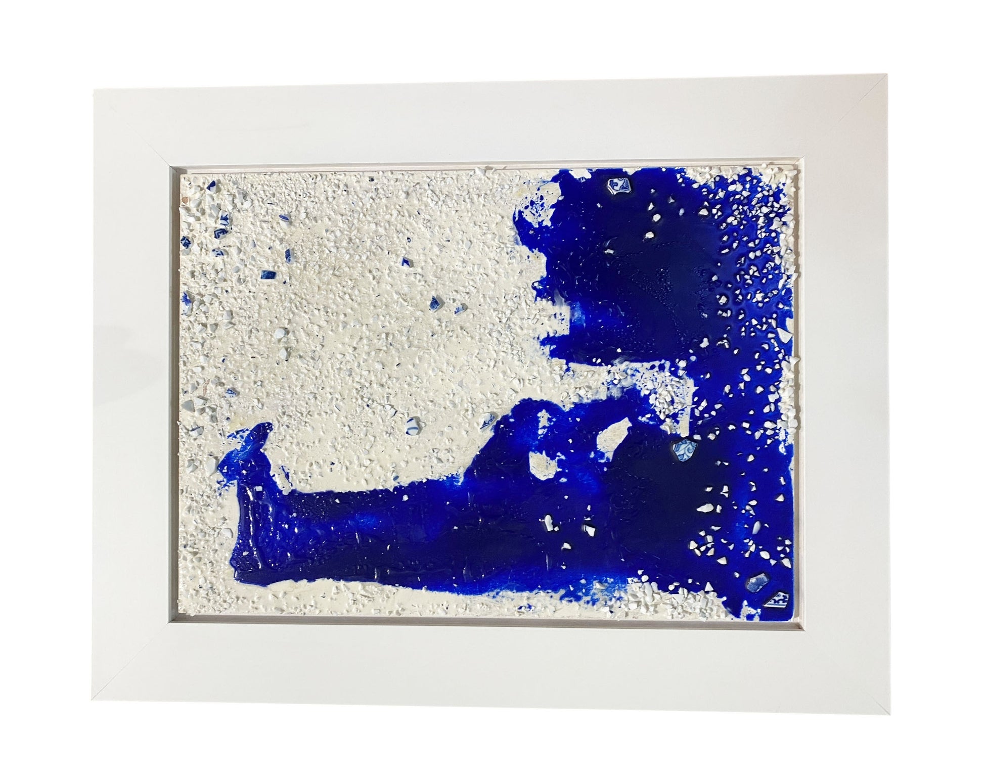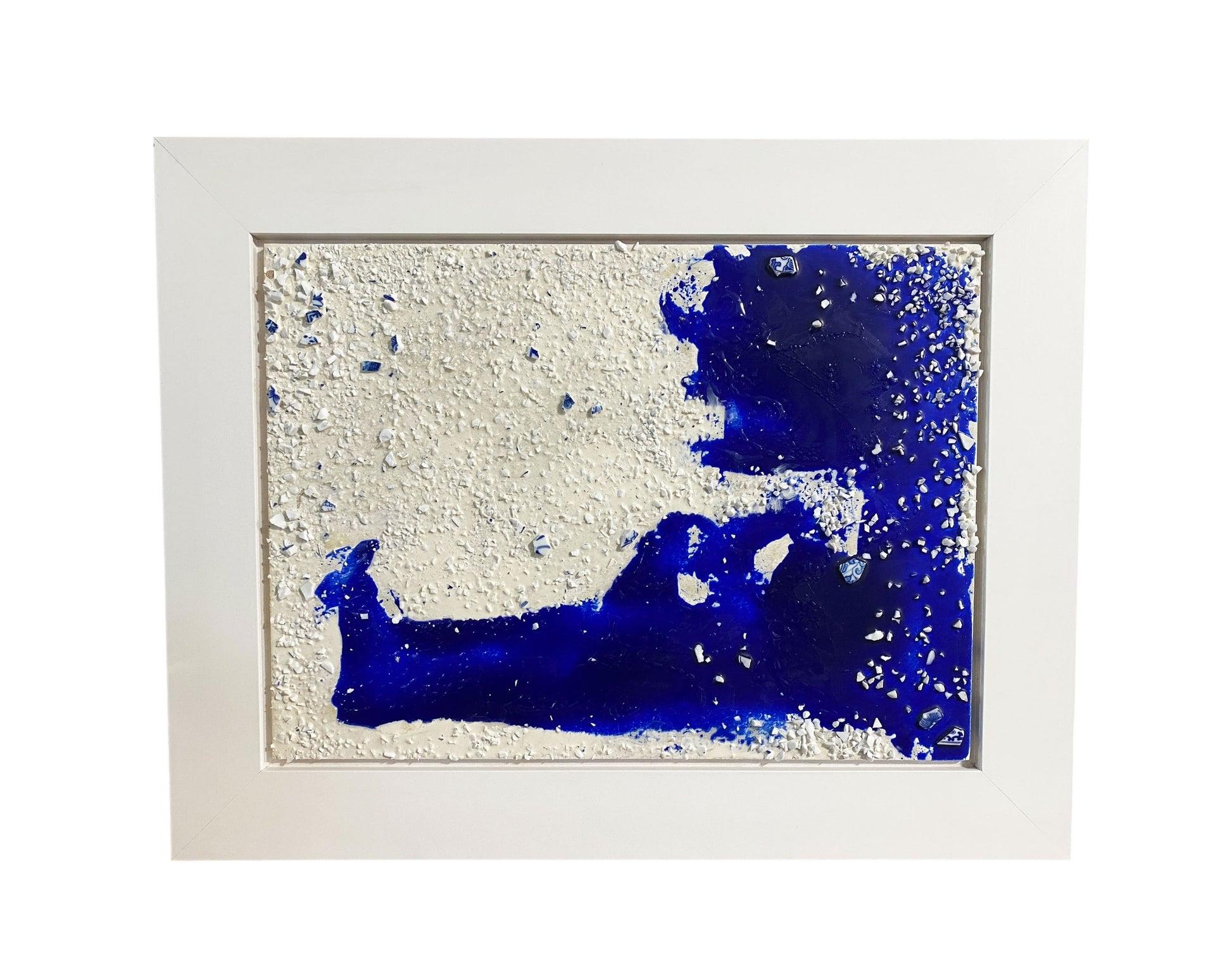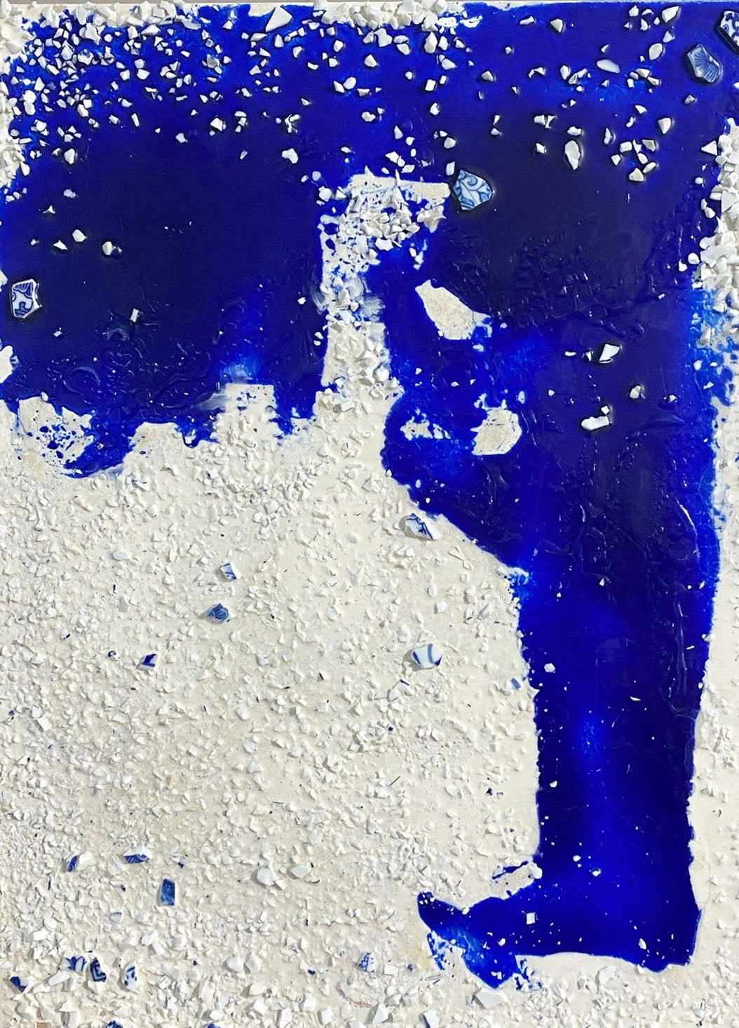 The mixed media artwork "The Path of the Clouds" by Argentinian artist Daniel Carranza channels subconscious emotion through recycled blue and white porcelain fragments. Inspired by his time in Jingdezhen, China, Carranza repurposed discarded ceramic shards to create an innovative visual language. Completed in 2017, the piece combines oil, resin, porcelain, and wood to explore abstract themes. Measuring 22.5 by 17.75 inches and framed for display, this work has been featured in solo exhibitions in New York and São Paulo, as well as group shows and book signings internationally between 1986 and 2014. A related film about the artist is available on YouTube "the path of the clouds "