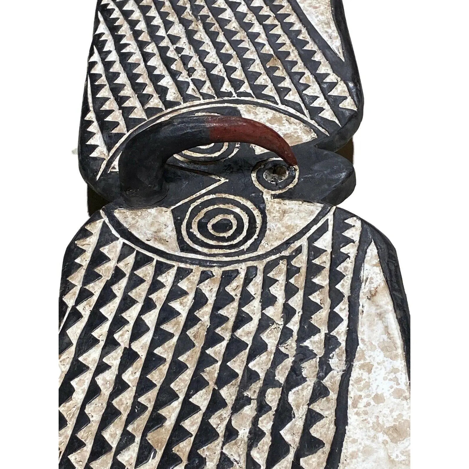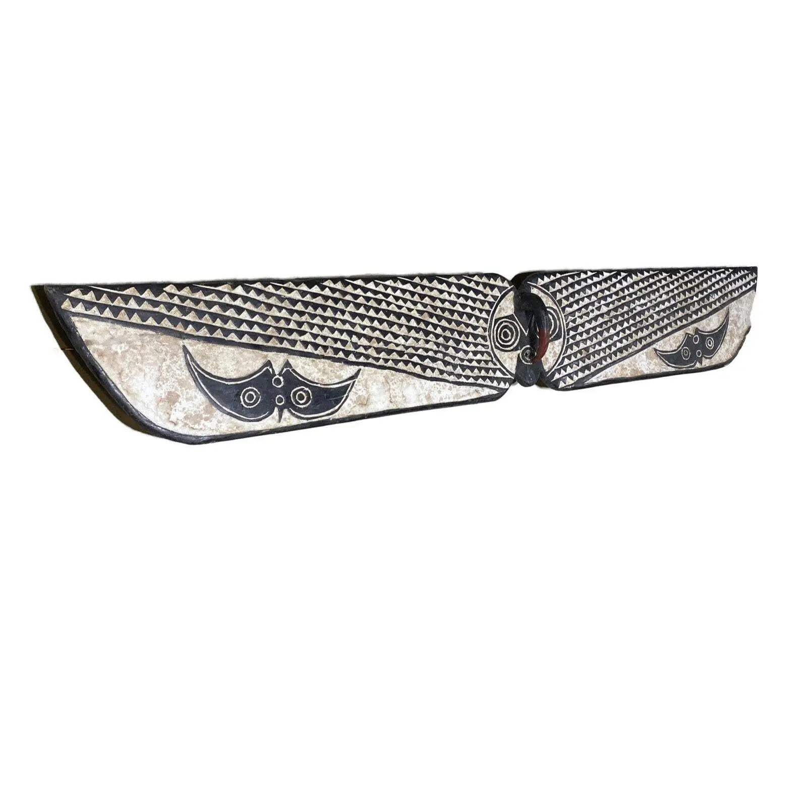 Large vintage horizontally-winged, carved wood Bat/ hawk or owl mask painted with natural pigment. From Burkina Faso. This dramatic mask, painted on both sides, represents a bird with outstretched wings. Known as the "butterfly" mask, and was worn by holding the mask by a rope attached to the back.