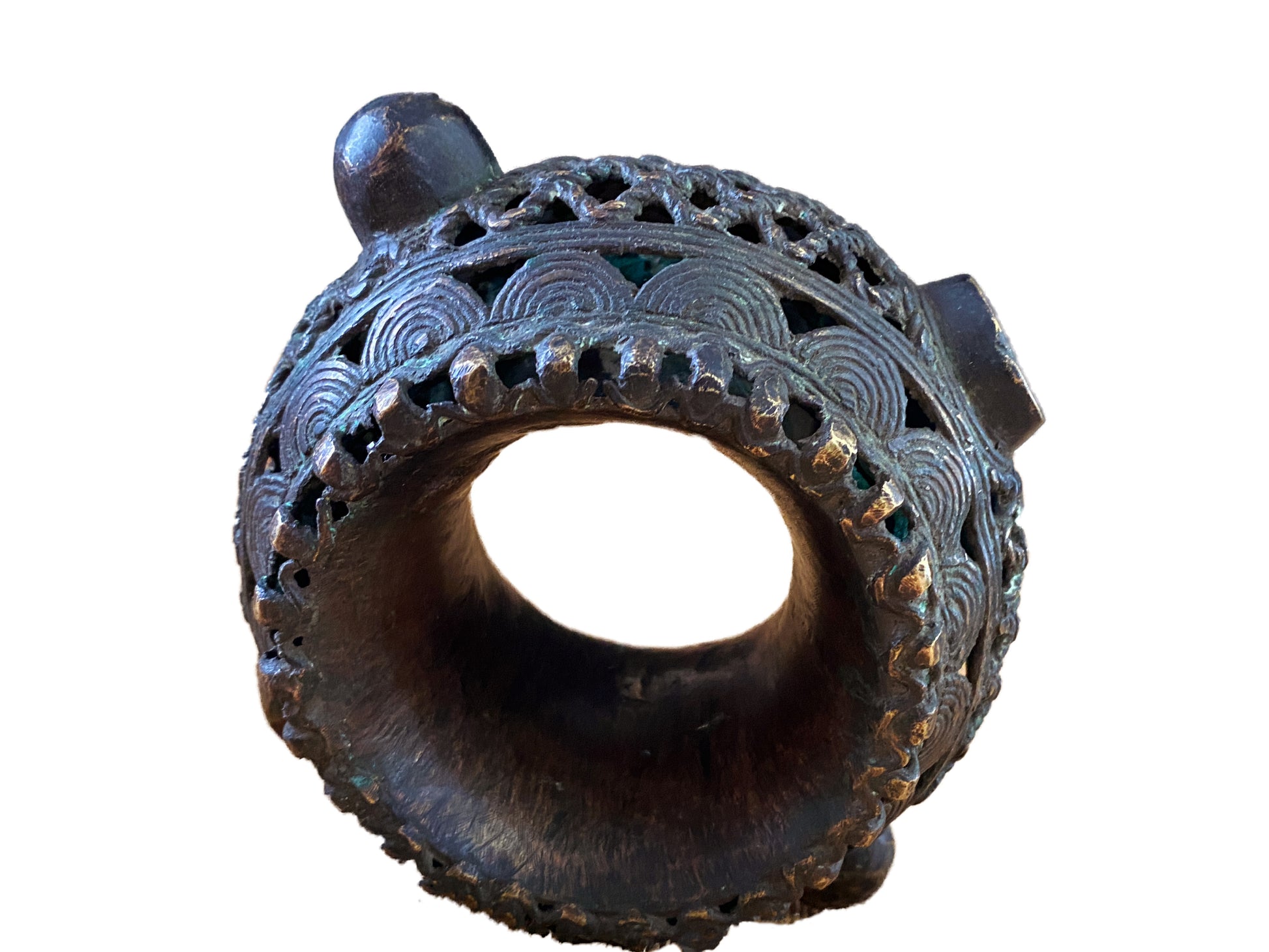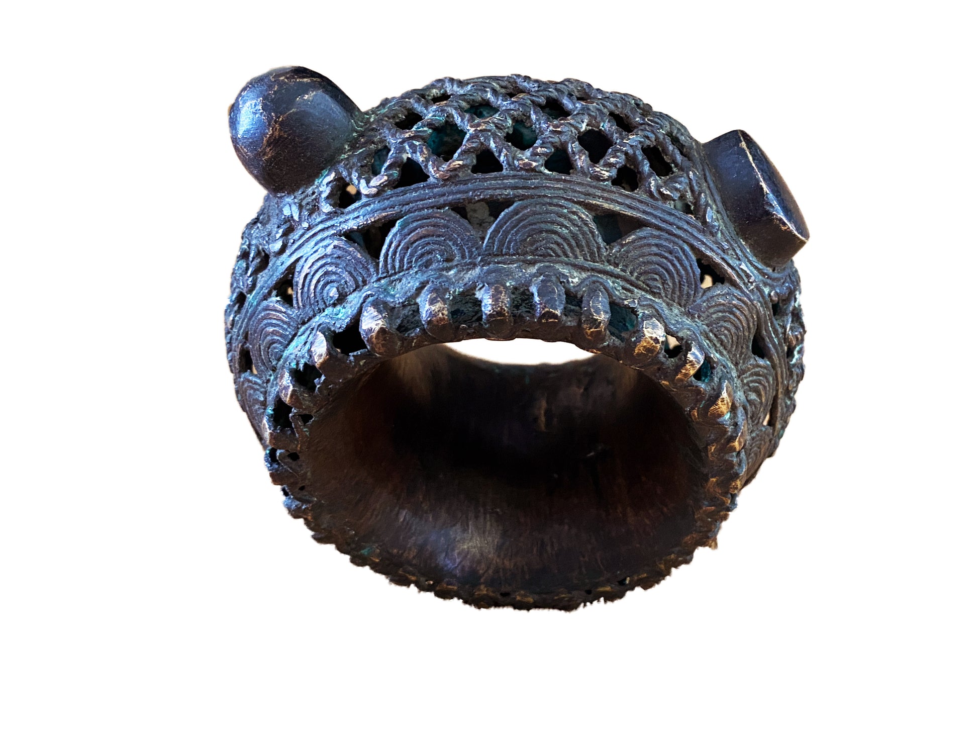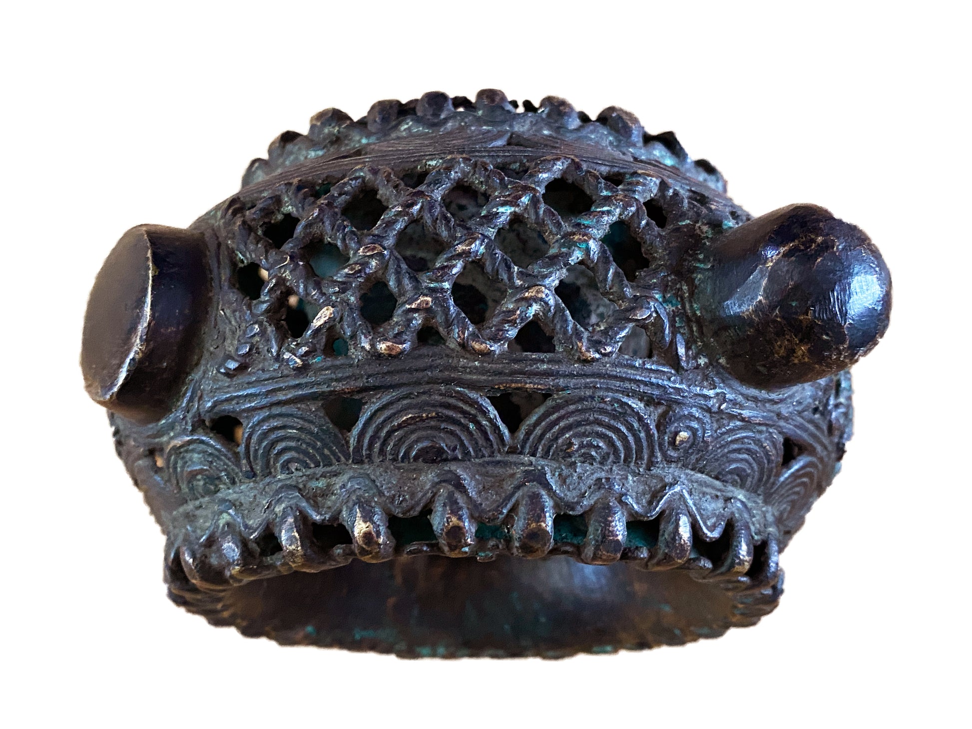African Benin Nigeria trade currency bronze bracelet, with amazing patina you can wear it or could be displayed as a beautiful metal sculpture. Pieces such as this are made in the lost wax process, where a mold is put over a wax original, the wax burned out, and the void replaced with molten metal. Each piece is unique Work.6.5" w by 5.5" d and 3.25" H