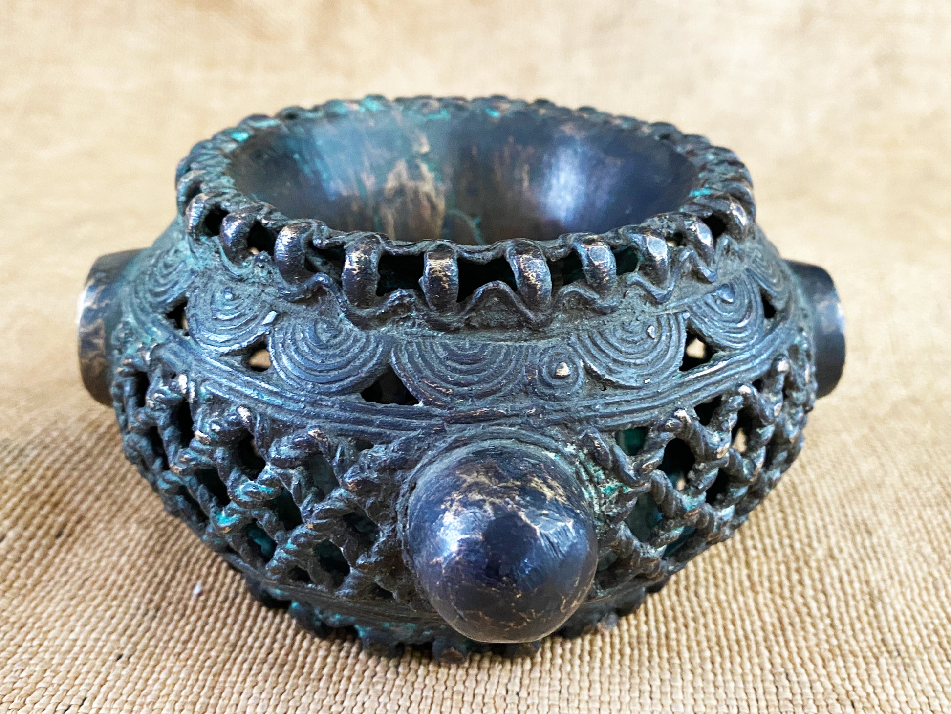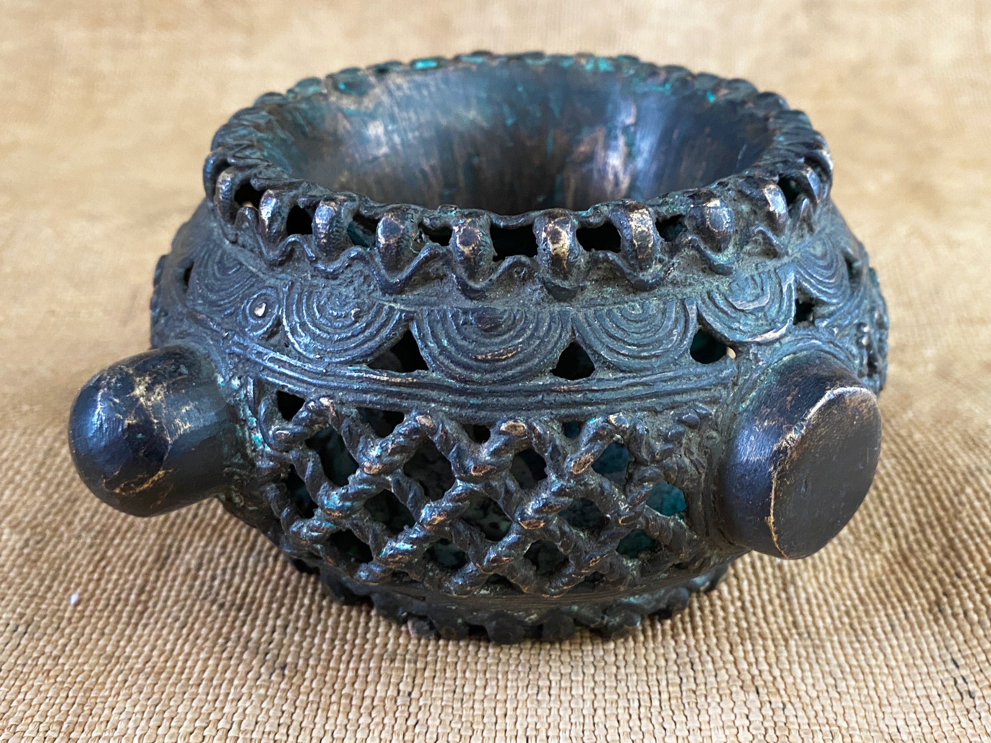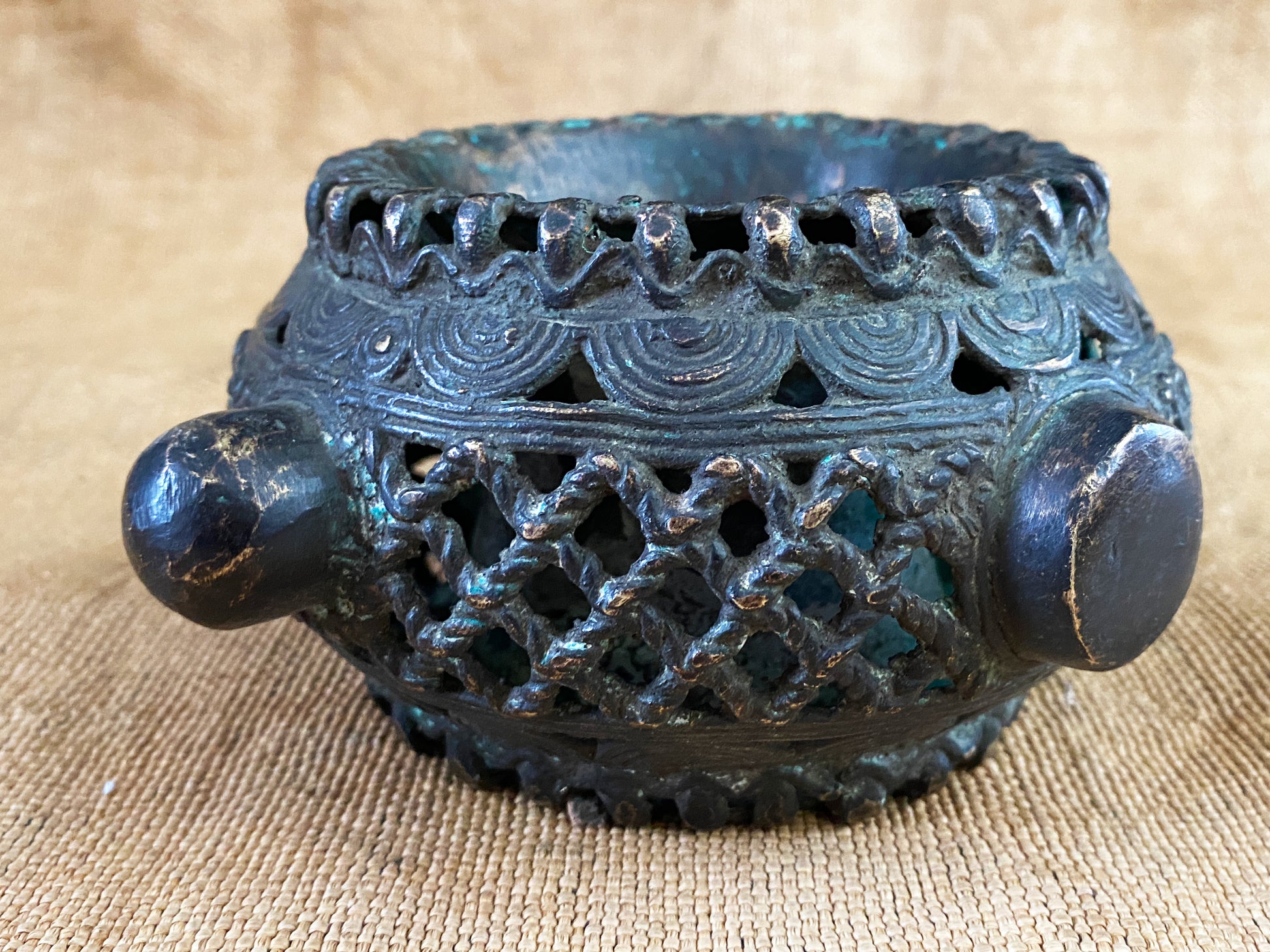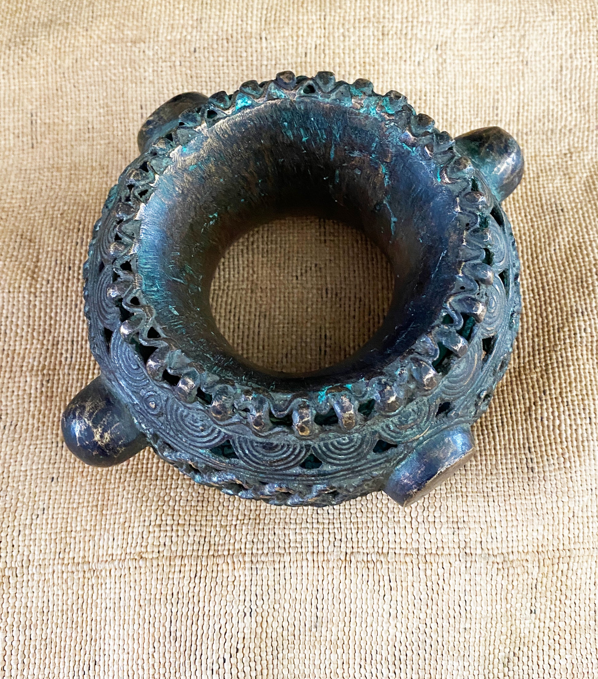 African Benin Nigeria trade currency bronze bracelet, with amazing patina you can wear it or could be displayed as a beautiful metal sculpture. Pieces such as this are made in the lost wax process, where a mold is put over a wax original, the wax burned out, and the void replaced with molten metal. Each piece is unique Work.6.5" w by 5.5" d and 3.25" H