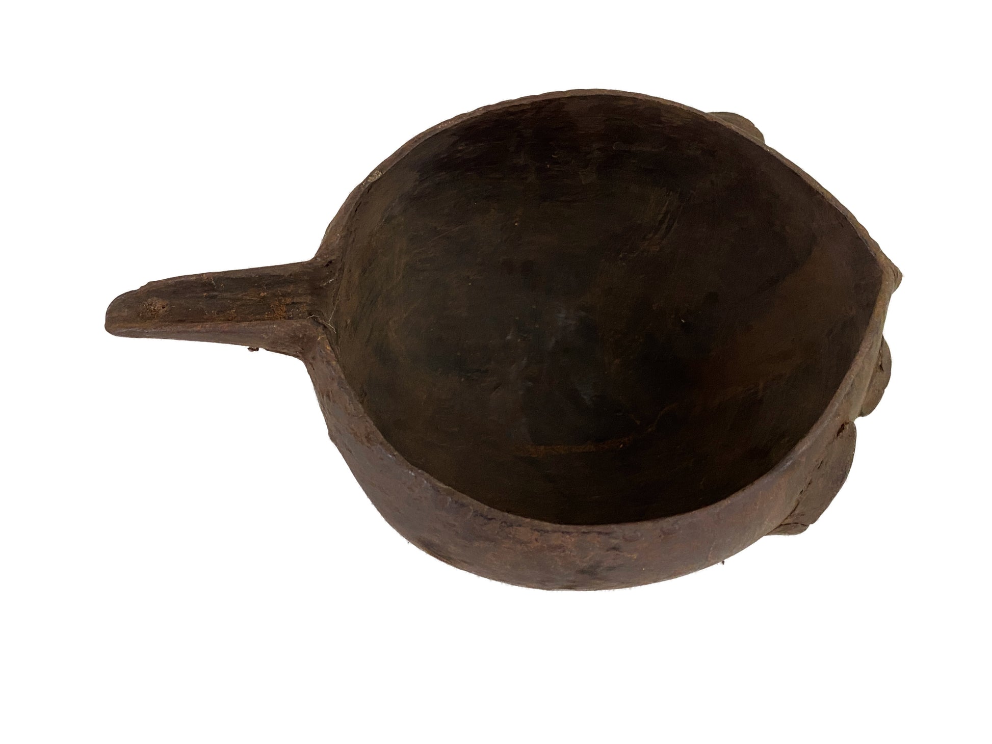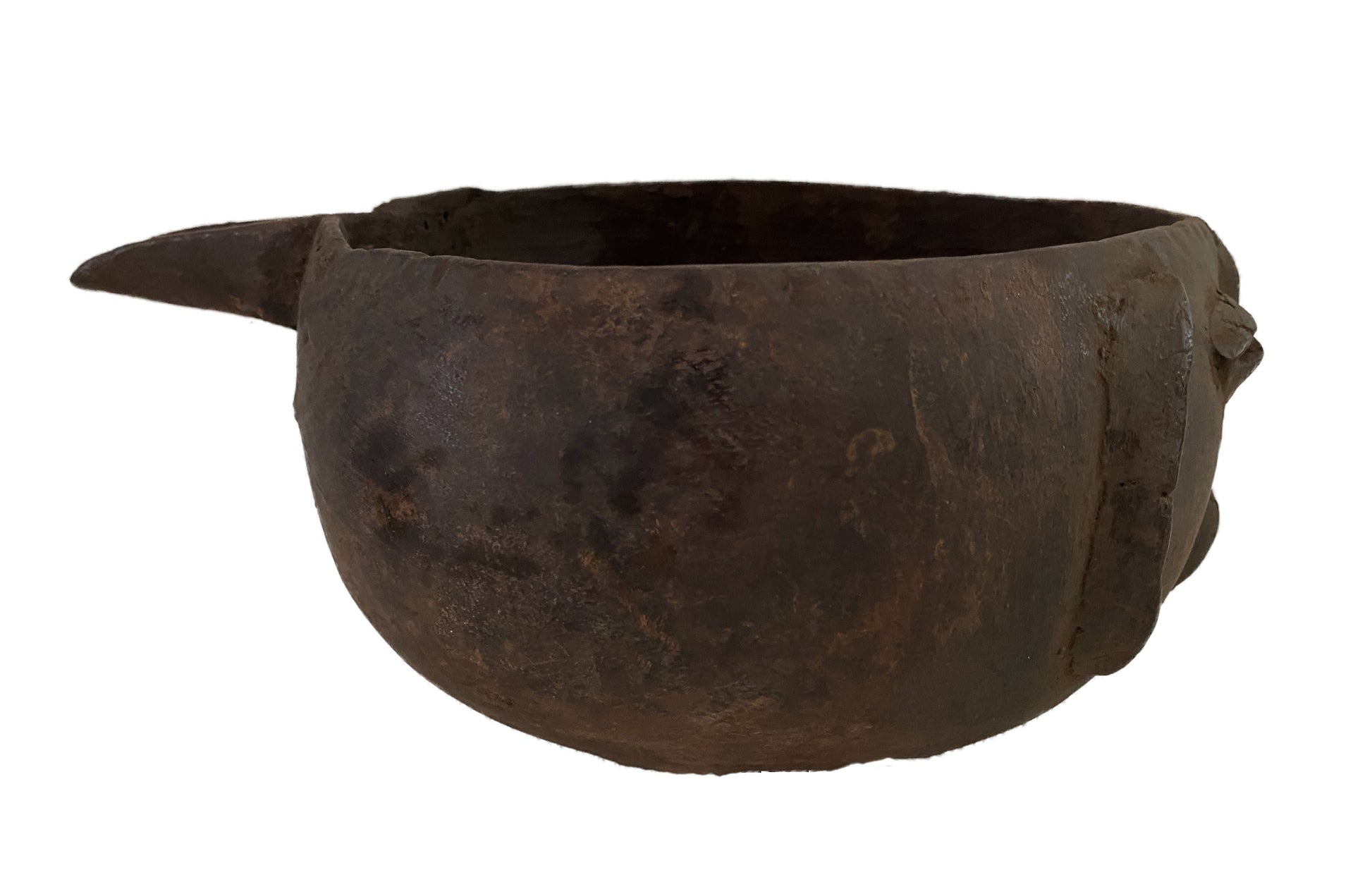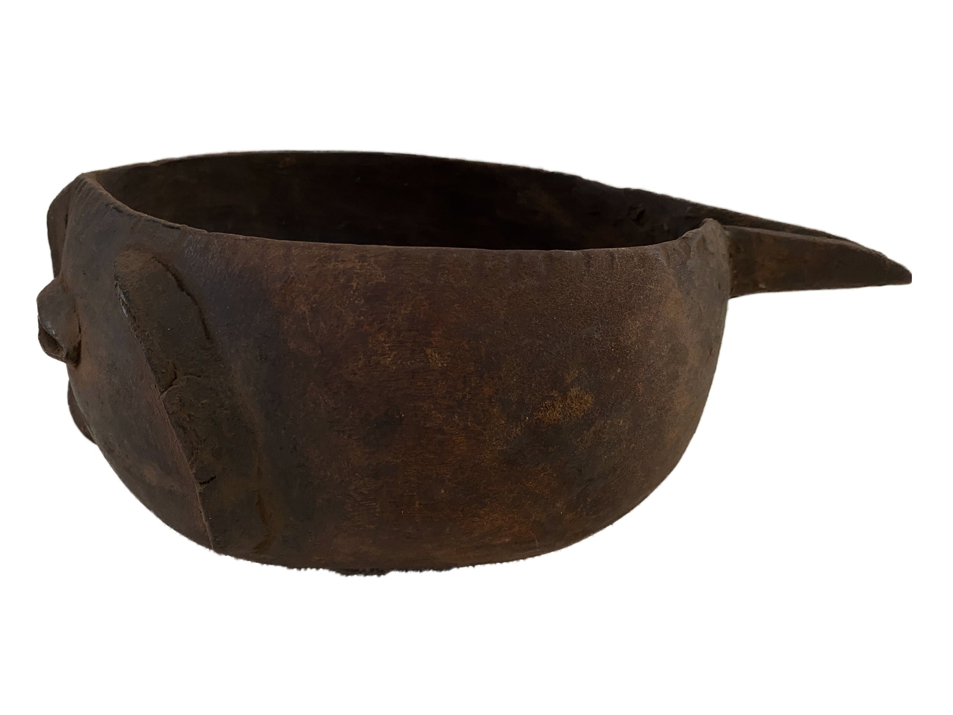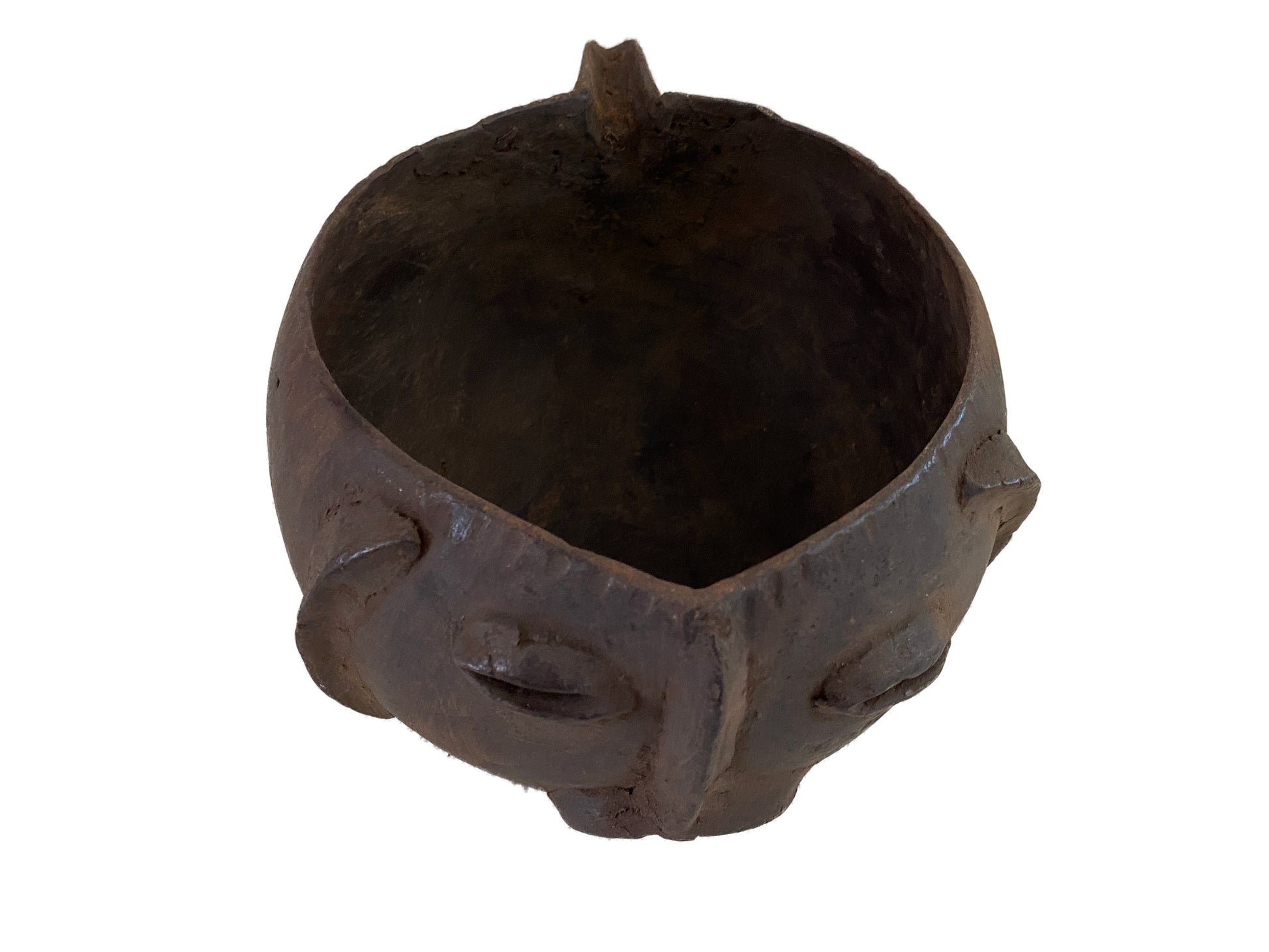 A well carved Kuba wooden cup in the form of a human head. Figural cups such as this cups are among the most popular artifacts found in the Kuba region in the savanna region of the southeastern part of Democratic Republic of the Congo. These cups may be seen as the consecration of decorative art among the Kuba. Kuba society is devoted to the visual: The art of decoration reigns supreme. Kuba art is prized both for the quality and care of their craftsmanship and for the astounding power of their design (Bwiin) which touched sensitivity of western collectors and artists. 4.75" H by 10.75" D by 7" W