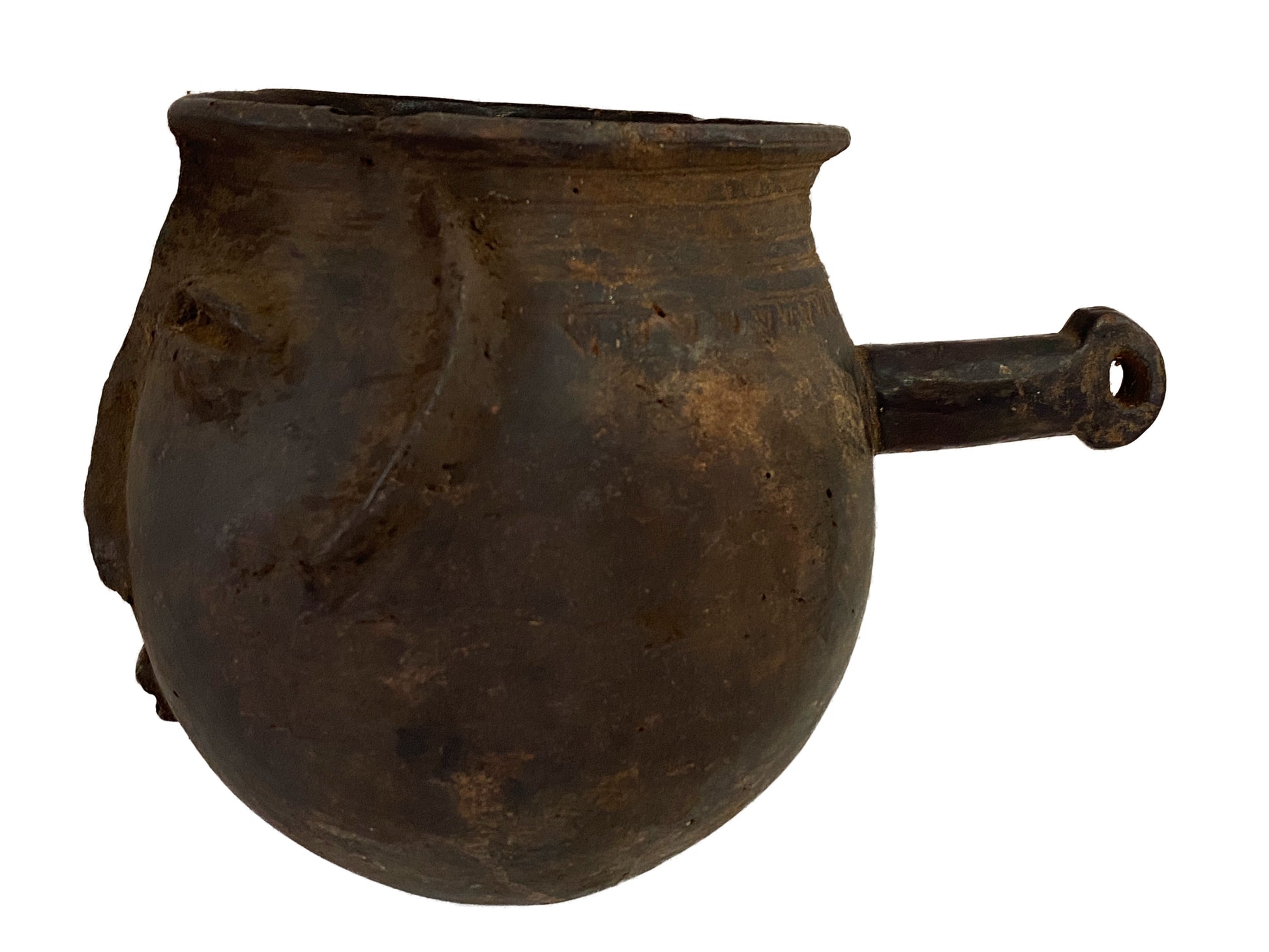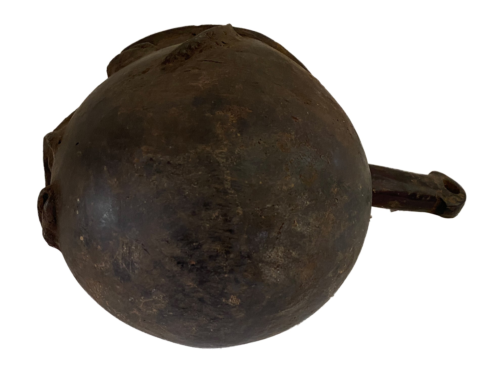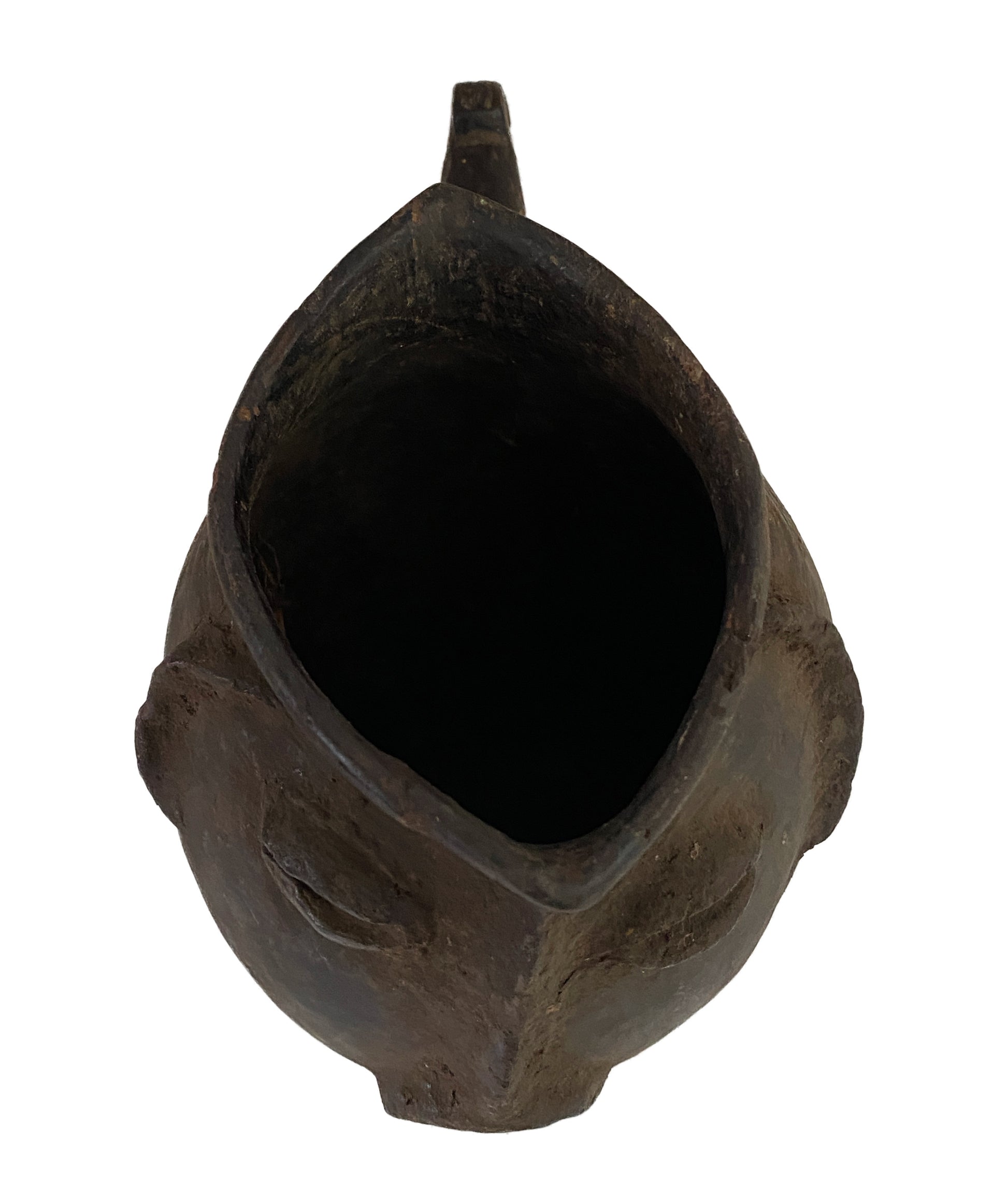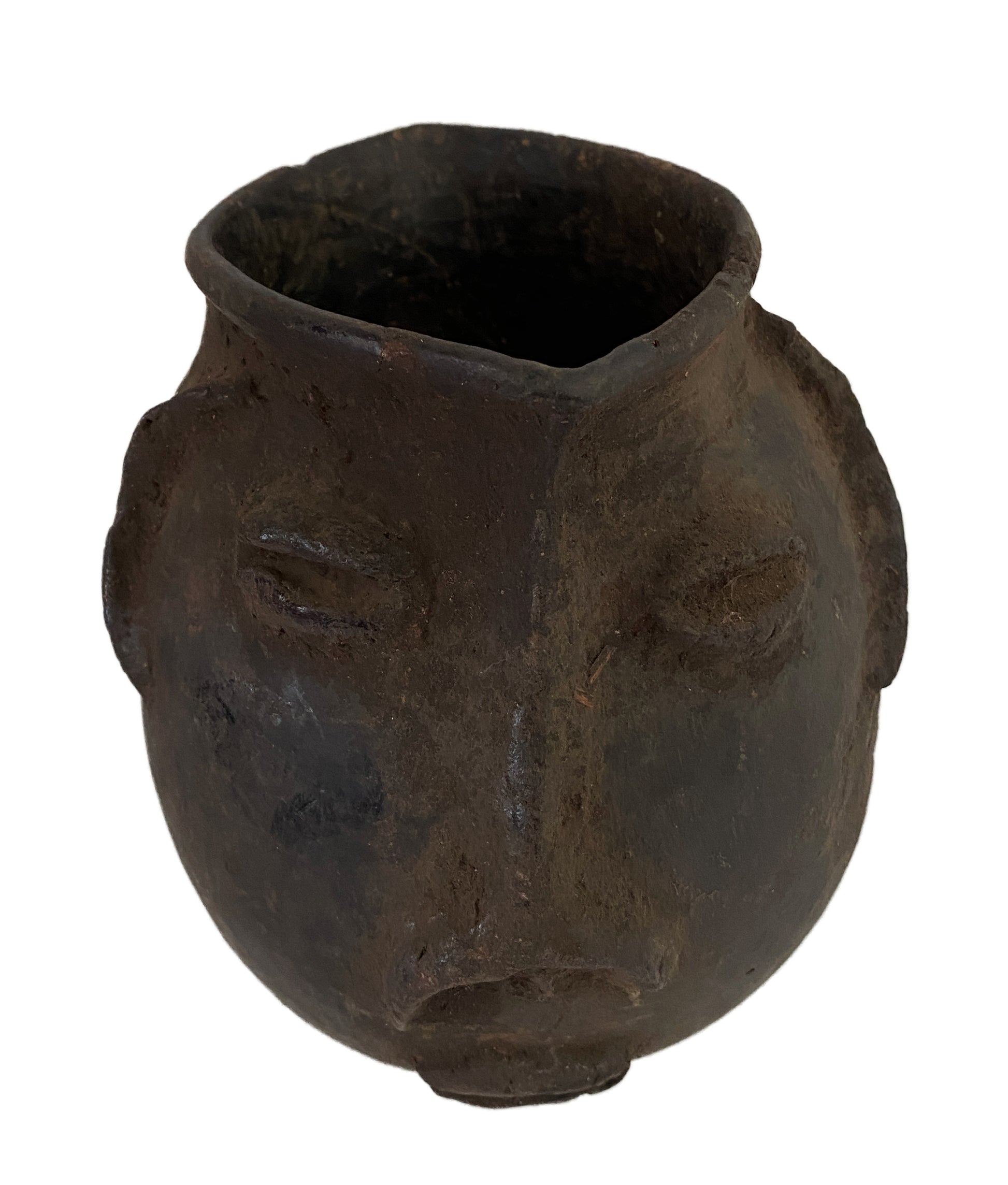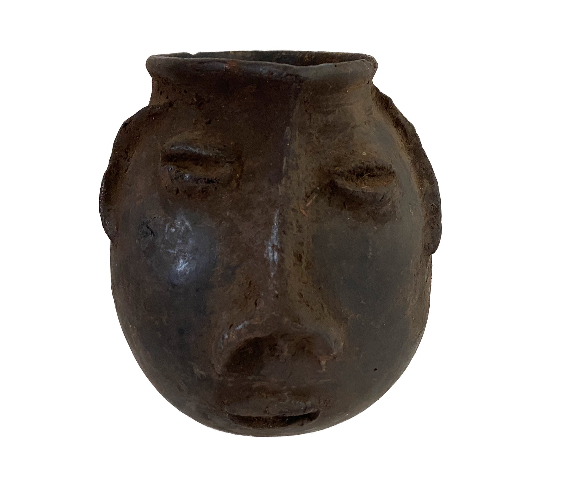 A well carved Kuba wooden cup in the form of a human head. Figural cups such as this cups are among the most popular artifacts found in the Kuba region in the savanna region of the southeastern part of Democratic Republic of the Congo. These cups may be seen as the consecration of decorative art among the Kuba. Kuba society is devoted to the visual: The art of decoration reigns supreme. Kuba art is prized both for the quality and care of their craftsmanship and for the astounding power of their design (Bwiin) which touched sensitivity of western collectors and artists. 6" H by 8.5" D by 5" W
