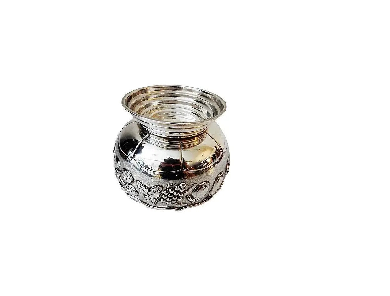 This outstanding solid silver bowl showcases detailed repoussé hand chasing and bears a 900 mark on its base. It weighs 544 grams (1.199 lbs) and measures 8.5" wide by 5.25" high. Though it has a small dent from wear and time, the piece is still in very good overall condition.