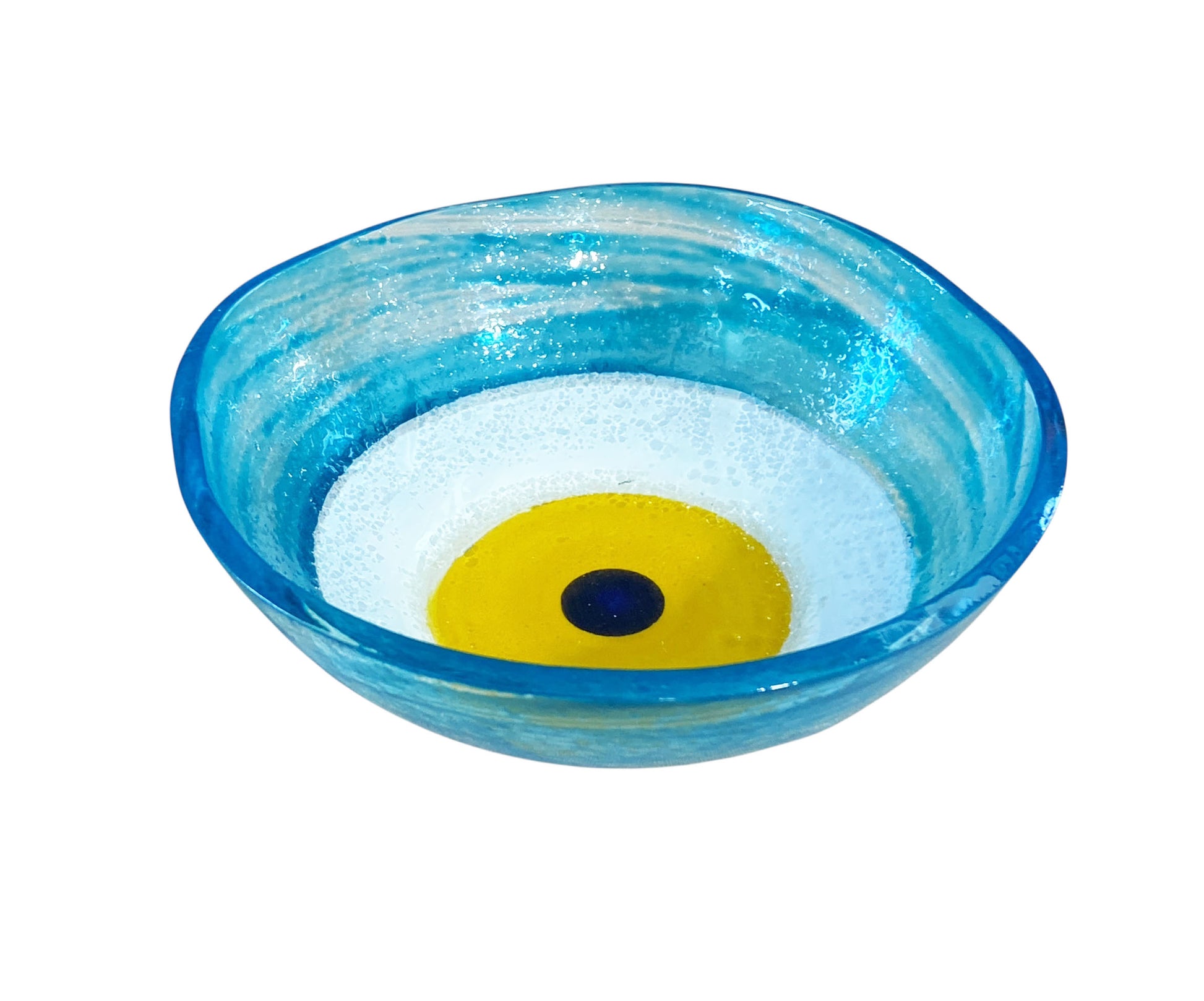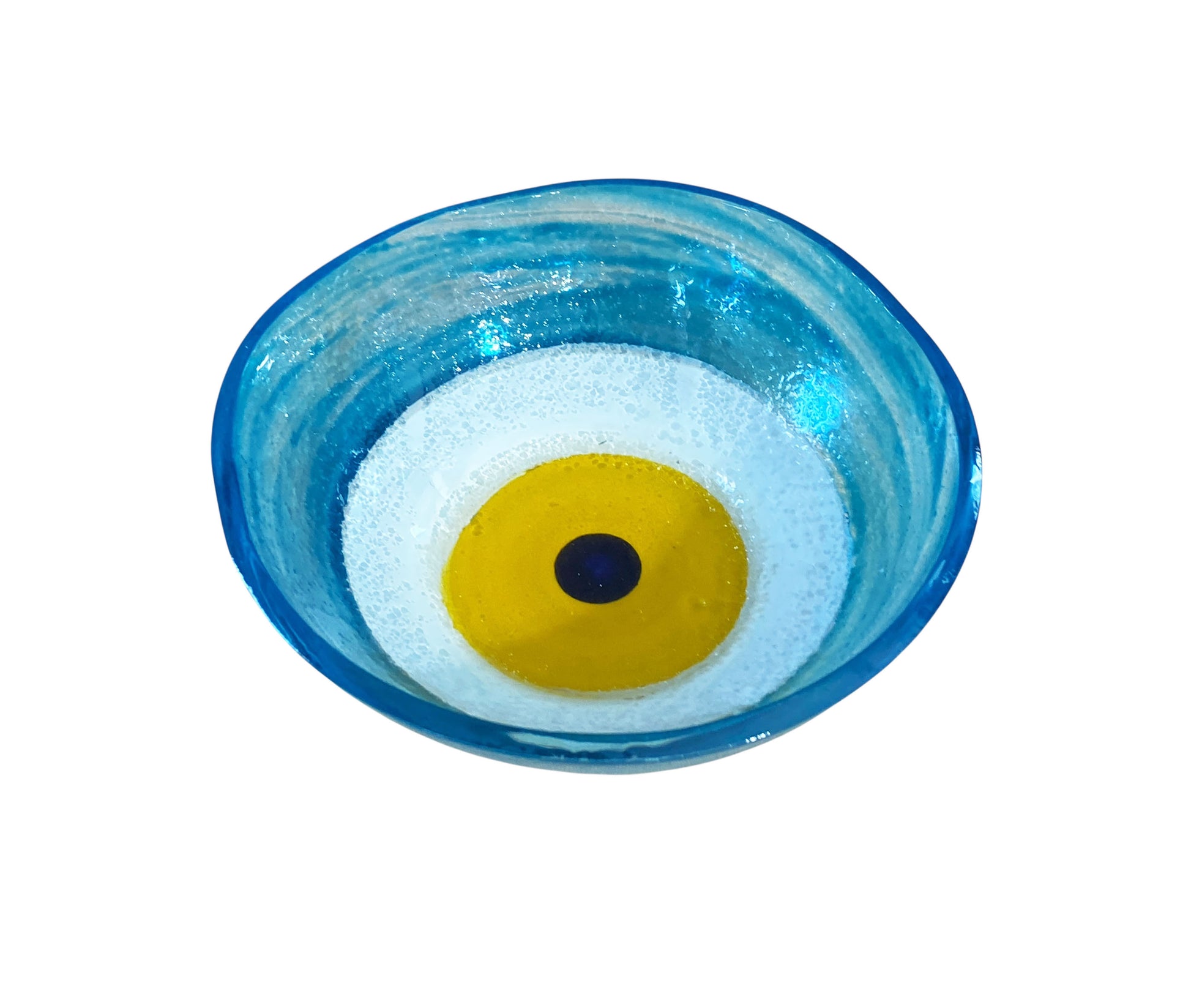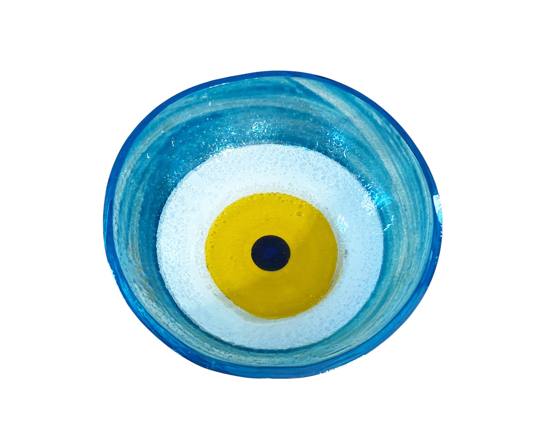 This exquisite Middle Eastern turquoise glass bowl features a glazed good luck eye at the center, an ancient symbol of protection. Measures 1.75" in height and 4.75" in diameter, making it perfect for serving appetizers, decorative use, or as thoughtful gifts.