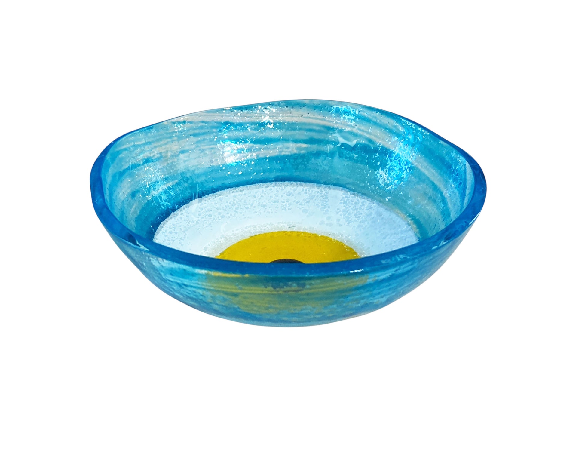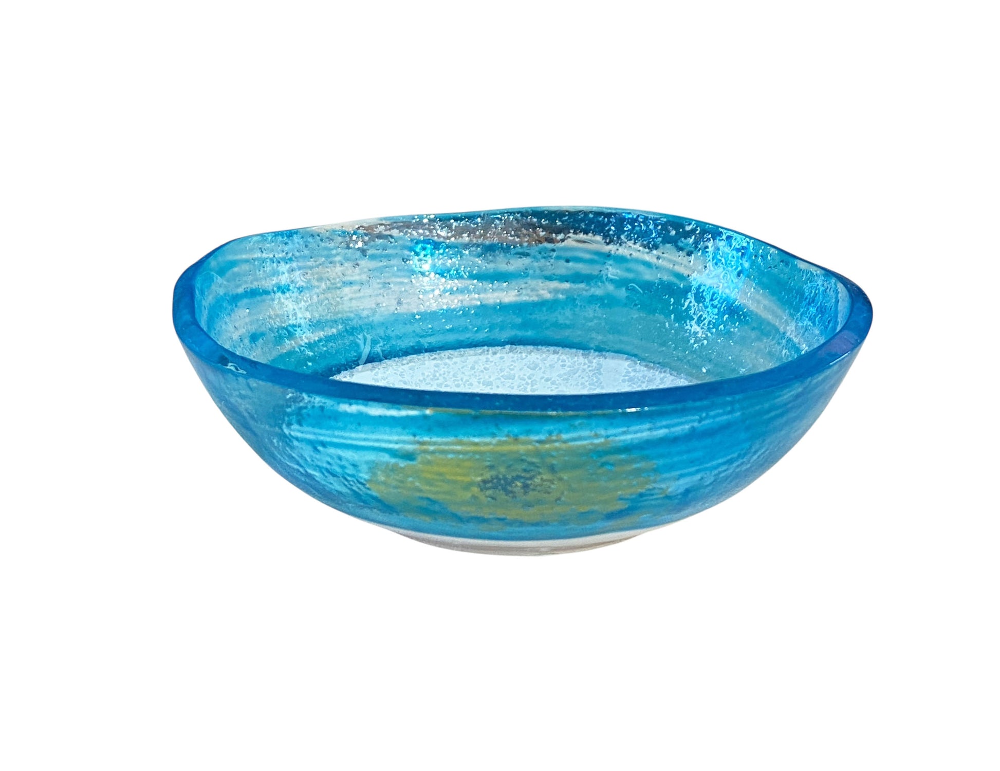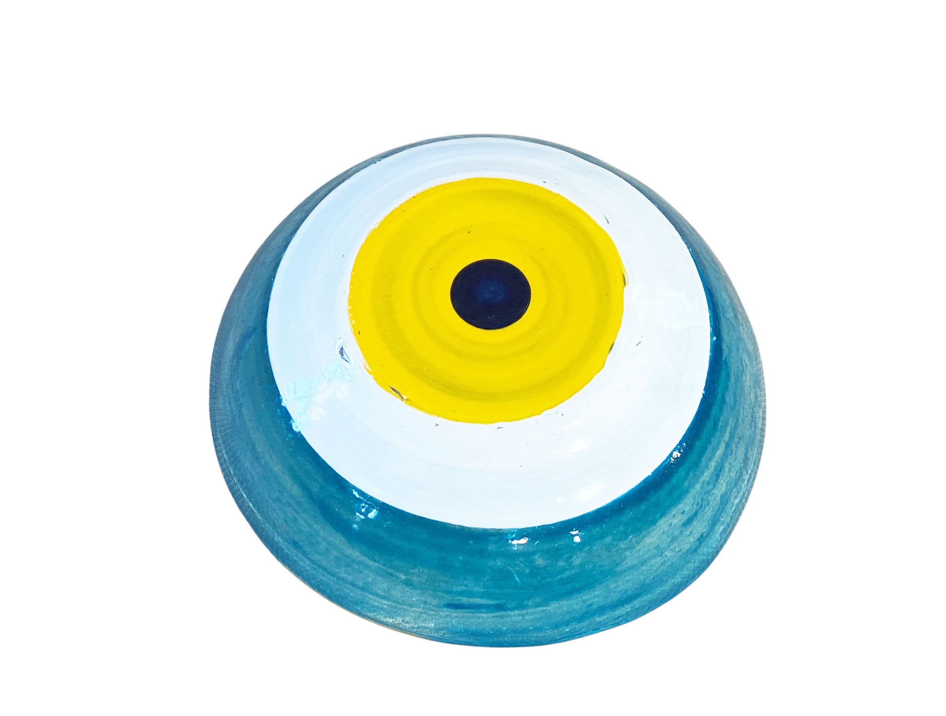 This exquisite Middle Eastern turquoise glass bowl features a glazed good luck eye at the center, an ancient symbol of protection. Measures 1.75" in height and 4.75" in diameter, making it perfect for serving appetizers, decorative use, or as thoughtful gifts.