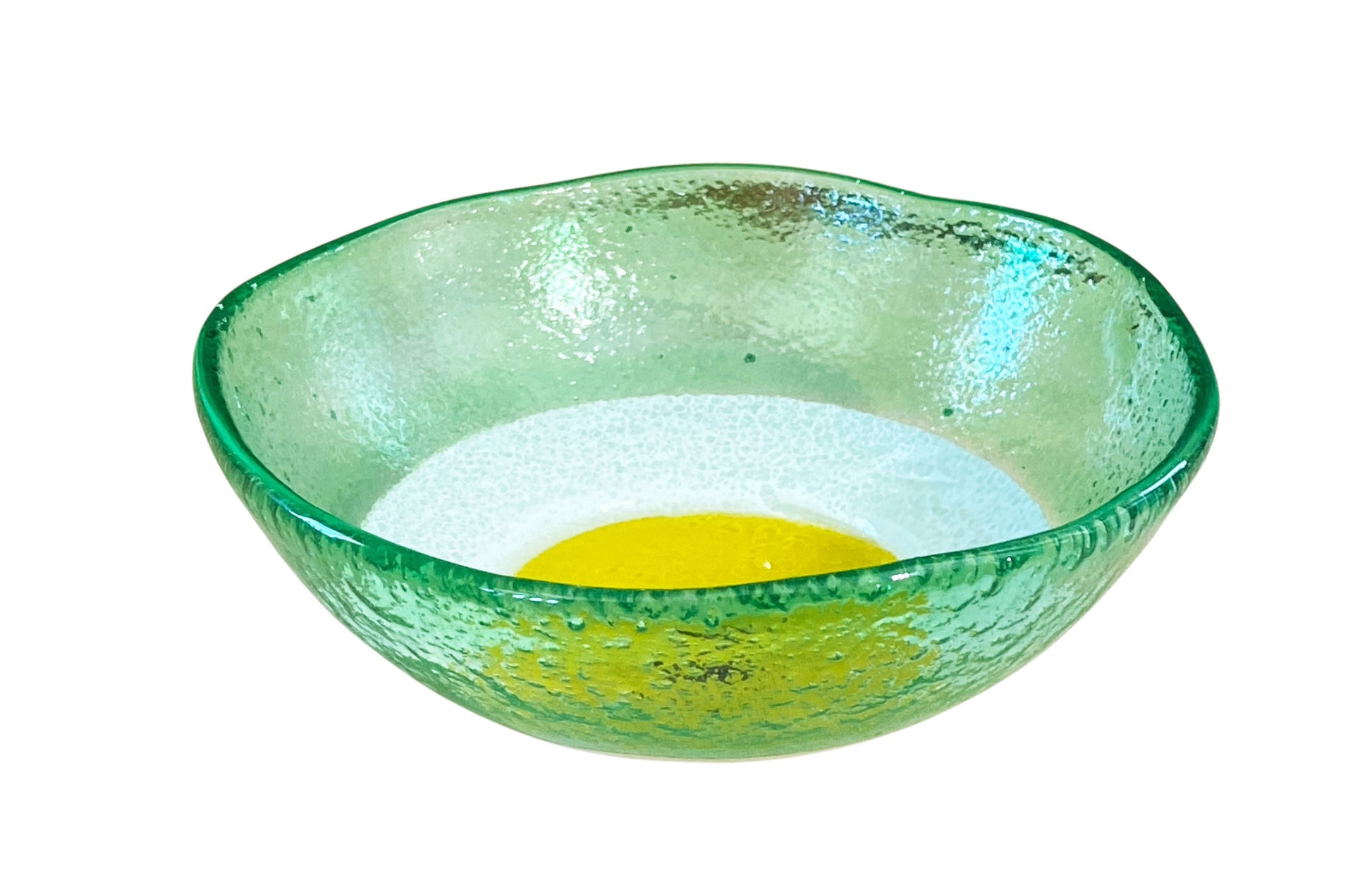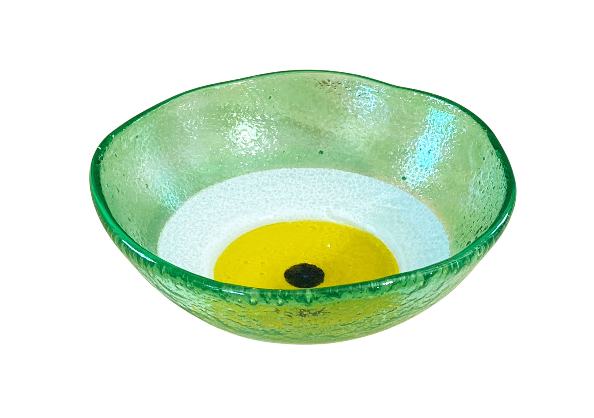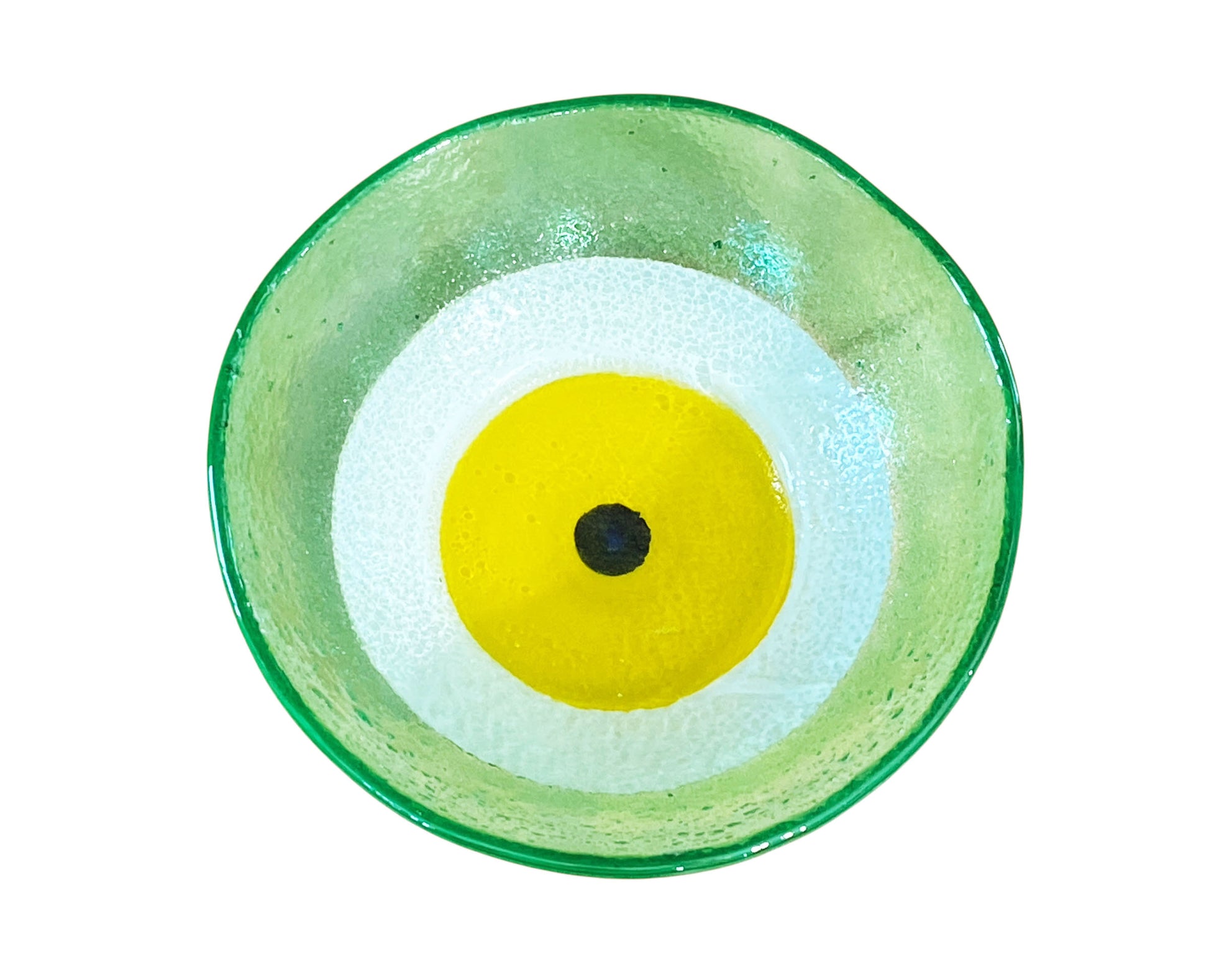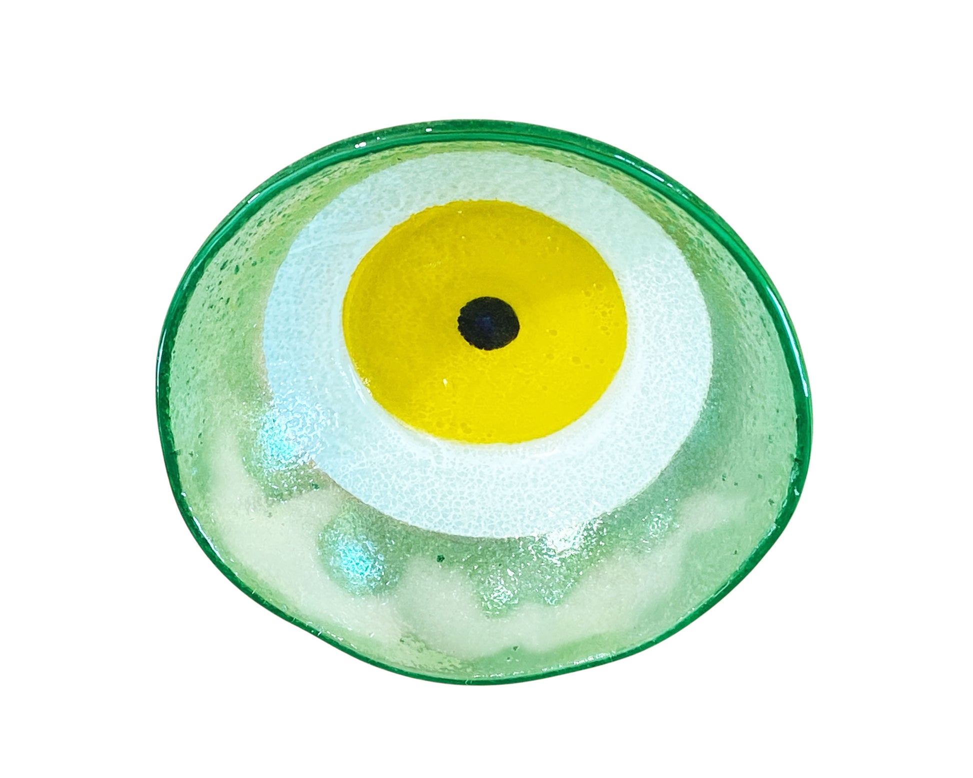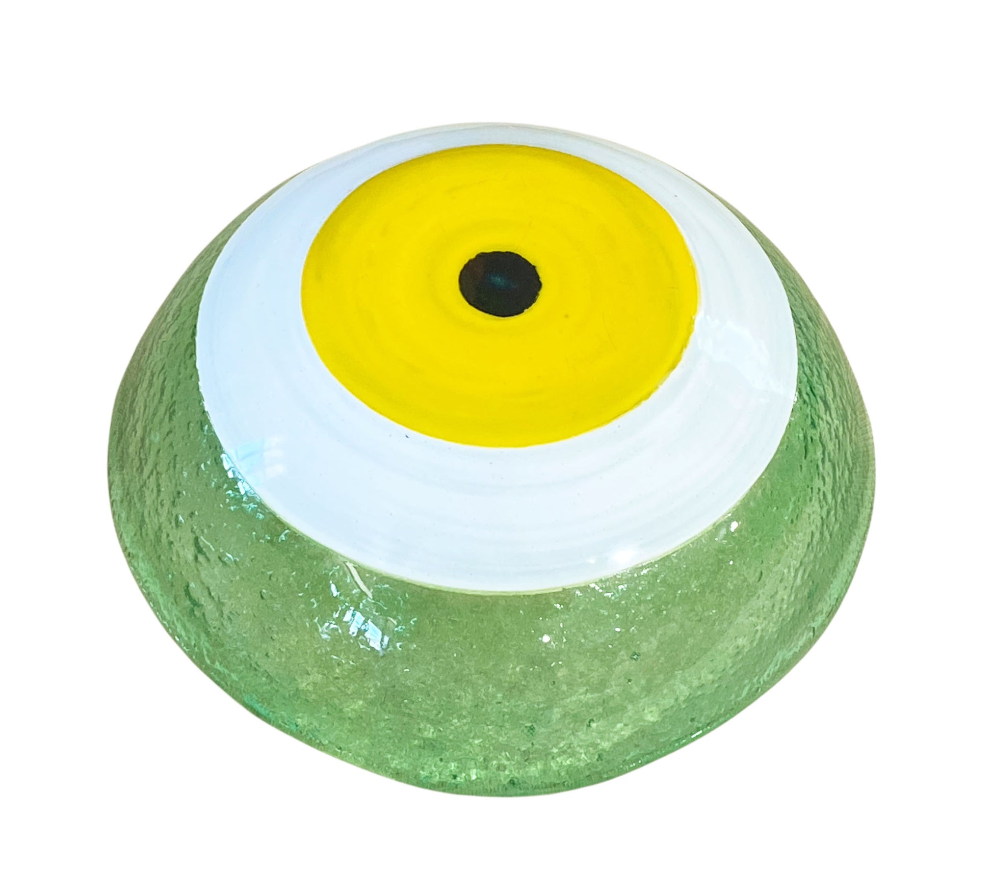 This finely hand made Middle Eastern green glass bowl showcases a glazed good luck eye at its center, an ancient emblem of protection. Measuring 2" in height and 5.75" in diameter, it is ideal for serving appetizers, enhancing décor, or presenting as a meaningful gift.