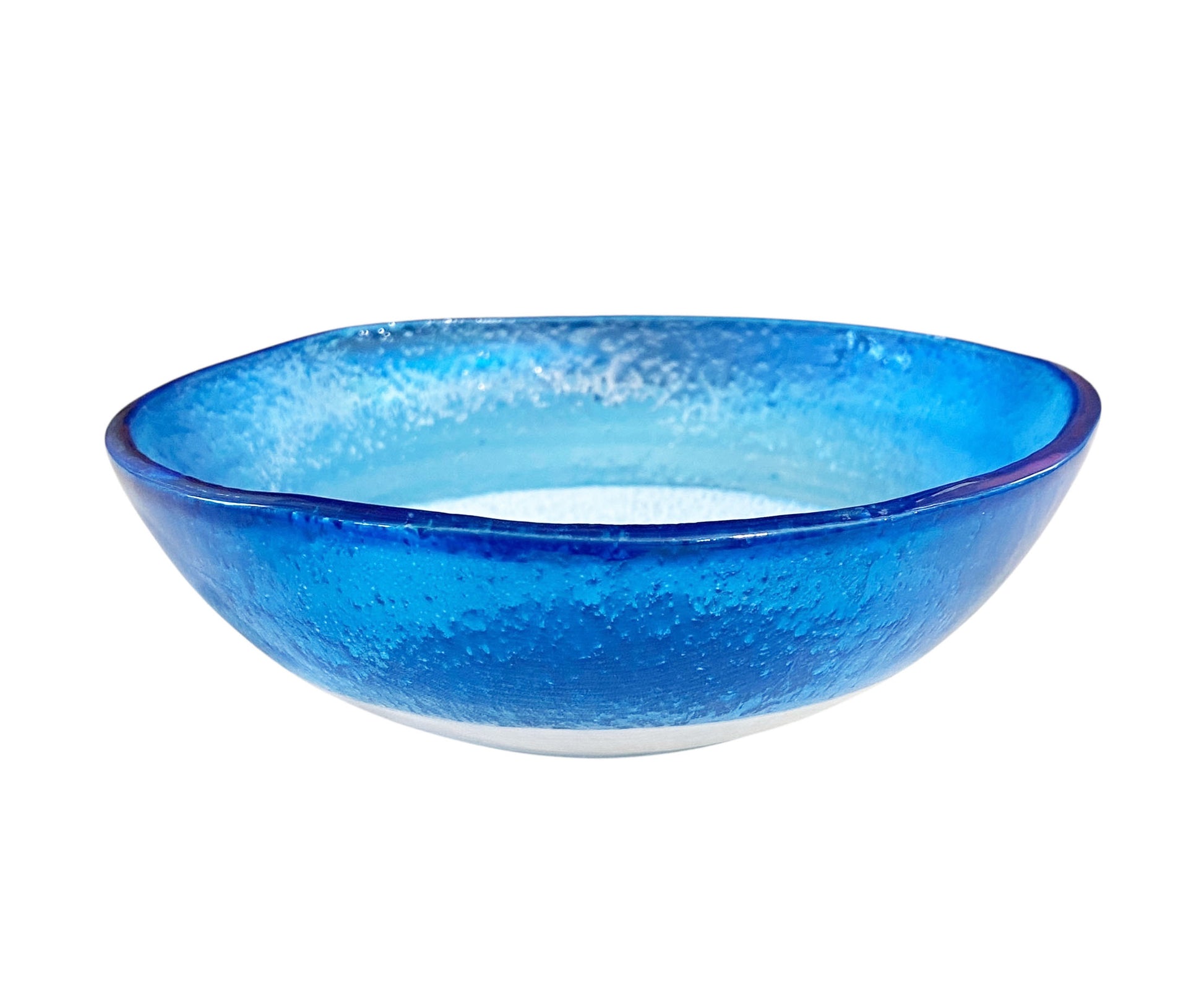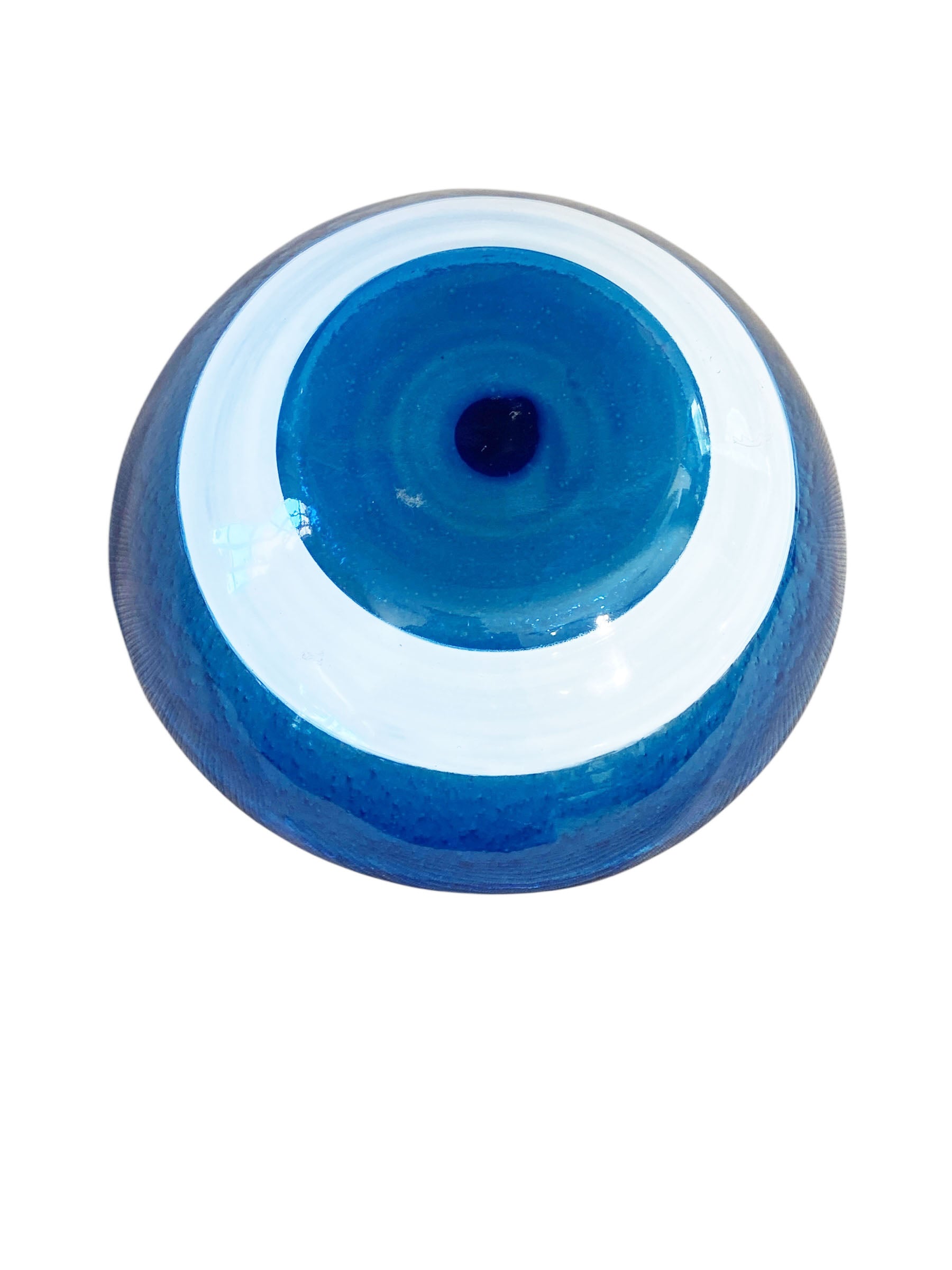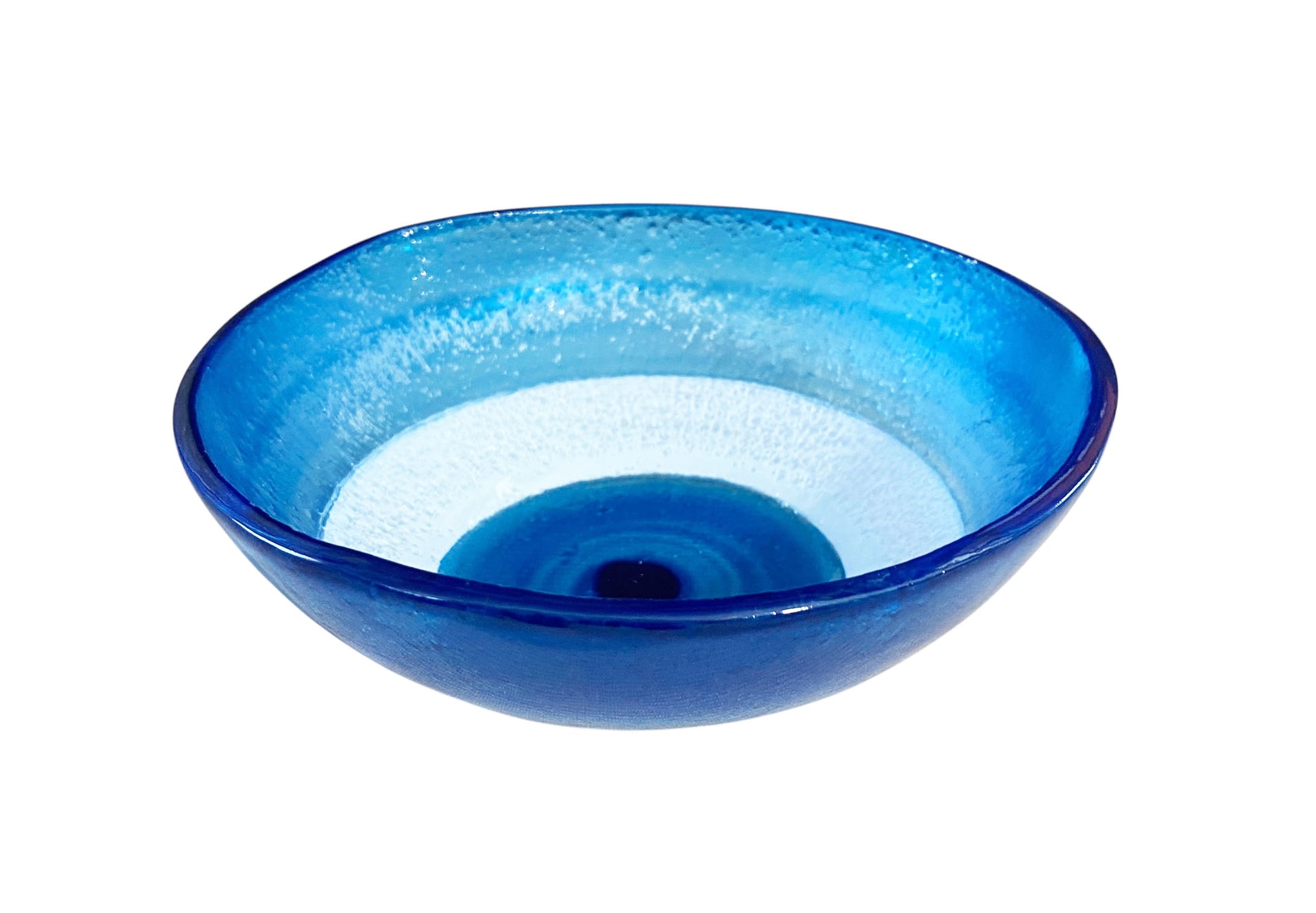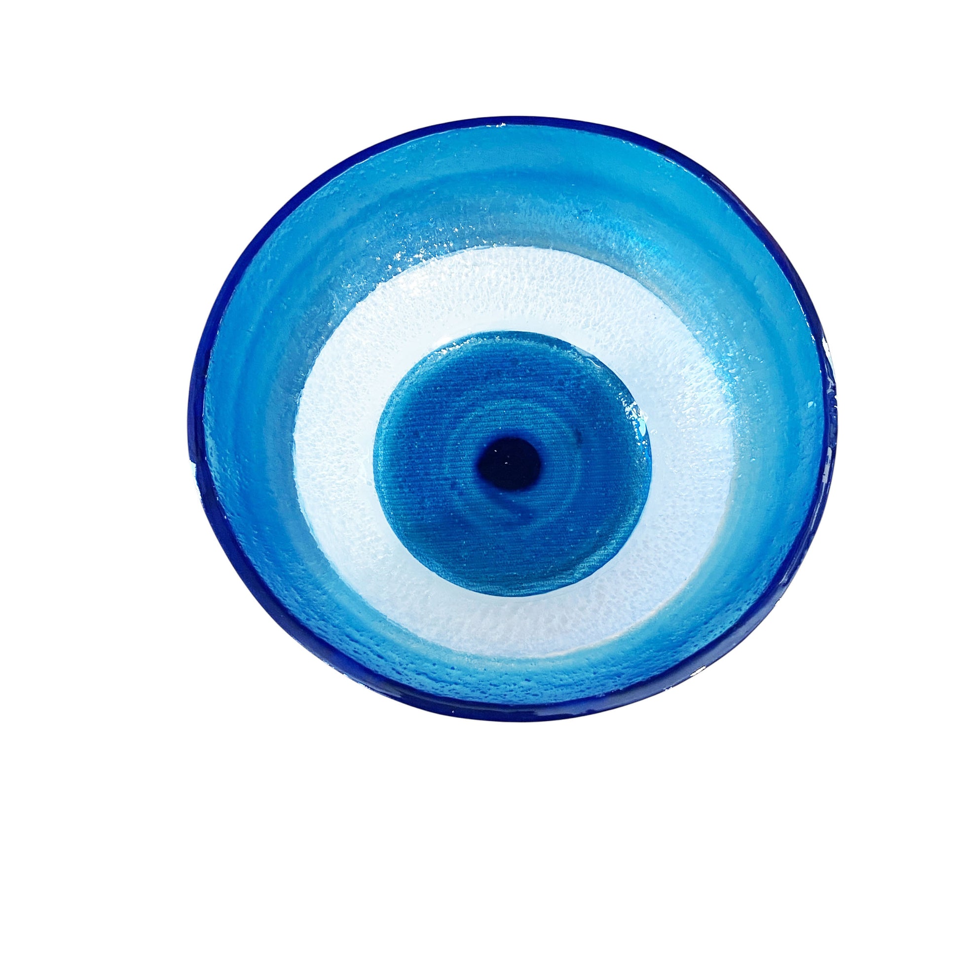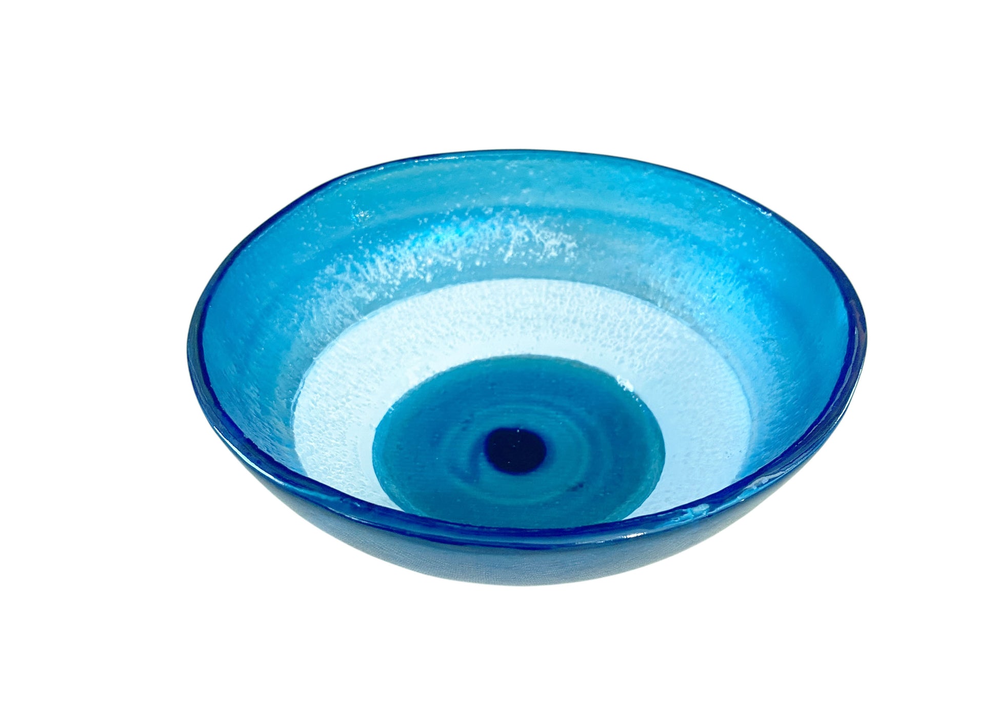 This exceptional hand made Middle Eastern blue glass bowl features a glazed good luck eye at its center, a timeless symbol of protection. With dimensions of 2" height and 5.75" diameter, it is perfect for serving appetizers, decorating spaces, or gifting.