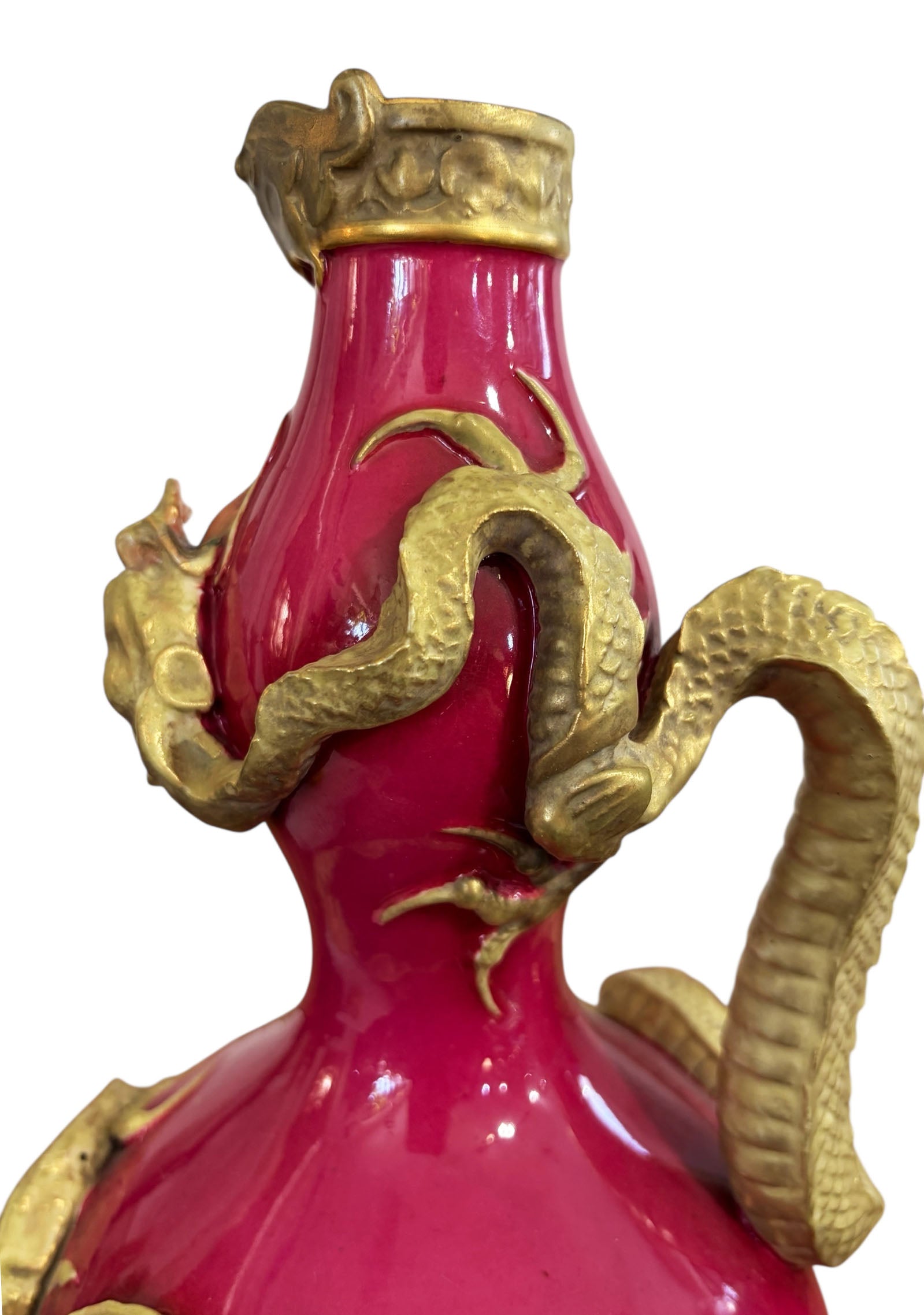 Superb and Rare 19th-century Royal Worcester porcelain dragon ewer with pink ground and gilt figural dragon decoration base. Royal Worcester mark and "patent Metallic" stamp. Old repair to spout, minor scattered rubbing/losses to glaze overall good condition Stand Not included in the sale Thanks