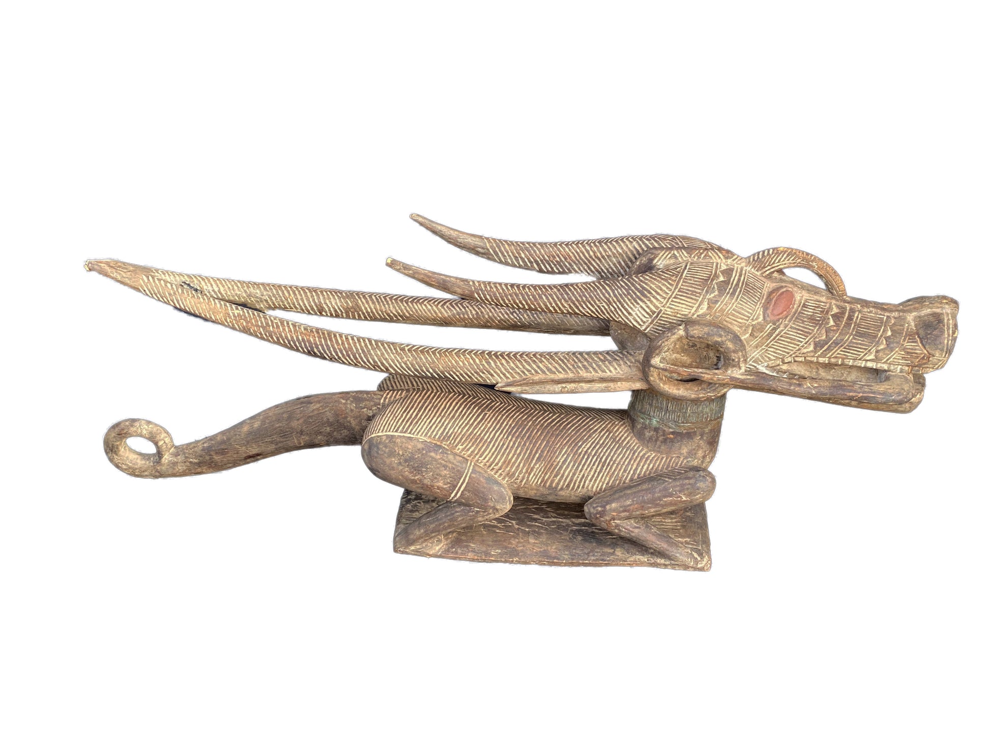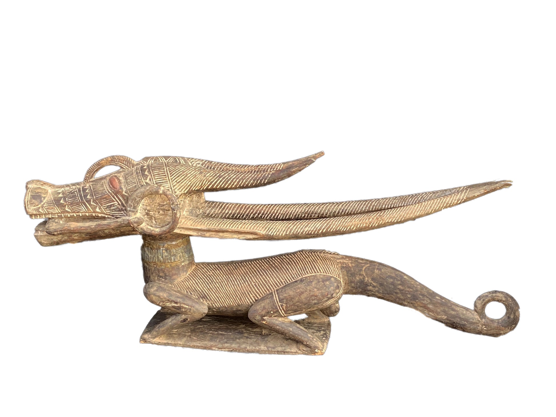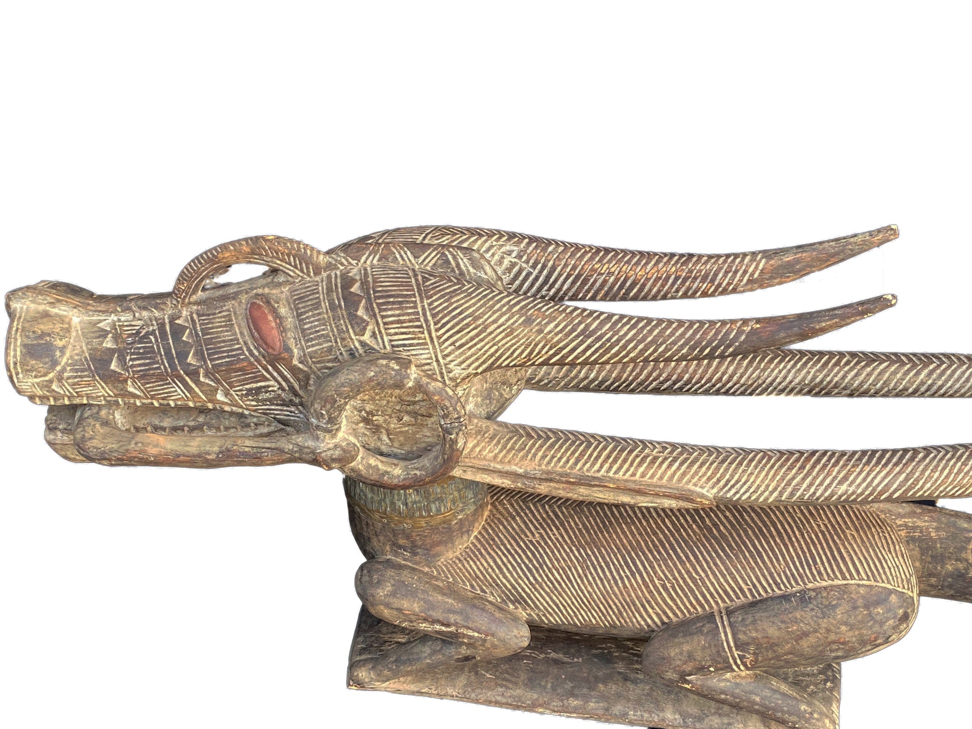 This extraordinary and massive Chiwara (antelope) sculpture has been impeccably carved from a single piece of wood. Historically, the Bambara people of Mali used this piece in initiation rituals associated with their agricultural society. Dimensions: 56"W x 23.5"H x 10"D.