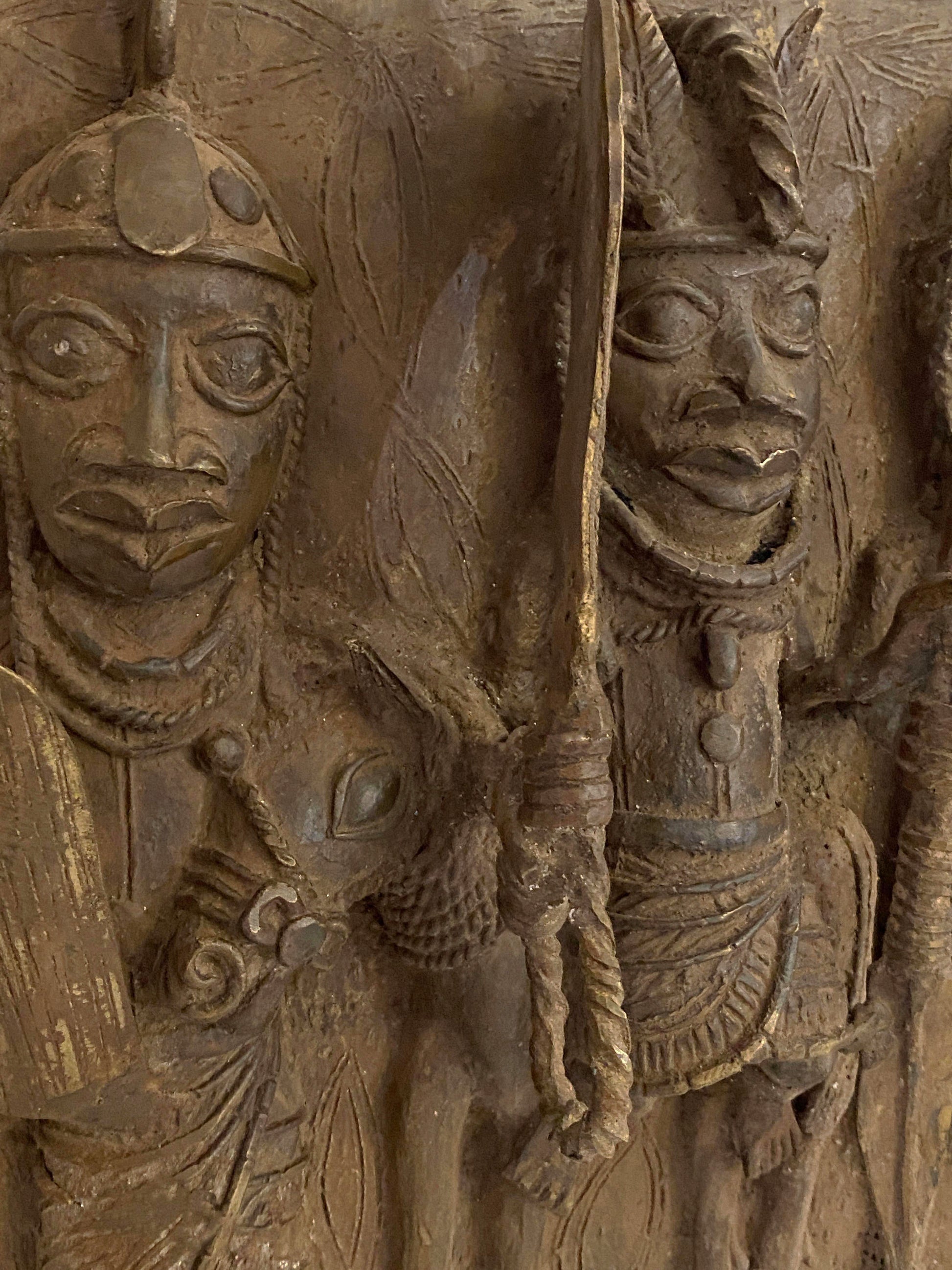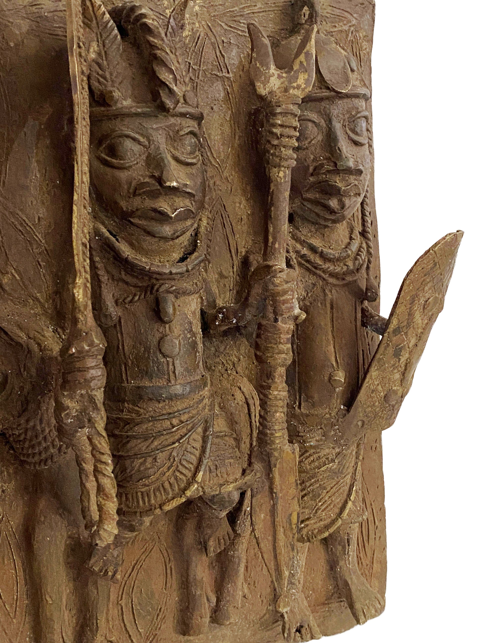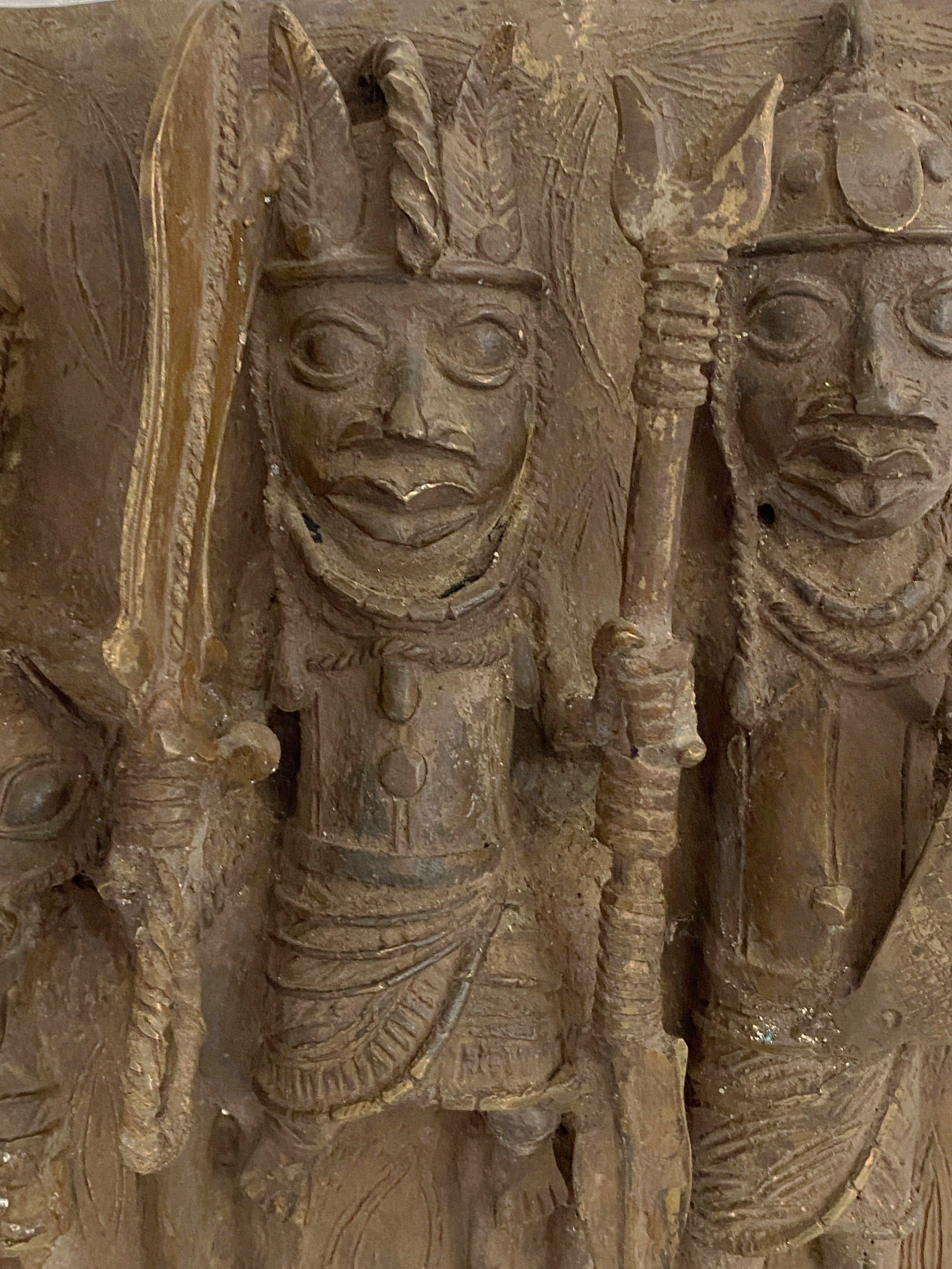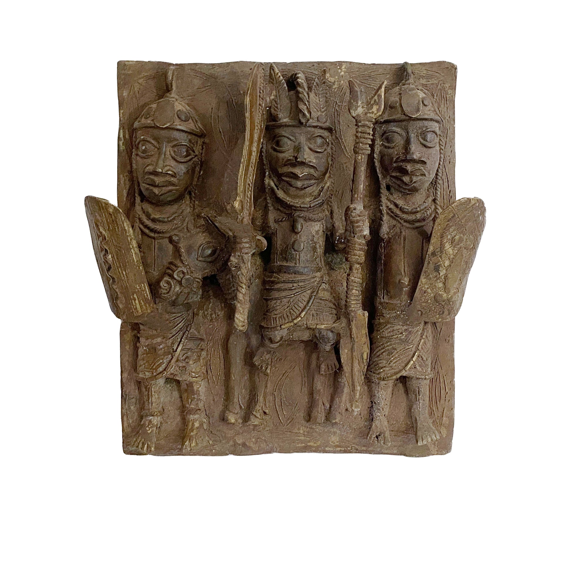 This 12.5"w x 13.25" H 3" D bronze plaque showcases the king warrior and soldiers of Benin, created using the lost wax method. Each piece is unique as the mold for it is destroyed after casting. Originally designed to adorn palaces, Benin bronze plaques often feature depictions of royalty, military figures, and animals in a variety of shapes and sizes.